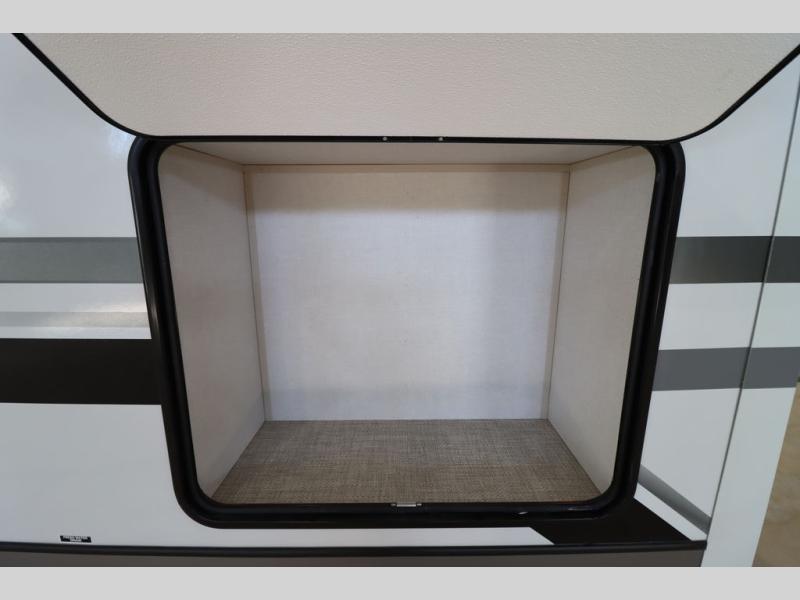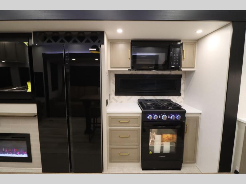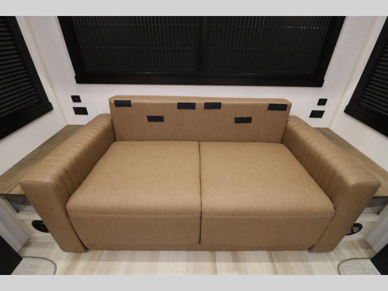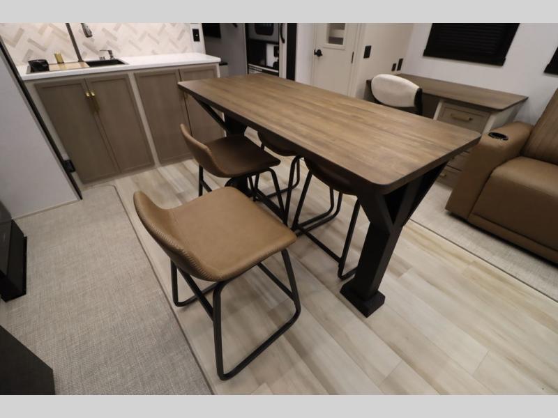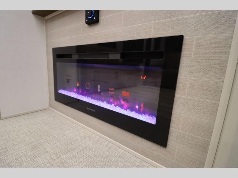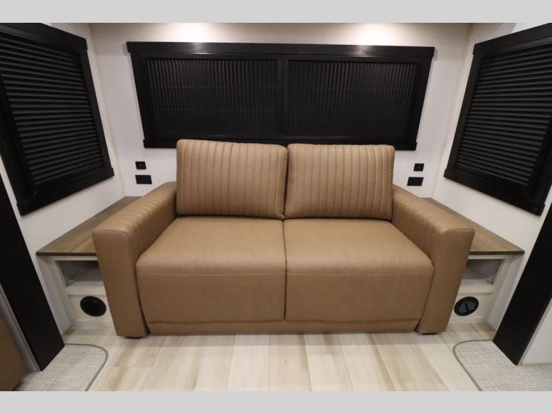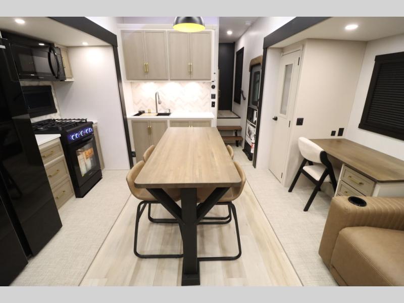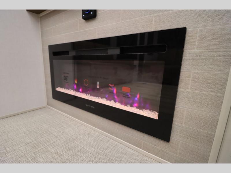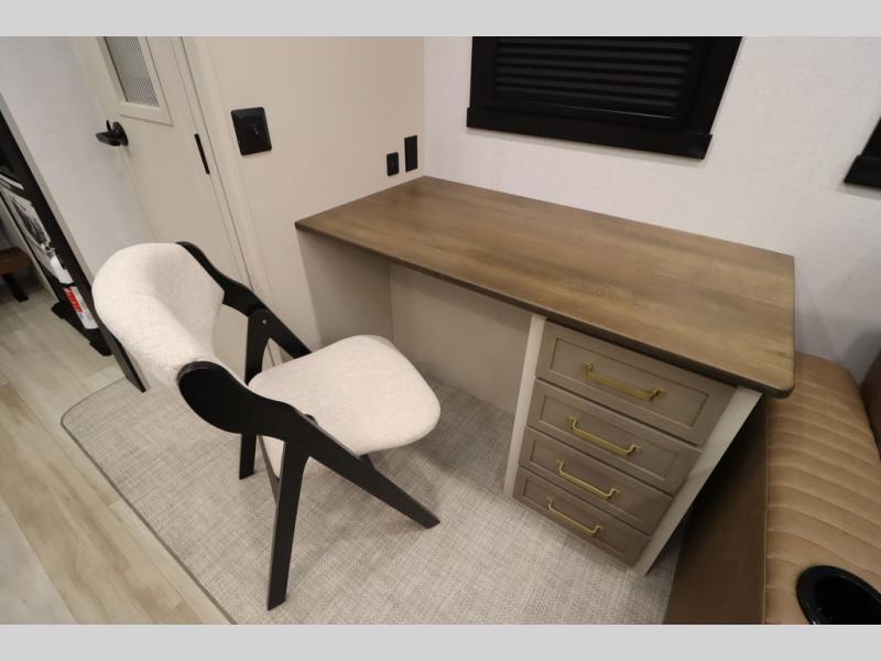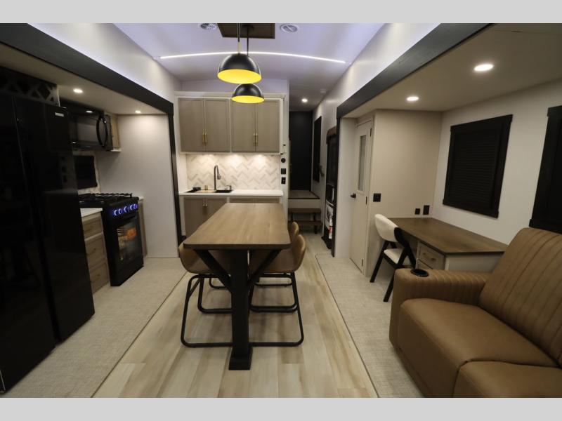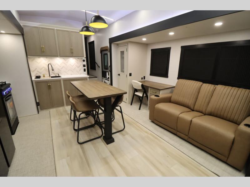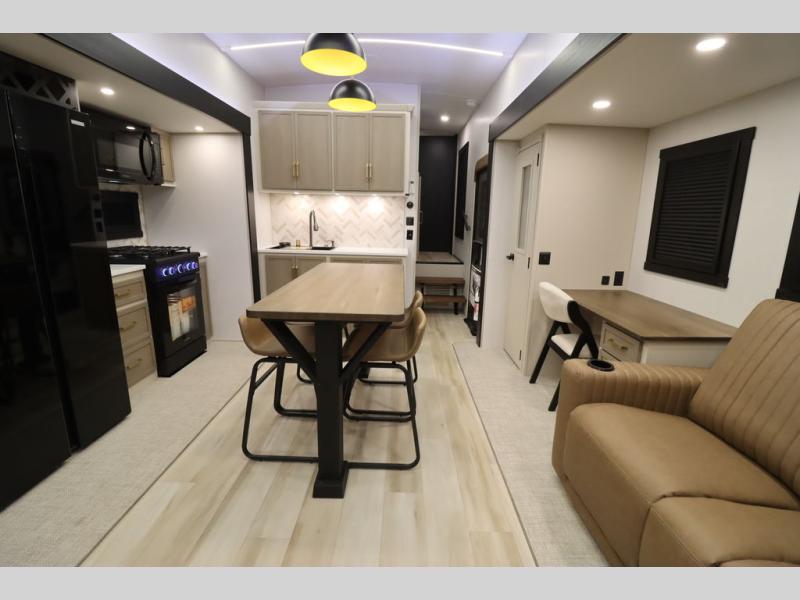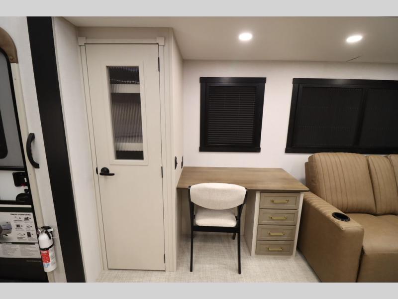 It won't be hard to find comfort in this spacious fifth wheel for four! Once you've unloaded the pass-thru storage, you can head inside to make lunch in the full kitchen. There is a 16-cu. ft. 12V refrigerator here to keep food fresh, and everyone can dine at the kitchen island with four chairs. The theater seating is directly across from the 50" TV and fireplace, and you'll appreciate the hidden storage behind the TV for movies, games, and books! A desk with a chair is also found in the combined kitchen and living area if you need to get some work done, and a rear tri-fold sofa provides sleeping space for guests. Don't overlook the spacious full bath with dual sinks and the front private bedroom with a custom king bed slide. A front wardrobe plus a dresser will let you keep your space tidy, and there is washer/dryer prep if you plan to add those appliances!