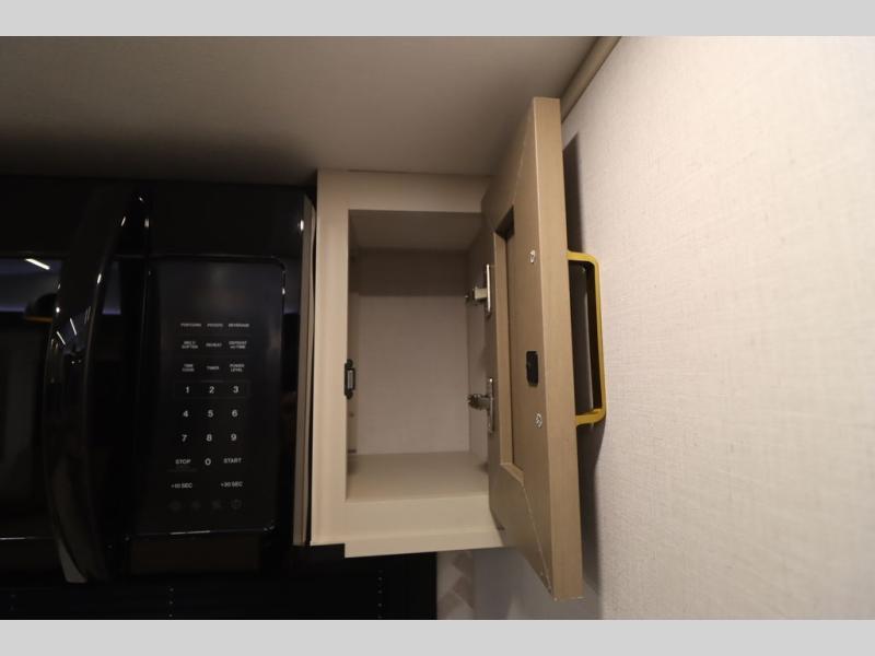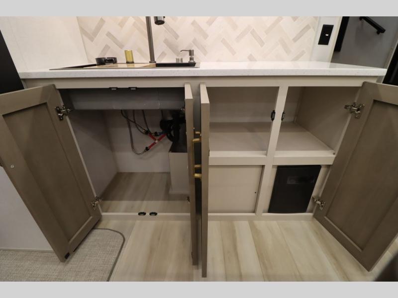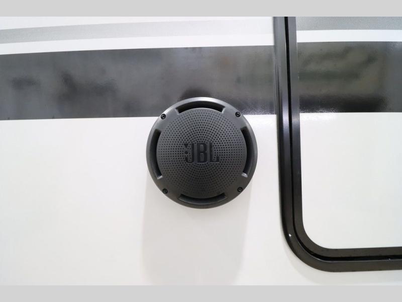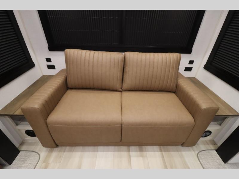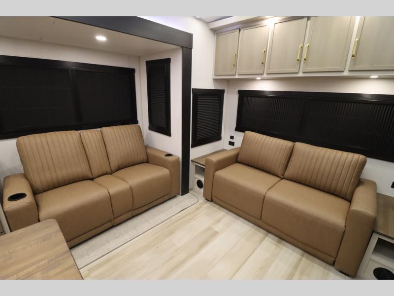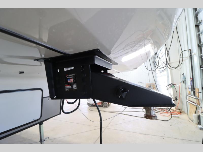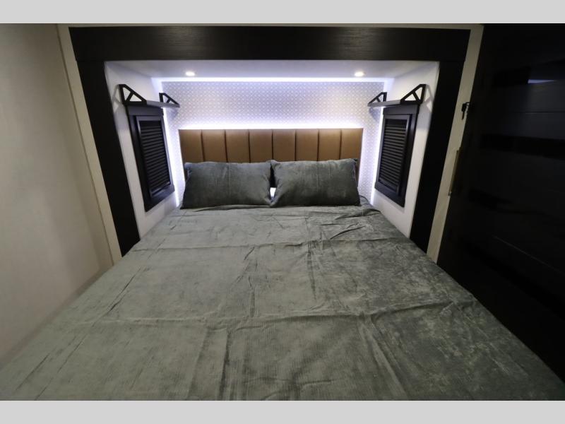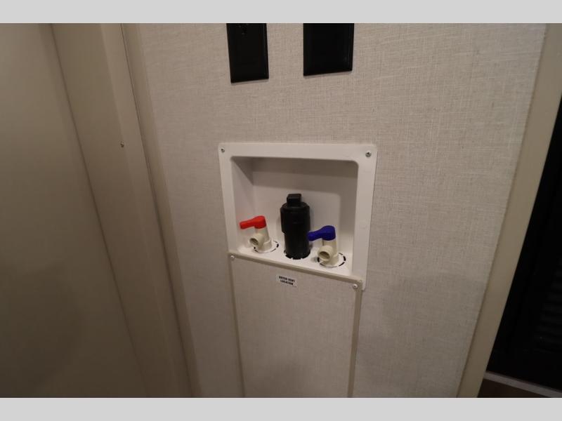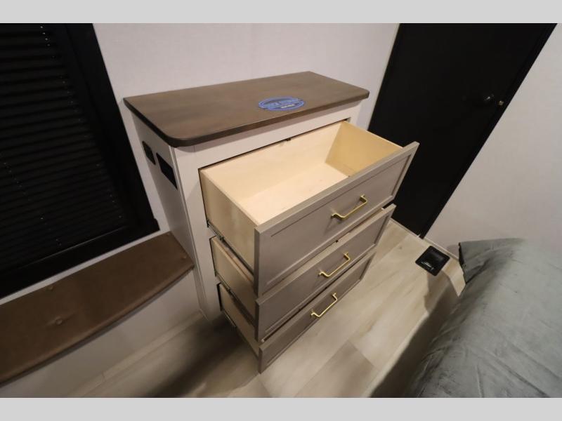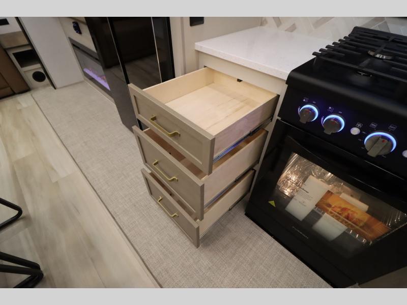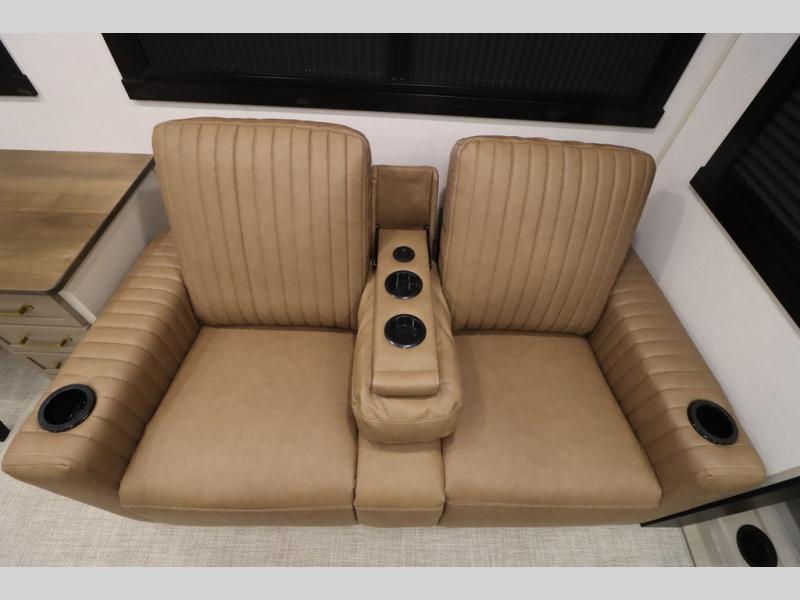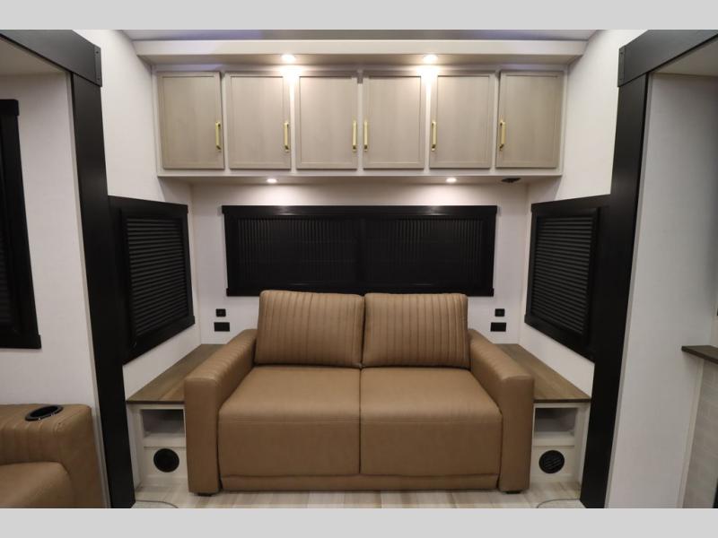 It won't be hard to find comfort in this spacious fifth wheel for four! Once you've unloaded the pass-thru storage, you can head inside to make lunch in the full kitchen. There is a 16-cu. ft. 12V refrigerator here to keep food fresh, and everyone can dine at the kitchen island with four chairs. The theater seating is directly across from the 50" TV and fireplace, and you'll appreciate the hidden storage behind the TV for movies, games, and books! A desk with a chair is also found in the combined kitchen and living area if you need to get some work done, and a rear tri-fold sofa provides sleeping space for guests. Don't overlook the spacious full bath with dual sinks and the front private bedroom with a custom king bed slide. A front wardrobe plus a dresser will let you keep your space tidy, and there is washer/dryer prep if you plan to add those appliances!