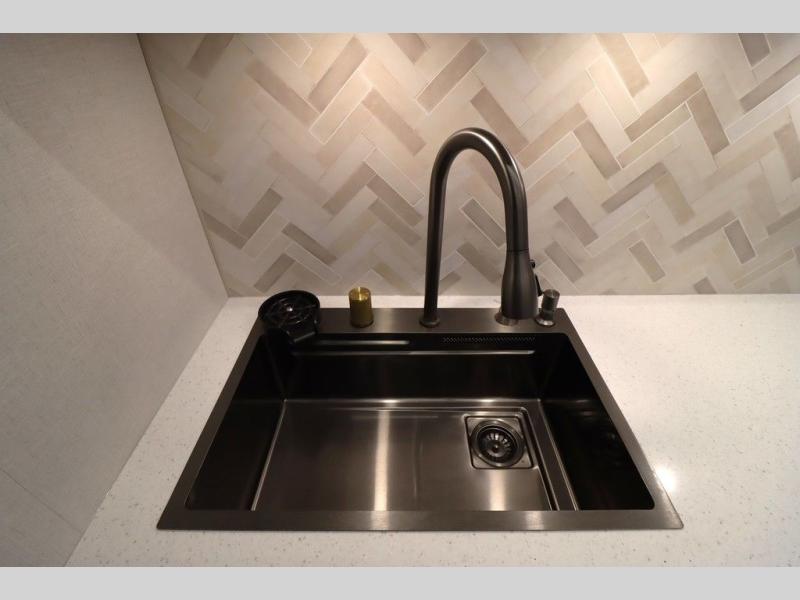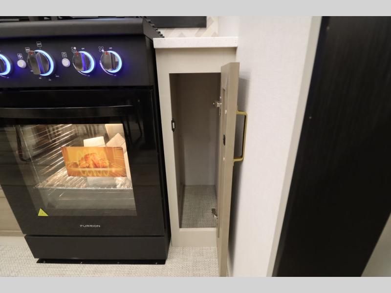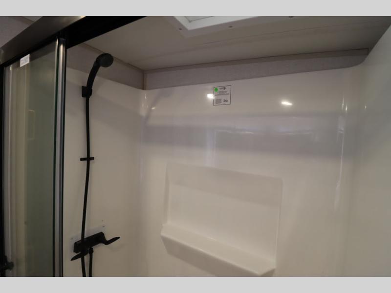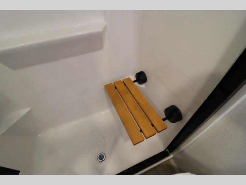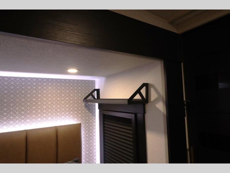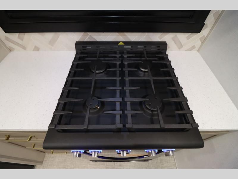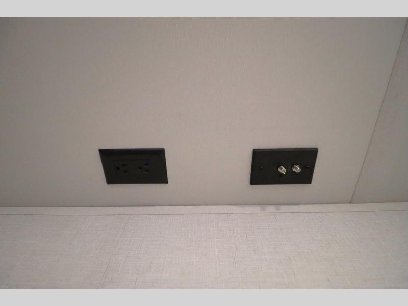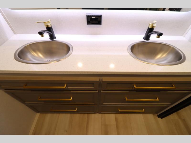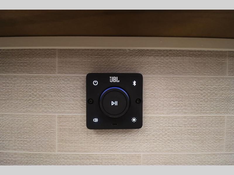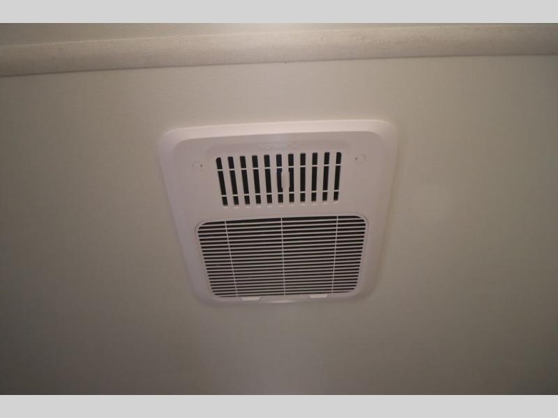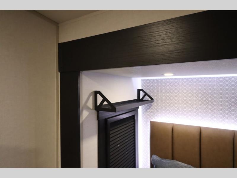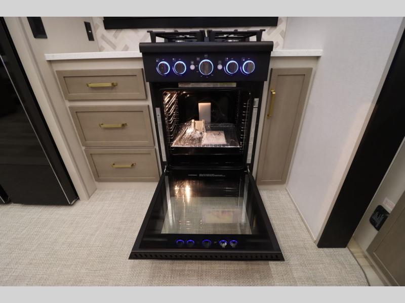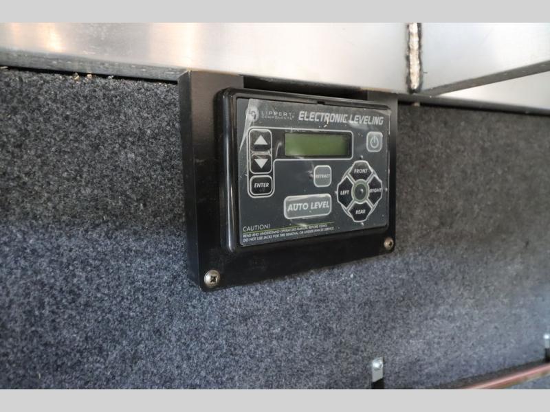 It won't be hard to find comfort in this spacious fifth wheel for four! Once you've unloaded the pass-thru storage, you can head inside to make lunch in the full kitchen. There is a 16-cu. ft. 12V refrigerator here to keep food fresh, and everyone can dine at the kitchen island with four chairs. The theater seating is directly across from the 50" TV and fireplace, and you'll appreciate the hidden storage behind the TV for movies, games, and books! A desk with a chair is also found in the combined kitchen and living area if you need to get some work done, and a rear tri-fold sofa provides sleeping space for guests. Don't overlook the spacious full bath with dual sinks and the front private bedroom with a custom king bed slide. A front wardrobe plus a dresser will let you keep your space tidy, and there is washer/dryer prep if you plan to add those appliances!