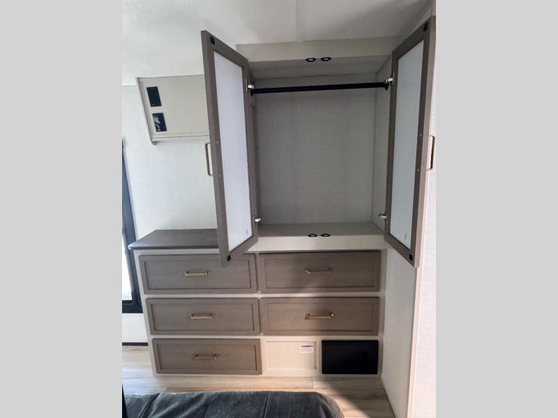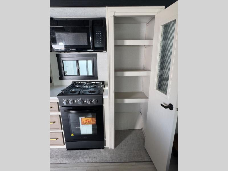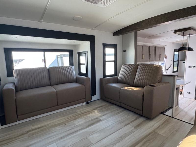 Invite the grandkids or your neighbor friends for your next camping trip in this Wildwood Heritage Glen Elite fifth wheel that features a front entertainment center and living area. Your guests will love the two tri-fold sofas within dual opposing slides to make the room their own. You'll also enjoy theatre seats and a fireplace for an even more at-home feel. The large pantry in the kitchen is very handy as well as the breakfast bar with swivel bar stools. This unit also includes a full and half bath for your convenience, and a king bed with Versa-Tilt on an Elite extra-wide bed slide in the private bedroom. There is abundant storage with multiple pass-through compartments included, so you don't have to leave any of your larger gear behind. Outdoors, you can also enjoy the 20' awning, the strut-assisted steps when entering and exiting, and the Elite outdoor bar and entertainment center which includes a 32" TV, a griddle, and a refrigerator.