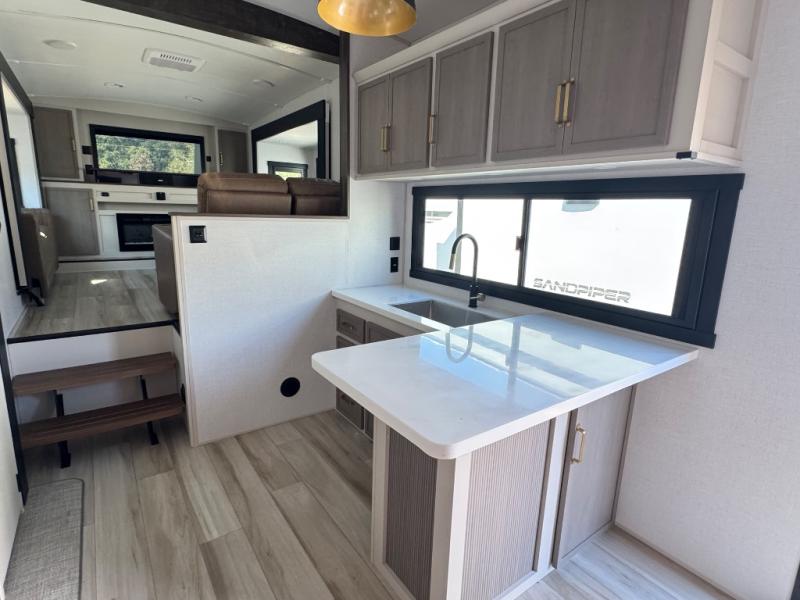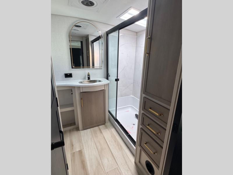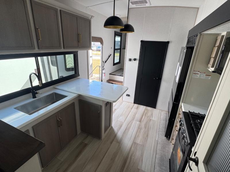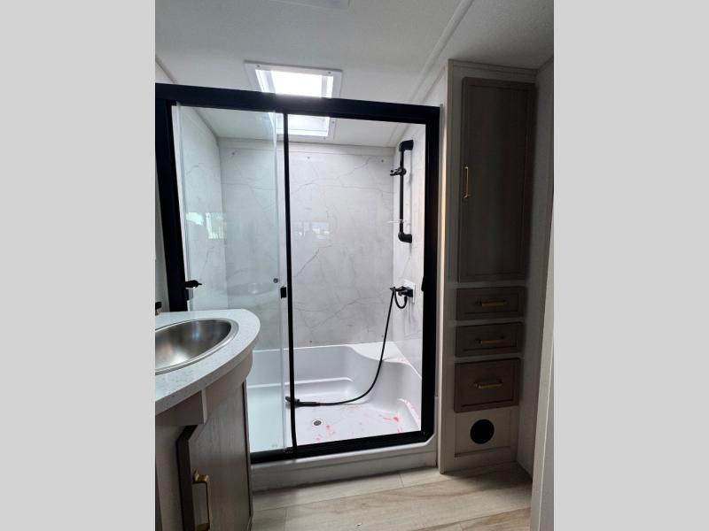 Each Wildwood Heritage Glen Elite Series fifth wheel by Forest River is constructed with vacuum bonded "Aluma Frame" sidewalls and floor, block foam insulation, and an AccessiBelly underbelly with 12V tank heaters on all holding tanks to help extend your camping season. There is an exterior docking station with hot and cold water, along with power stabilizer jacks and landing gear, and Maxxis radial tires with black accented rims. There is also an in-line water filtration system, an RV Airflow system, and an extra large pass-through storage with Slam Latch baggage doors for hassle-free packing. You will love the high-end solid surface countertops inside, along with gold-accented faucets with stainless steel sinks in all bathrooms, and summer wind colored horizontal plank linoleum flooring that is both stylish and easy to keep clean!