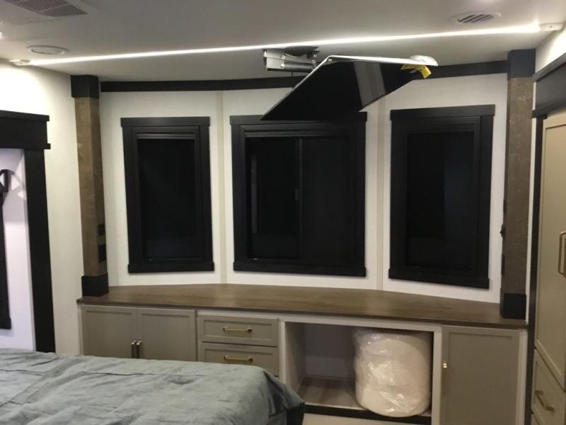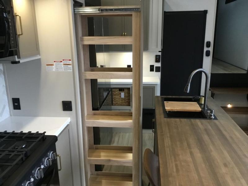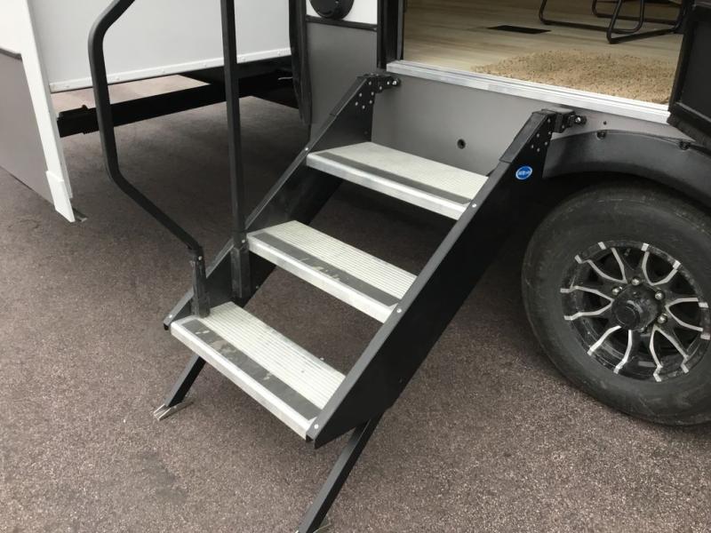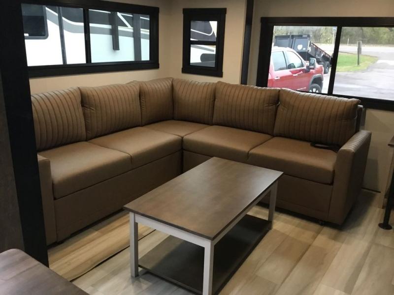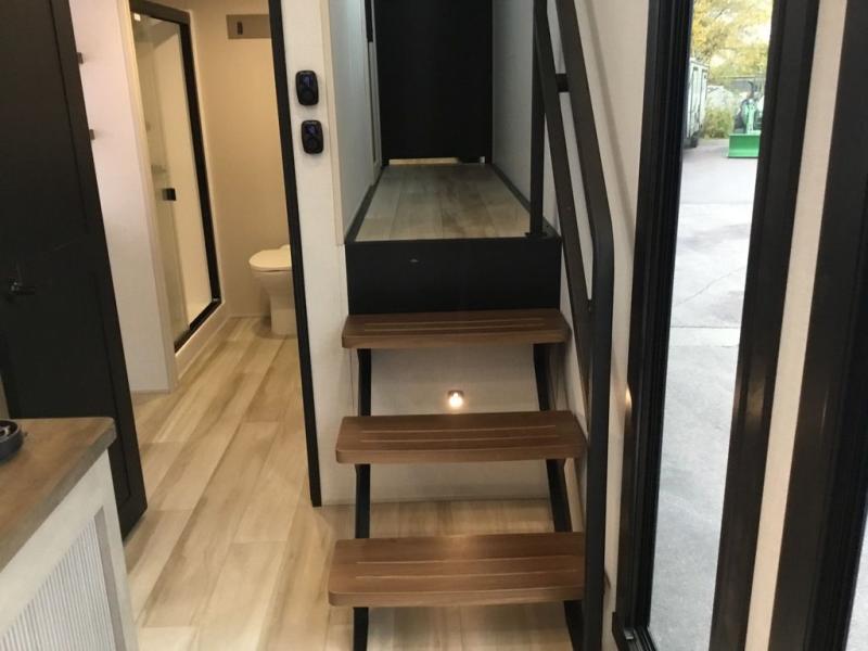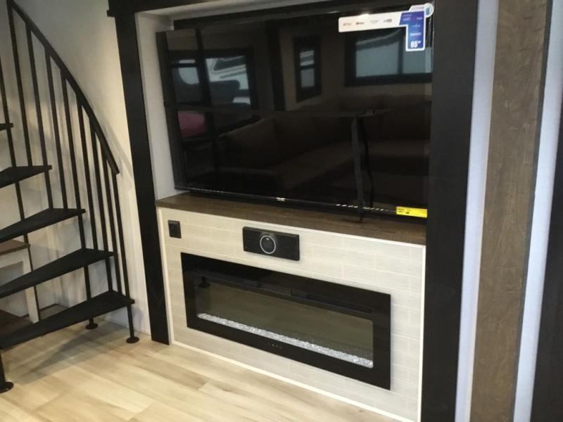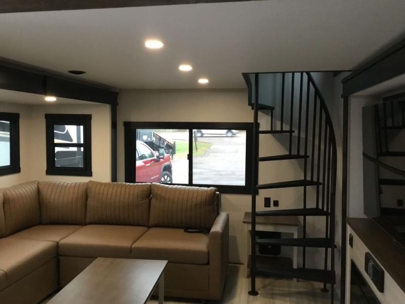 Introducing a new RV of its kind, the ROOST43 is a destination-style fifth wheel you are sure to love! There are two levels, making it feel more like home, and you can sleep six to eight each night. The master bedroom includes a custom king bed slide out, a 32" TV and fireplace, a desk/vanity, plus a half bath for convenience. A custom king-size bed is also found in the front loft, and there are storage cubbies plus a coax/110V outlet here to plug in chargers or a laptop. The second loft in the back includes spiral stairs, two bunk mats, a wardrobe, and cubby cubes here also for your guests' things. Some of the stand-out features you'll find on the first level are the sectional sofa with a coffee table, an entertainment center with a 65" TV, a kitchen island with five chairs, and a fully-equipped kitchen. The 20 cu. ft. 12V refrigerator and pull-out pantry will let you stock up on food, and the kitchen hutch will be perfect for nice dishes. The full bath on this model is one to remember; there is a one-piece fiberglass shower with a teak seat, a flip-up shelf and a washer/dryer, a backlit mirror, and more. And we haven't even touched on the exterior features, such as the pull-out tray, outdoor refrigerators, 20' awning, and more!