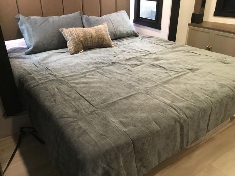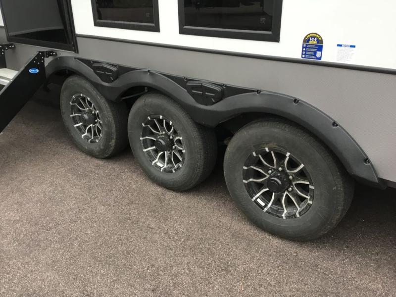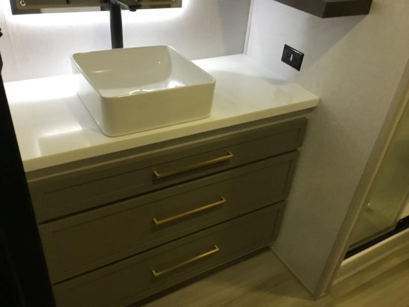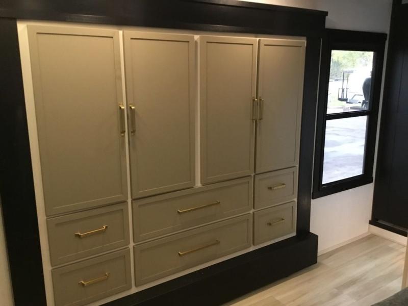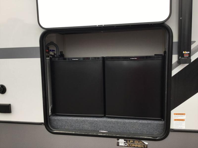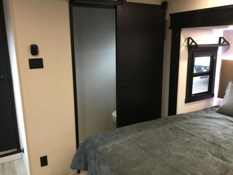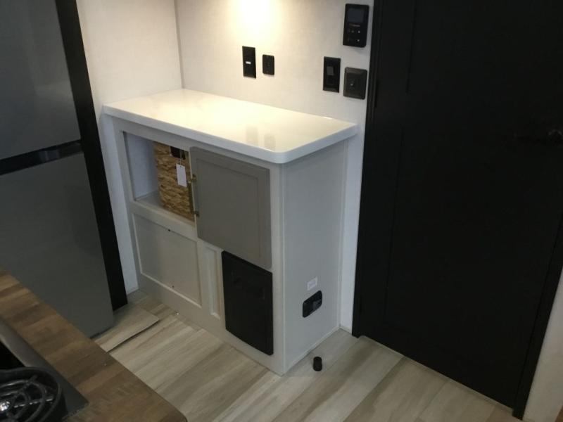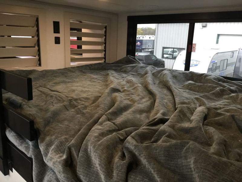 Introducing a new RV of its kind, the ROOST43 is a destination-style fifth wheel you are sure to love! There are two levels, making it feel more like home, and you can sleep six to eight each night. The master bedroom includes a custom king bed slide out, a 32" TV and fireplace, a desk/vanity, plus a half bath for convenience. A custom king-size bed is also found in the front loft, and there are storage cubbies plus a coax/110V outlet here to plug in chargers or a laptop. The second loft in the back includes spiral stairs, two bunk mats, a wardrobe, and cubby cubes here also for your guests' things. Some of the stand-out features you'll find on the first level are the sectional sofa with a coffee table, an entertainment center with a 65" TV, a kitchen island with five chairs, and a fully-equipped kitchen. The 20 cu. ft. 12V refrigerator and pull-out pantry will let you stock up on food, and the kitchen hutch will be perfect for nice dishes. The full bath on this model is one to remember; there is a one-piece fiberglass shower with a teak seat, a flip-up shelf and a washer/dryer, a backlit mirror, and more. And we haven't even touched on the exterior features, such as the pull-out tray, outdoor refrigerators, 20' awning, and more!