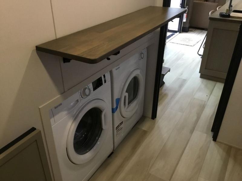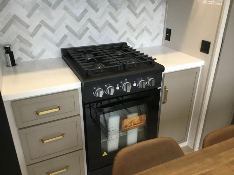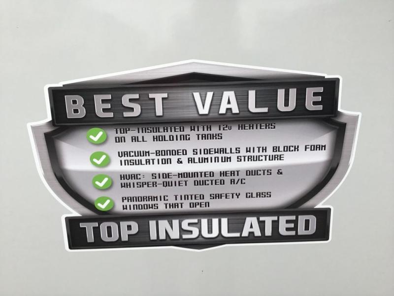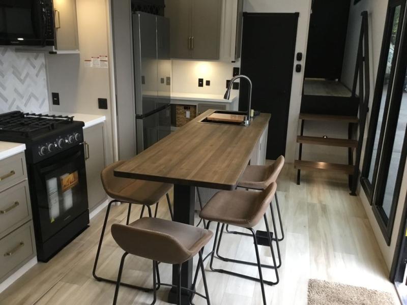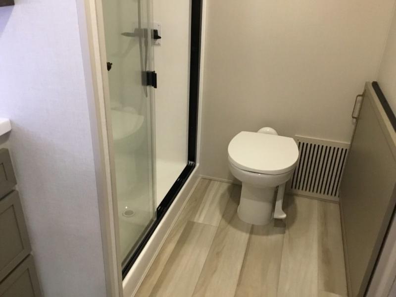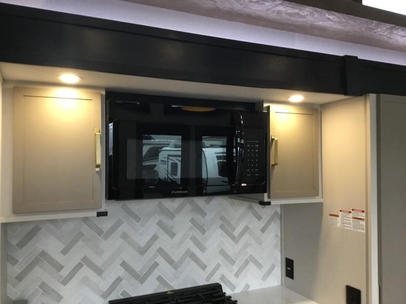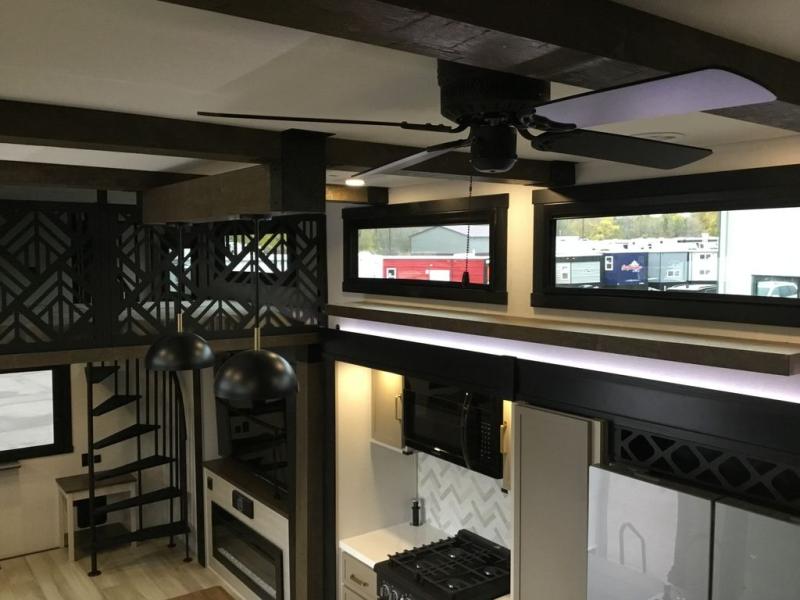The Wildwood Heritage Glen ROOST fifth wheels resemble a destination trailer that will be giving you residential vibes! The premium Alley Grey high-gloss gel coat fiberglass sidewalls are ultra sleek, and the flat pitched roof sheds water to the off-door side for added comfort. A Race Track A/C duct system provides maximum cooling, and the AccessiBelly underbelly with 12V tank heaters on all holding tanks will help extend your camping season. There are high-end solid surface and maple-stained wood countertops inside, along with residential-inspired wood door casings, and 6' 8" clearance in all rooms, excluding lofts. Additional features include a Gun Metal grey kitchen sink, backlit mirrors in the bathrooms, motion sensor lights by the spiral stair cases, and back up camera prep if you want the option to make parking easier than ever.