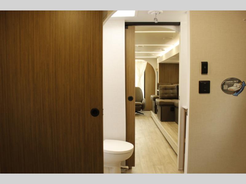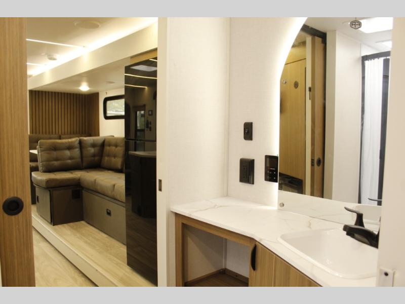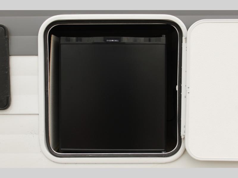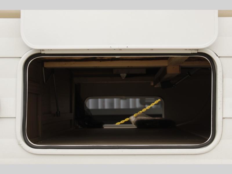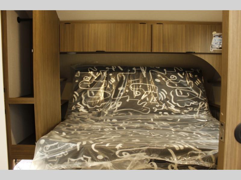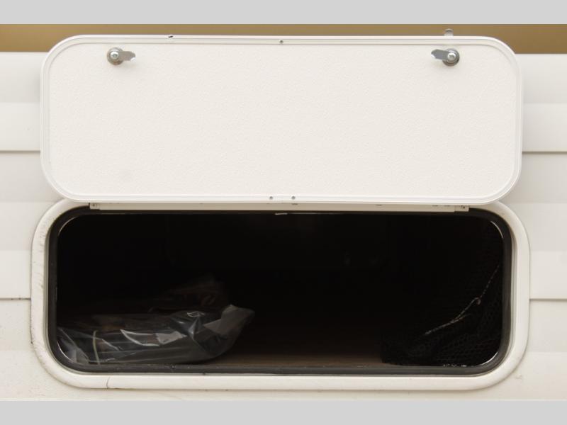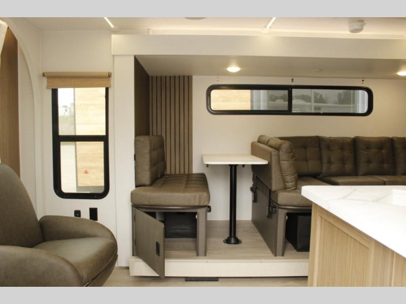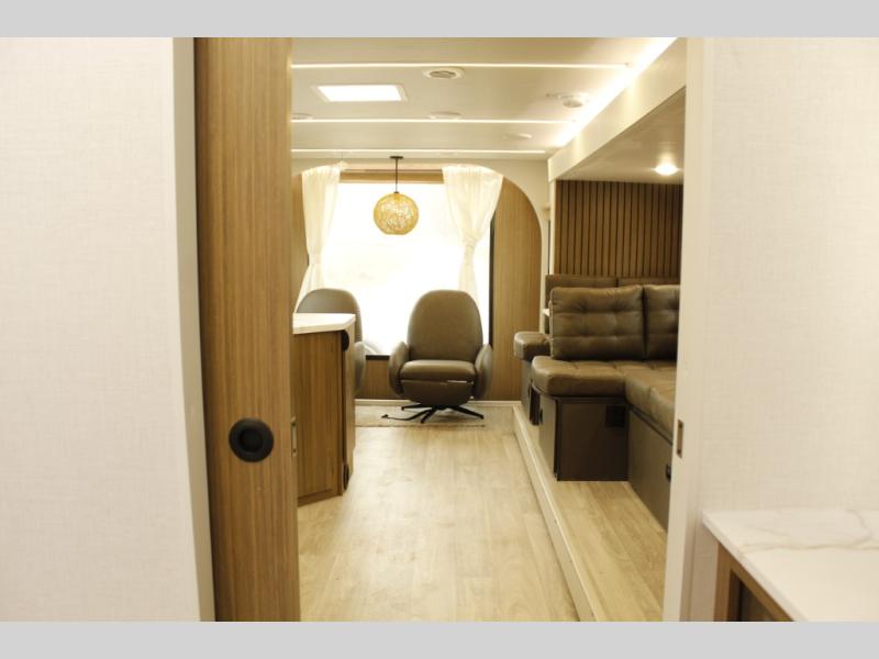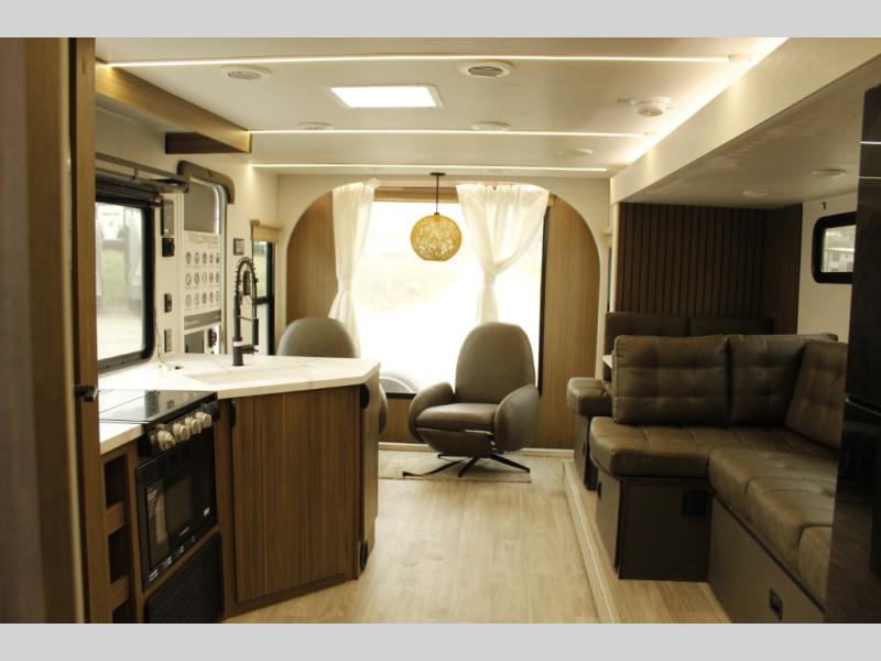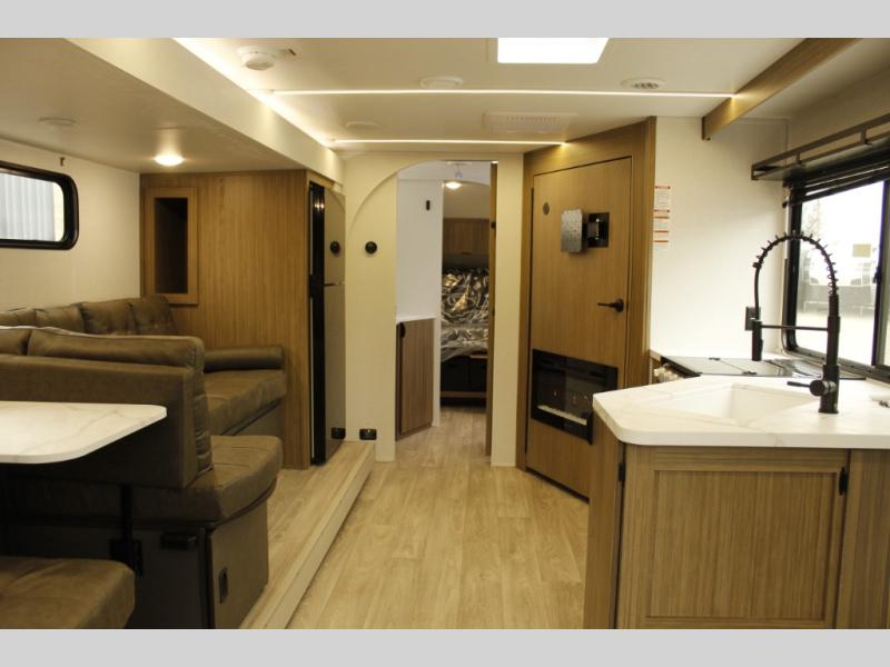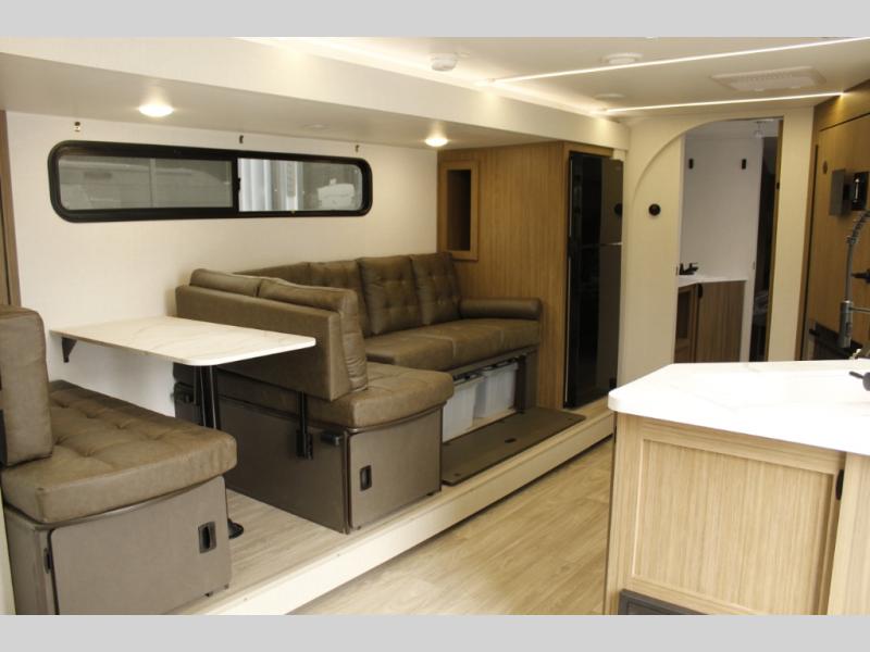 Comfort comes easy in this spacious travel trailer for three to four! The rear living area includes dual lounge chairs and a picture window so you can sit with your coffee and book in the morning. Once the chef of your crew has made breakfast in the fully equipped kitchen, you can dine at the booth dinette or take your plate outdoors under the awning. There is also a Versa-Lounge beside the dinette for more seating spaces. An entertainment center with a fireplace will make your space cozier, and you'll appreciate the hidden pantry behind for dry goods, movies, games and more! The walk-thru bath leads to the master bedroom where you'll find a walk-around Versa-Tilt custom king bed, a bedroom closet, and overhead storage so everything has a place!
