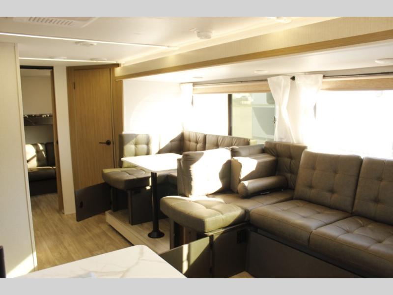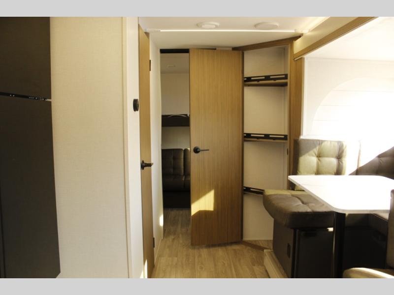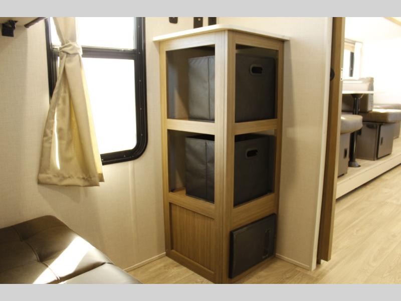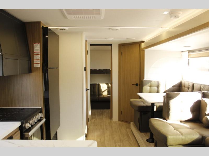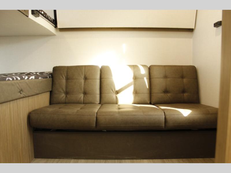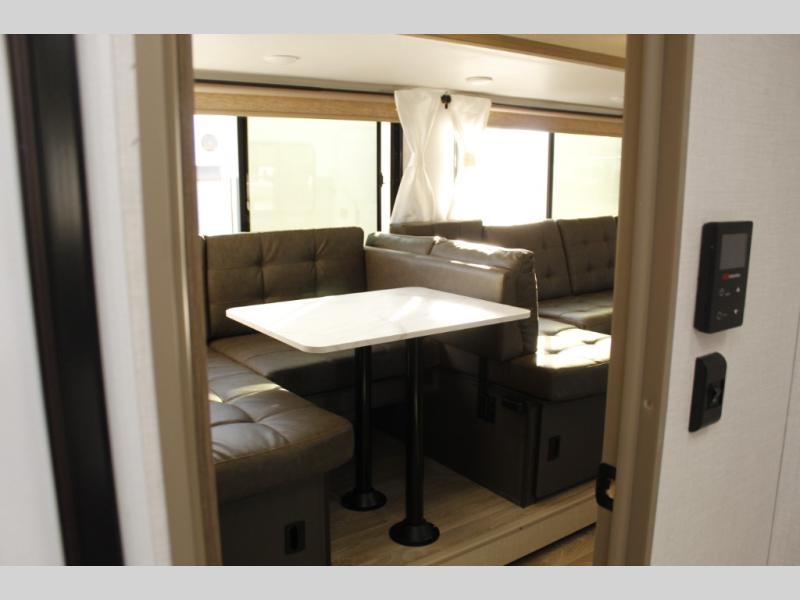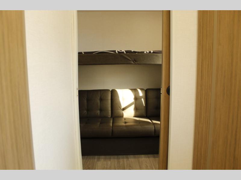 If you like to travel with a large crew, choose this Wildwood X-Lite travel trailer! This trailer has two private sleeping spaces with a private bedroom up front and a private bunkhouse in the back. Not only does the bunkhouse have bunk beds, but it also has a wardrobe for storage and a jiffy sofa for lounging. In the main living area, there is a large slide that holds the U-shaped dinette and Versa lounge, and these pieces of furniture can both be transformed into beds for additional sleeping space. The panoramic windows surround the dinette and sofa so that you can take in the scenic views while you relax. You will also love the exterior camp kitchen on this model!