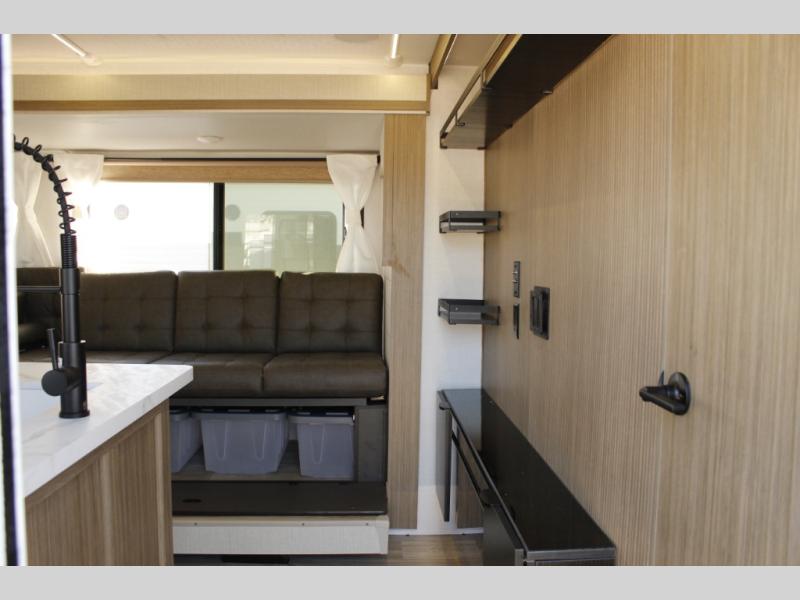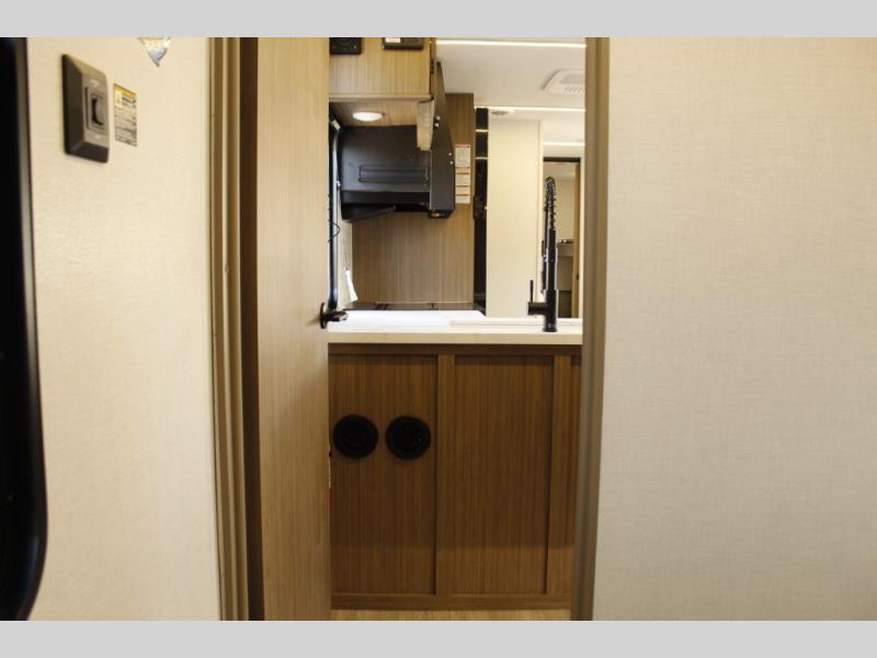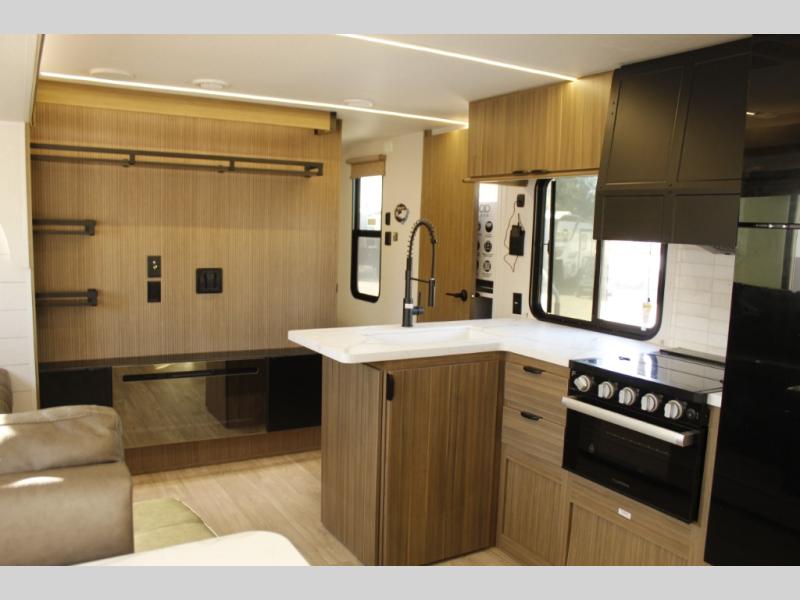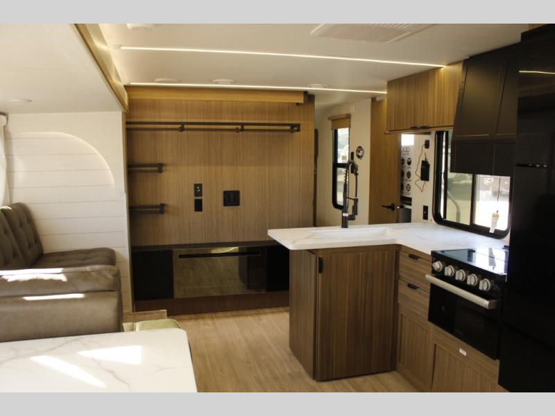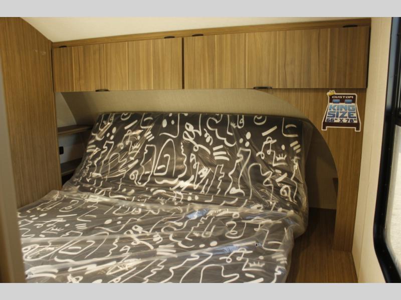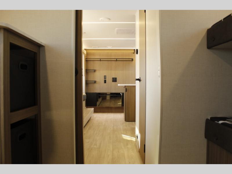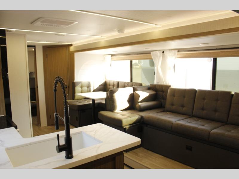 If you like to travel with a large crew, choose this Wildwood X-Lite travel trailer! This trailer has two private sleeping spaces with a private bedroom up front and a private bunkhouse in the back. Not only does the bunkhouse have bunk beds, but it also has a wardrobe for storage and a jiffy sofa for lounging. In the main living area, there is a large slide that holds the U-shaped dinette and Versa lounge, and these pieces of furniture can both be transformed into beds for additional sleeping space. The panoramic windows surround the dinette and sofa so that you can take in the scenic views while you relax. You will also love the exterior camp kitchen on this model!