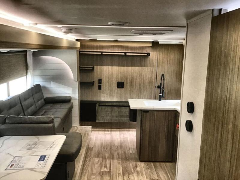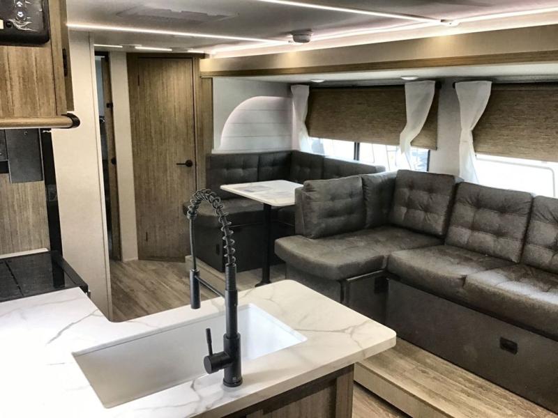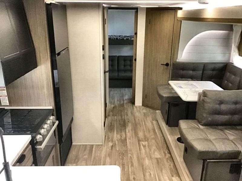 If you like to travel with a large crew, choose this Wildwood X-Lite travel trailer! This trailer has two private sleeping spaces with a private bedroom up front and a private bunkhouse in the back. Not only does the bunkhouse have three bunk beds, but it also has a closet for storage and a jiffy sofa for lounging. In the main living area, there is a large slide that holds the U-shaped dinette and sofa. These pieces of furniture are a part of the Versa Lounge, and you can customize them to function as you need them to. The panoramic windows surround the dinette and sofa so that you can take in the scenic views while you relax. You even have an outdoor camp kitchen to make it more convenient.
