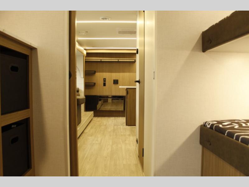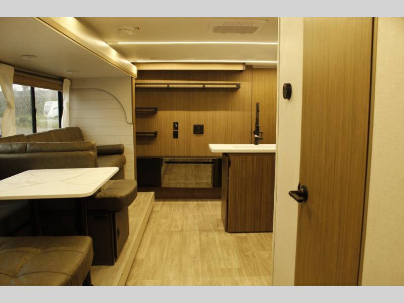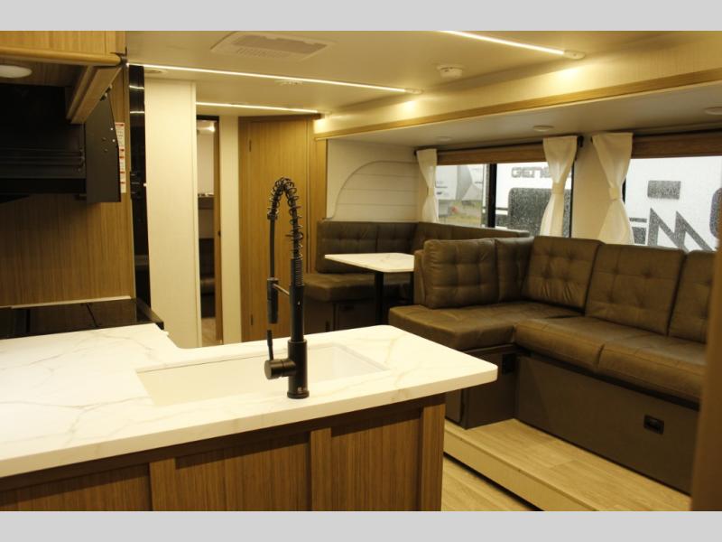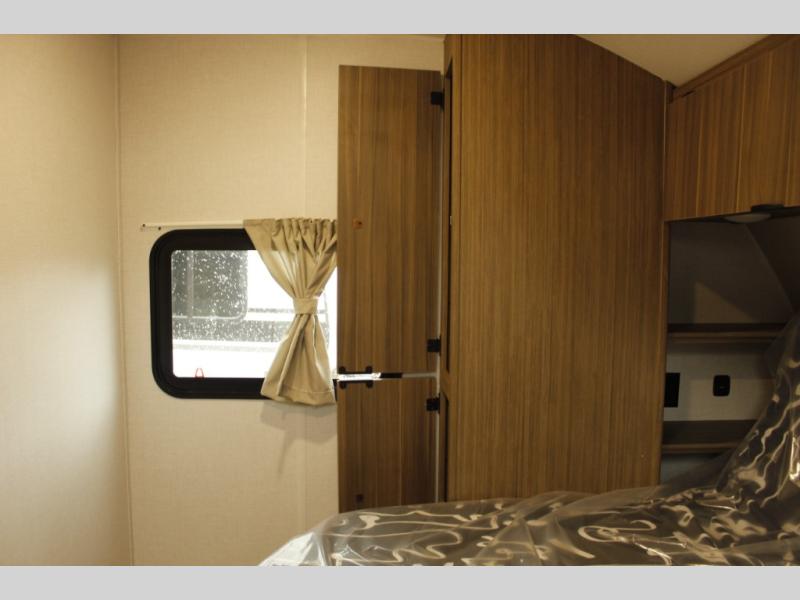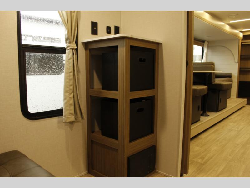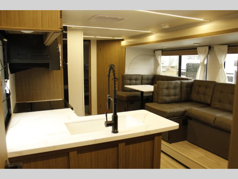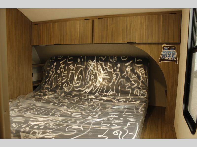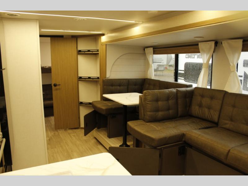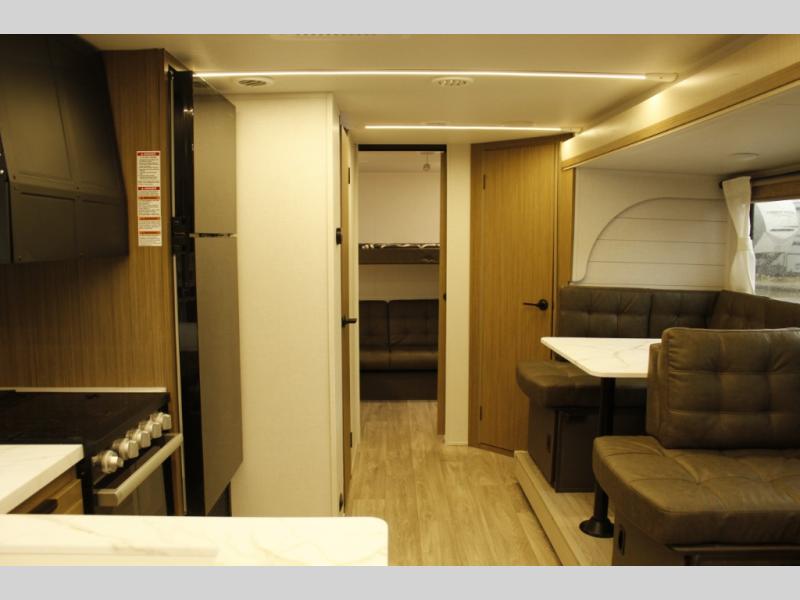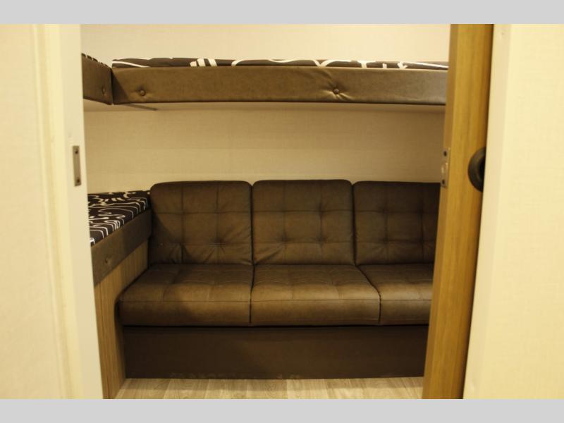 If you like to travel with a large crew, choose this Wildwood X-Lite travel trailer! This trailer has two private sleeping spaces with a private bedroom up front and a private bunkhouse in the back. Not only does the bunkhouse have three bunk beds, but it also has a closet for storage and a jiffy sofa for lounging. In the main living area, there is a large slide that holds the booth dinette and sofa. These pieces of furniture are a part of the Versa Lounge, and you can customize them to function as you need them to. The panoramic windows surround the dinette and sofa so that you can take in the scenic views while you relax.