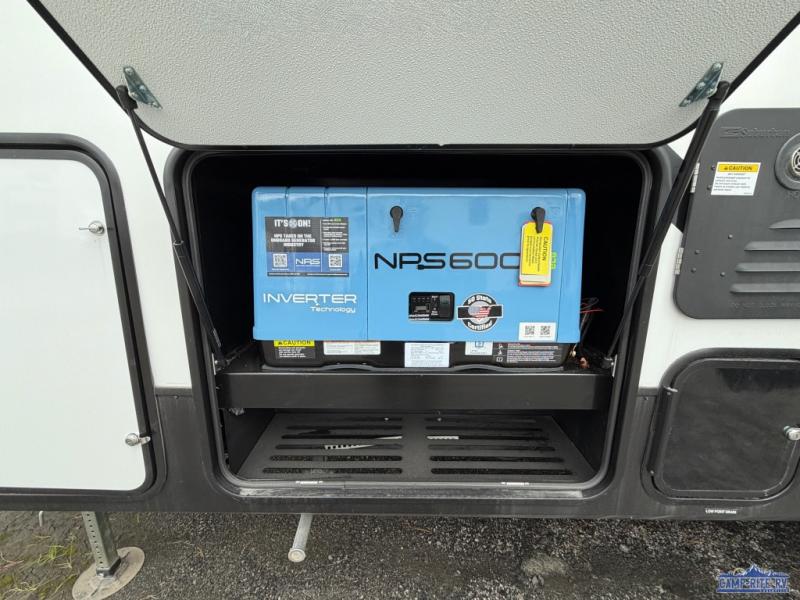 You'll love every minute spent in this double slide out, double entry fifth wheel! Your guests will have the 13' 6" separate garage all to themselves once the toys are unloaded, and here you'll find dual sofa sleepers with a Euro queen bed above. There is also a removable dinette table where you can enjoy a cold drink at when you have the 1,500 lb. capacity patio deck set up! Head to the combined kitchen and living area to relax on the sofa slide out while the cook prepares dinner. There is also a hidden pantry here you are sure to appreciate! The dual entry bath will create a front master bedroom, complete with a queen bed, dual nightstands and wardrobes, plus a wardrobe slide out for added storage and space!