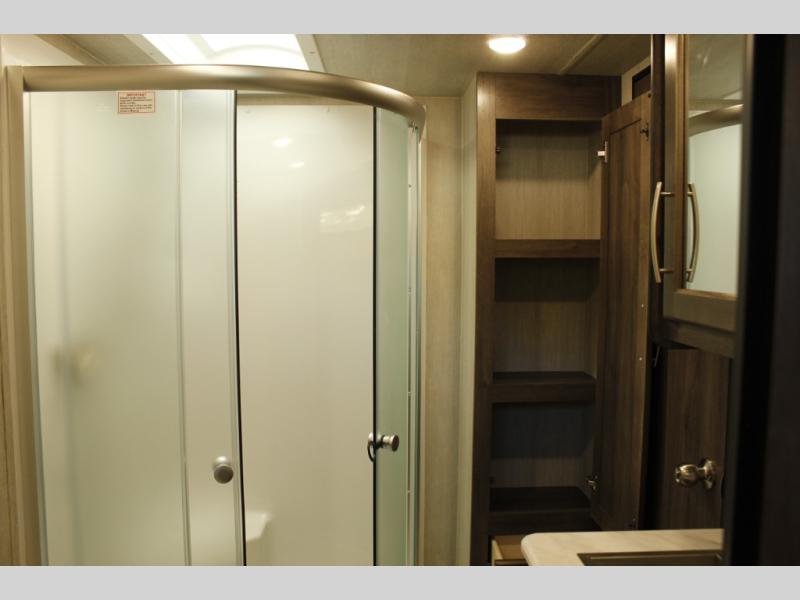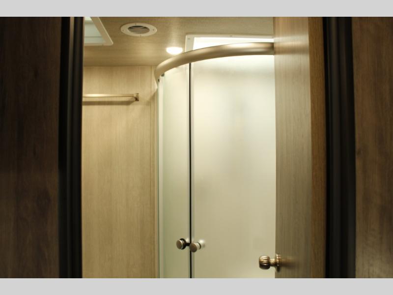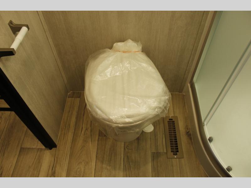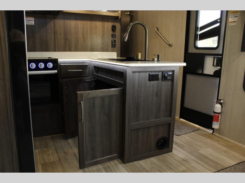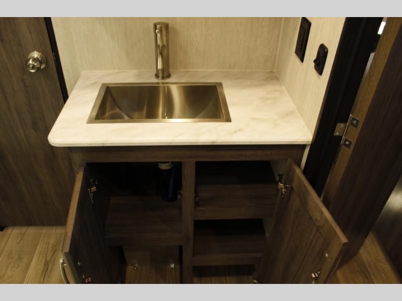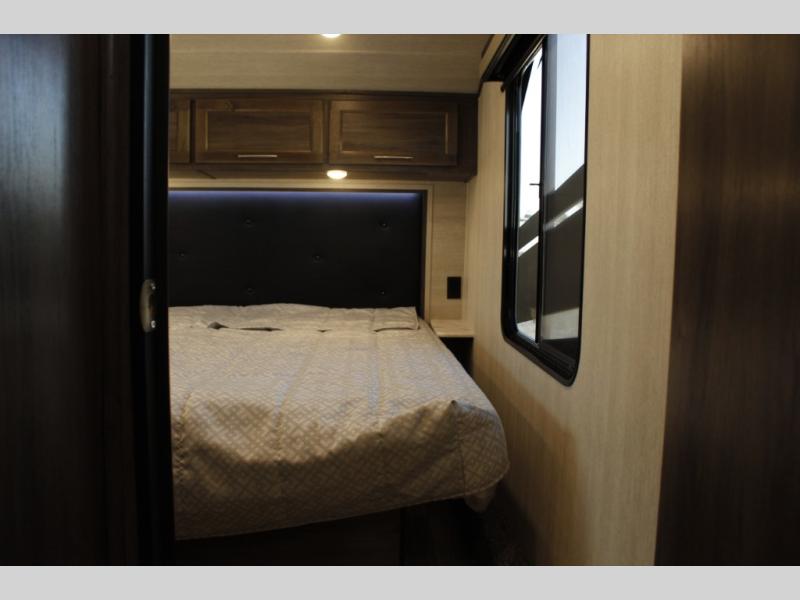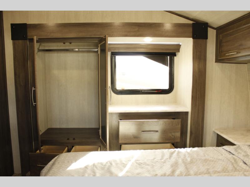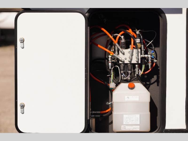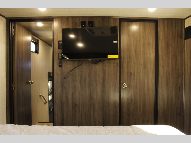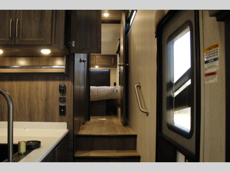 Imagine you, your family and your toys at competitions or fun events or weeklong trips with this fifth wheel and all the comforts inside. The cargo area becomes the main living and kitchen area with a slide out sofa, and an L-shaped countertop for more prep space, plus two chairs and dual opposing sofas with tables. The power queen bed in the rear stays up and away during the day then can easily be dropped down to sleep on. The front master bedroom is spacious as well with a slide out vanity/wardrobe and the second entry into the bathroom which is super convenient.