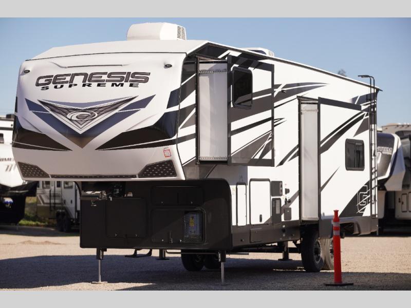 All sizes of off-road toys can fit into one of these Genesis Supreme fifth wheel toy haulers or travel trailer toy haulers! They are made for the outdoor enthusiasts and can handle harsh environments while still providing a luxurious lifestyle. With innovative floorplans built by engineers, you can know you will find what you're looking for in a toy hauler. Start your off-road journey today with your favorite model!