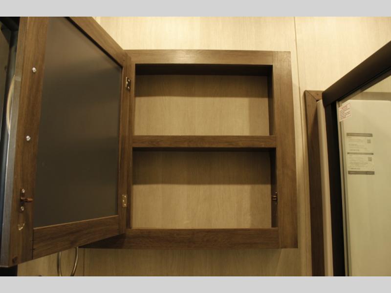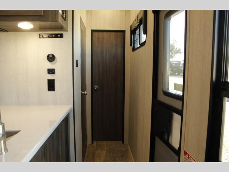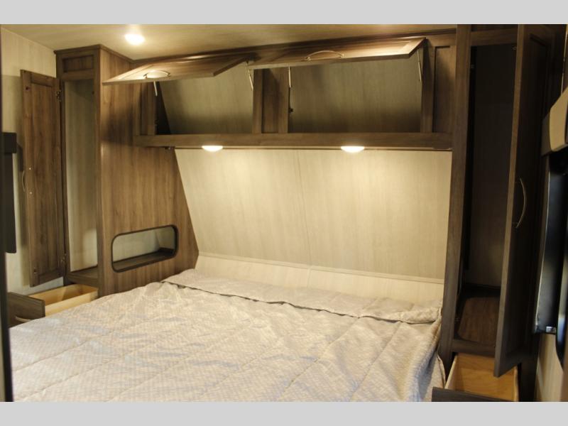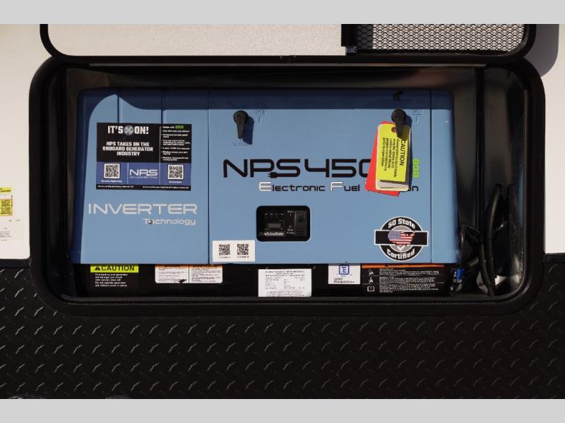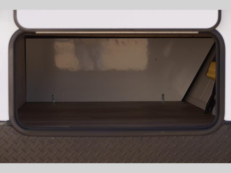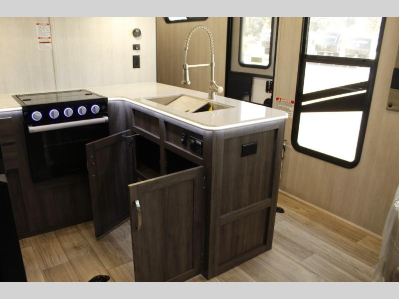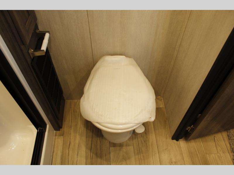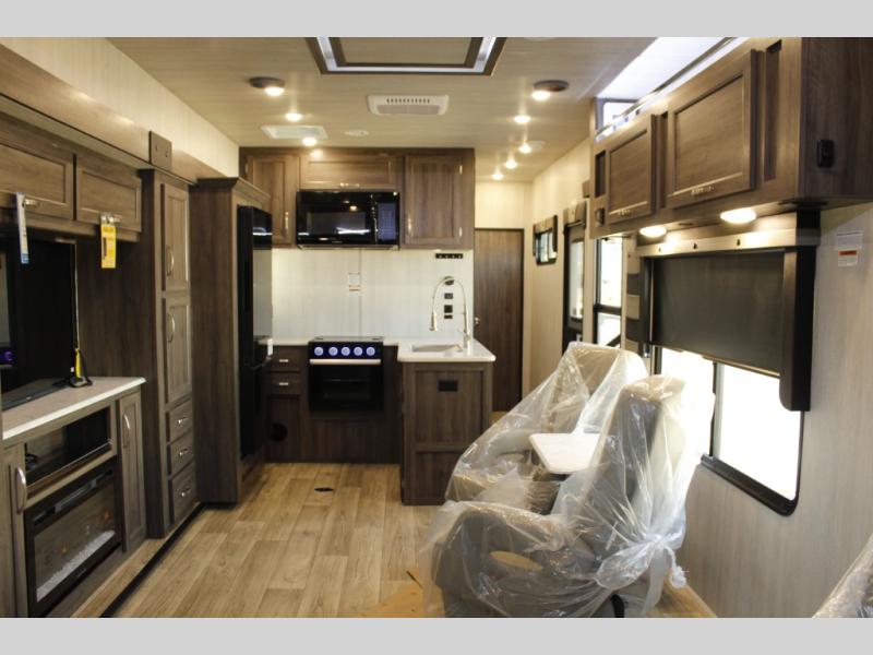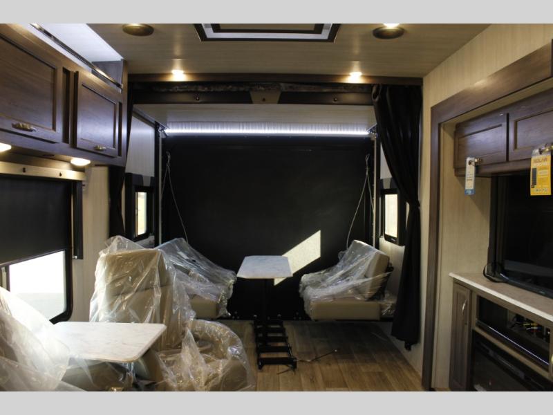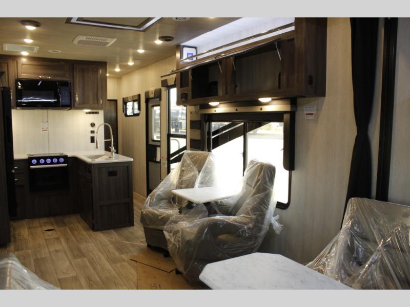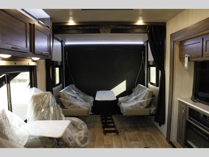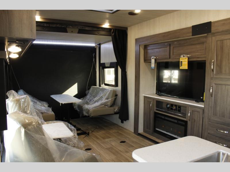 Spend your days kicking up mud and enjoy nights with comforts of home in this toy hauler! The fireplace and 50" TV across from the two swivel rockers provide easy viewing, and the 15' of cargo space will store your gear and toys perfectly. The chef of your crew can make meals on the three burner stove or in the microwave oven, and there is a pantry and refrigerator to store food. A spacious full bath will let you clean up after riding the trails, and the front private bedroom with an RV queen bed is sure to bring you comfort. And if you have any guests stay over, they can sleep on the opposing rear power dinette and drop down bed.