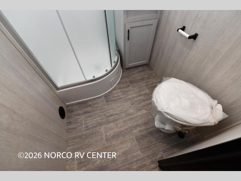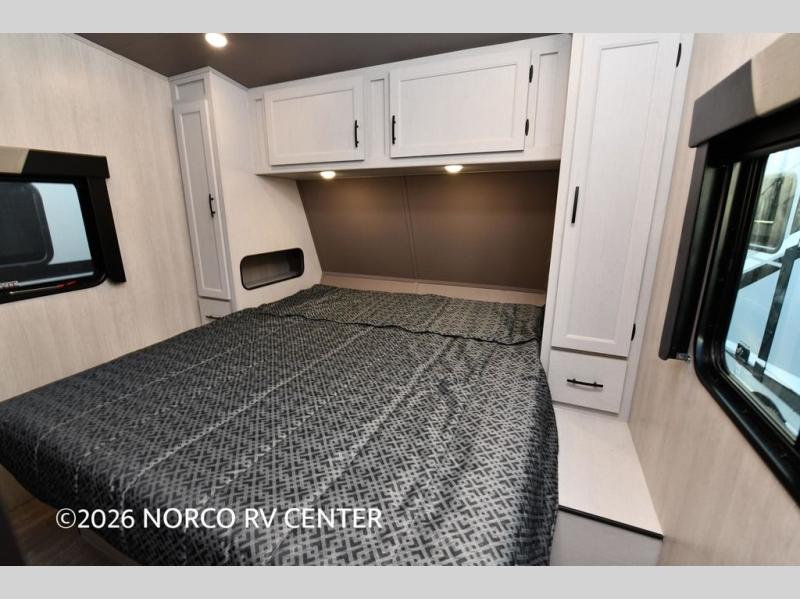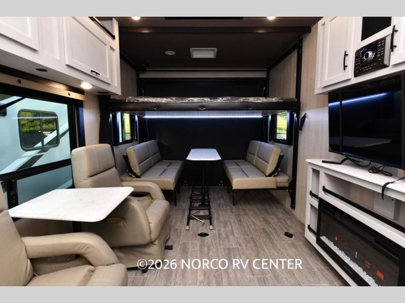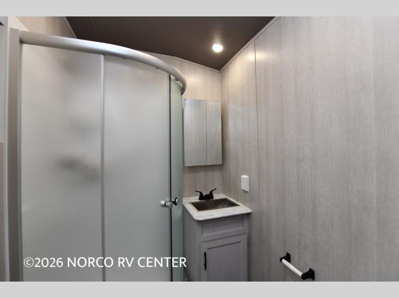 Grab your riding gear, load up the bikes, and head for the hills in this toy hauler for four. Once your toys are unloaded from the 15' total garage space, you can relax on the dual opposing sofas or on the dual lounge chairs with a table in between. There is also an entertainment center across from the chairs, and an optional queen bed above the sofas if you need more sleeping space. A full kitchen with a three burner cooktop, microwave oven, sink, and refrigerator lets you make meals each day, and the full bath will be much appreciated after trail riding. The front of this model features the private bedroom, complete with an RV queen bed, dual wardrobes, and an overhead cabinet for books and more!