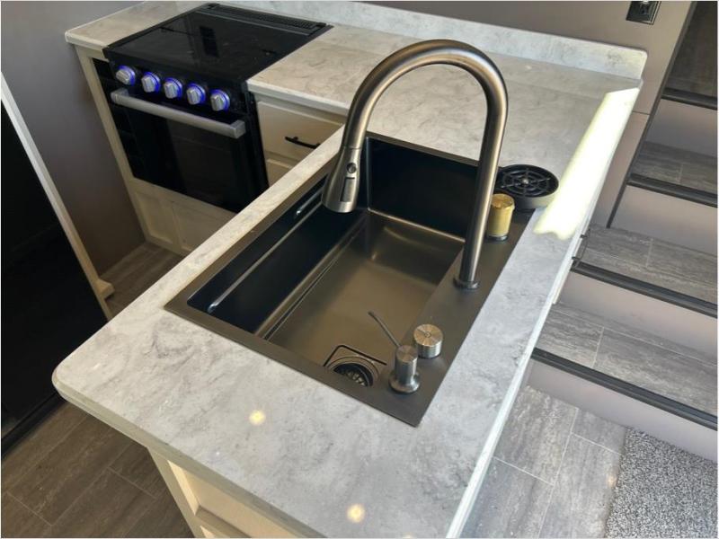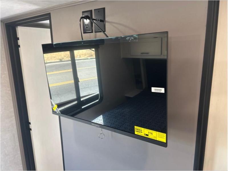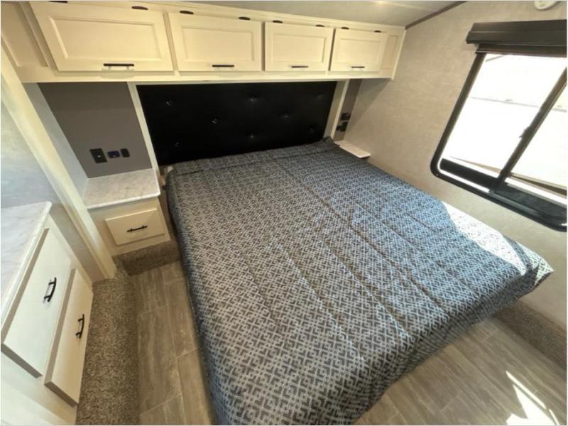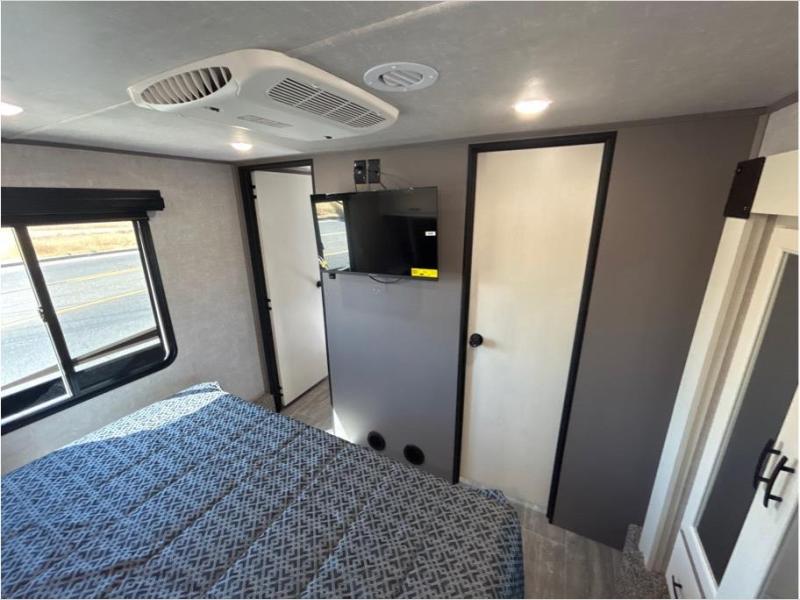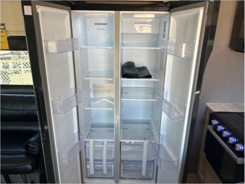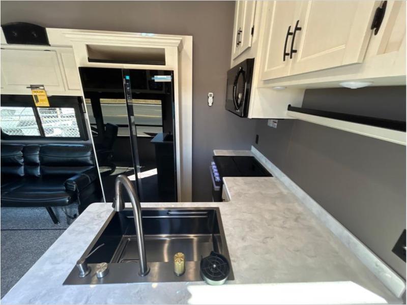 If you want to get away for the weekend with your toys, get away with this Vortex toy hauler. It has a 16' 4" garage to keep your ATVs and dirt bikes secure while you travel. You can accommodate a group of six for sleeping with the king-size bed, power queen bunk and sofas, and everyone will benefit from a hot meal prepared on the three-burner range in the kitchen. You can even keep your cold items fresh by storing them in the refrigerator. The dual-entry bathroom has a door within the main hallway, but it also has a private entrance that leads into the bedroom.