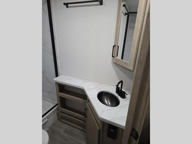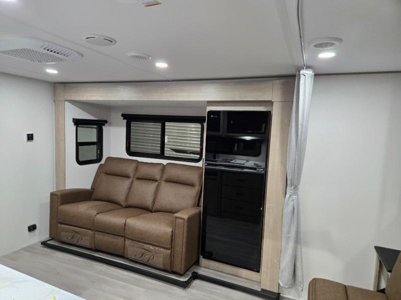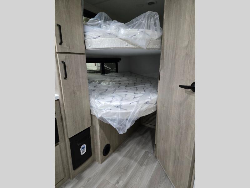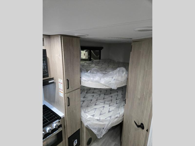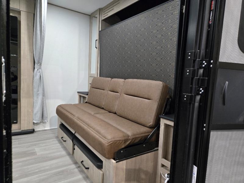 This travel trailer has everything you need for a great vacation! You will never miss home when you see all of the amenities included on this trailer. There is a full bathroom for easy morning routines, a set of 47" x 76" double over double-size bunks with privacy curtains for compact sleeping, a U-shaped dinette for meal times, and a full kitchen with all of the appliances needed for filling meals. You could even switch out the dinette for an optional theater dinette. The front Murphy bed not only provides versatility with a bed to sleep on at night, and a seating area during the day, but also a removable interior/exterior table. In addition to all of that, you'll also find an outdoor griddle and 1.6 cu. ft. refrigerator that you can use when the weather is nice. The unobstructed pass-through storage will be able to store your fishing poles and sports equipment while you travel.