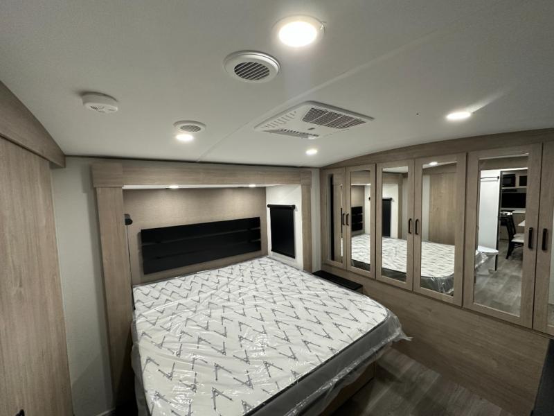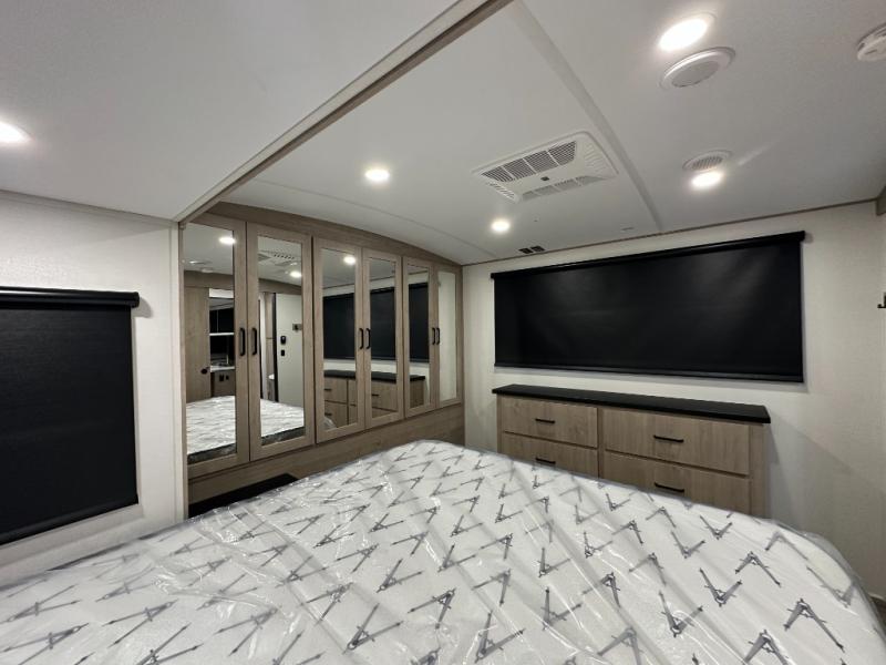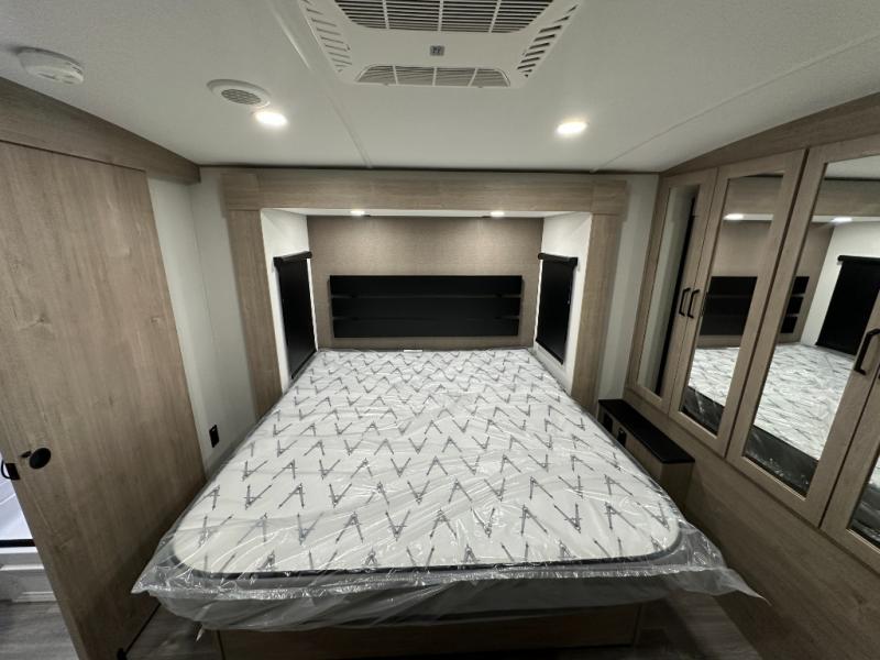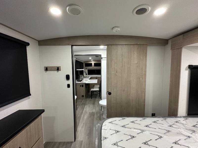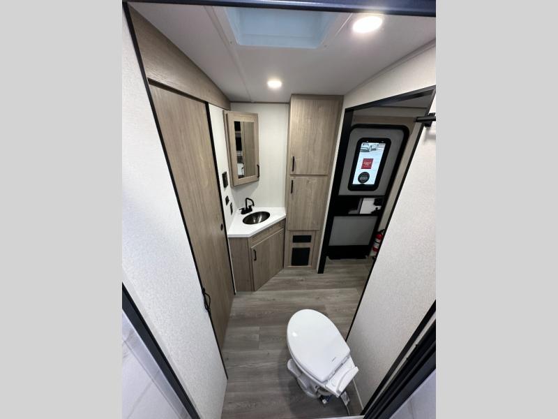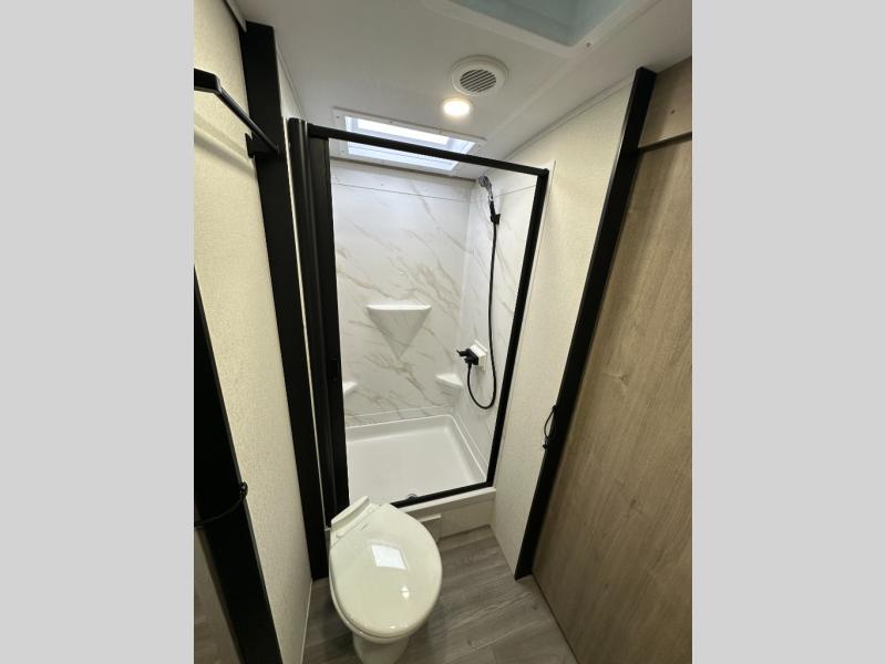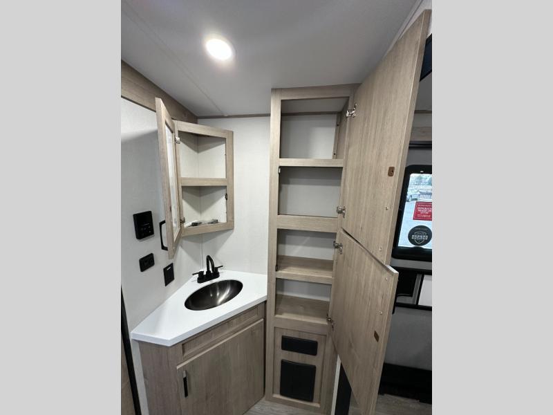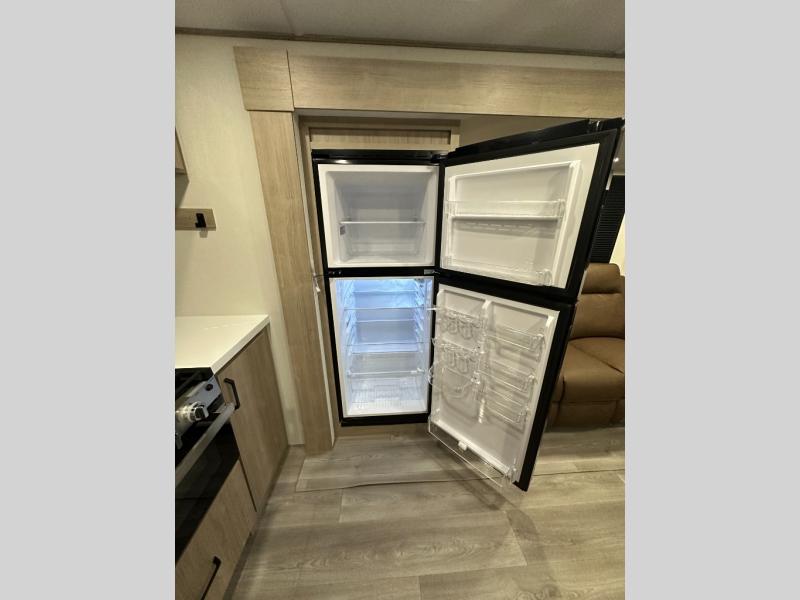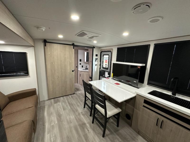 At the front of the 2700BS trailer, you’ll find a spacious full bedroom featuring a 70" x 80" king bed housed in one of two slide outs, offering both generous space and a comfortable night’s rest. The room also includes a wardrobe and dresser, providing ample storage for clothing and essentials. Moving toward the center, the walk-through bathroom boasts a 30" x 36" residential walk-in shower with a skylight, a toilet, and a sink opposite a mirrored medicine cabinet for added convenience and storage. At the rear, the open-concept kitchen and living area make excellent use of the second slide out, which includes cozy theater seating, perfect for dining or relaxing while watching TV. Next to it sits a 10-cu. ft. refrigerator, offering plenty of room for groceries and refreshments. Across the space, the L-shaped kitchen spans the entire rear wall, giving you extensive countertop room for meal prep. Equipped with a three-burner range, oven, microwave, and stainless steel sink, this kitchen allows you to cook in comfort and style without relying on campsite facilities.