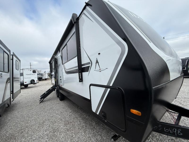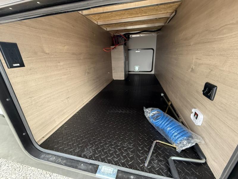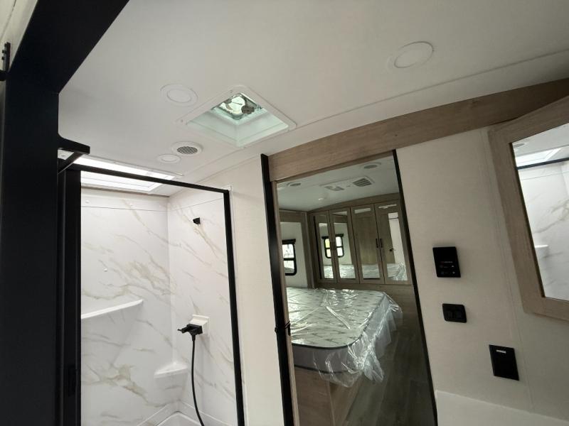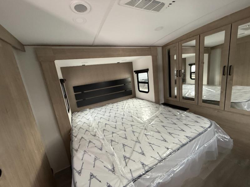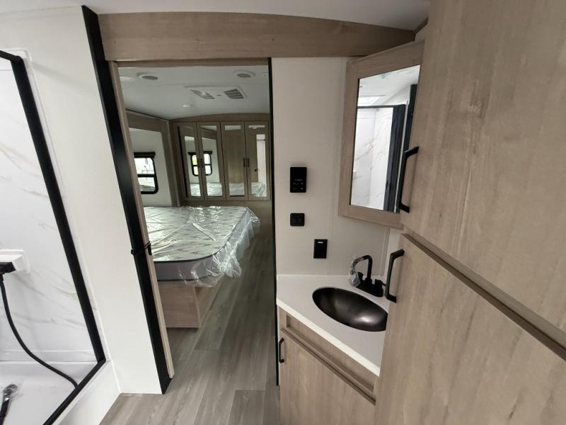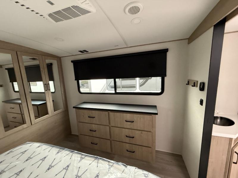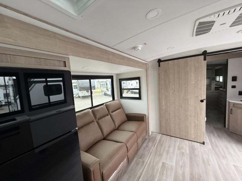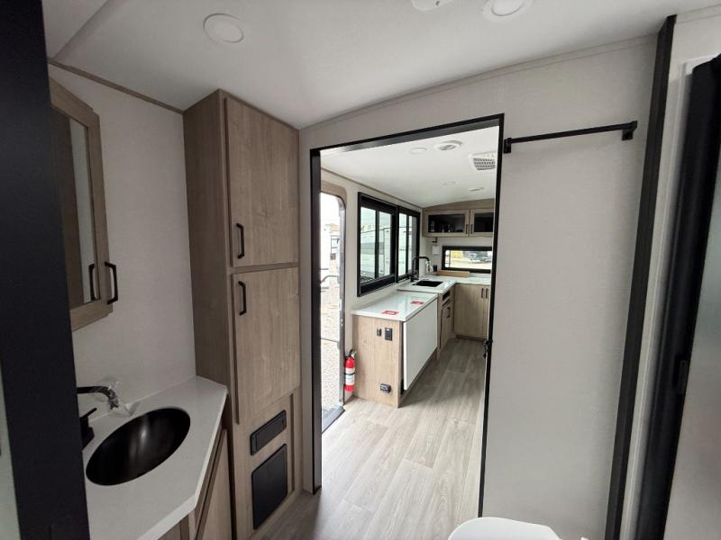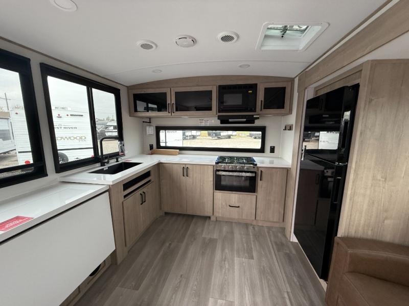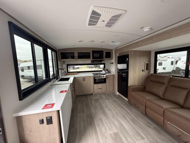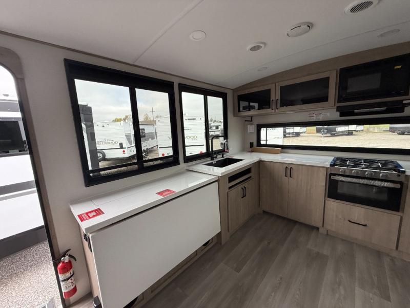 At the front of the 2700BS trailer, you’ll find a spacious full bedroom featuring a 70" x 80" king bed housed in one of two slide outs, offering both generous space and a comfortable night’s rest. The room also includes a wardrobe and dresser, providing ample storage for clothing and essentials. Moving toward the center, the walk-through bathroom boasts a 30" x 36" residential walk-in shower with a skylight, a toilet, and a sink opposite a mirrored medicine cabinet for added convenience and storage. At the rear, the open-concept kitchen and living area make excellent use of the second slide out, which includes cozy theater seating, perfect for dining or relaxing while watching TV. Next to it sits a 10-cu. ft. refrigerator, offering plenty of room for groceries and refreshments. Across the space, the L-shaped kitchen spans the entire rear wall, giving you extensive countertop room for meal prep. Equipped with a three-burner range, oven, microwave, and stainless steel sink, this kitchen allows you to cook in comfort and style without relying on campsite facilities.