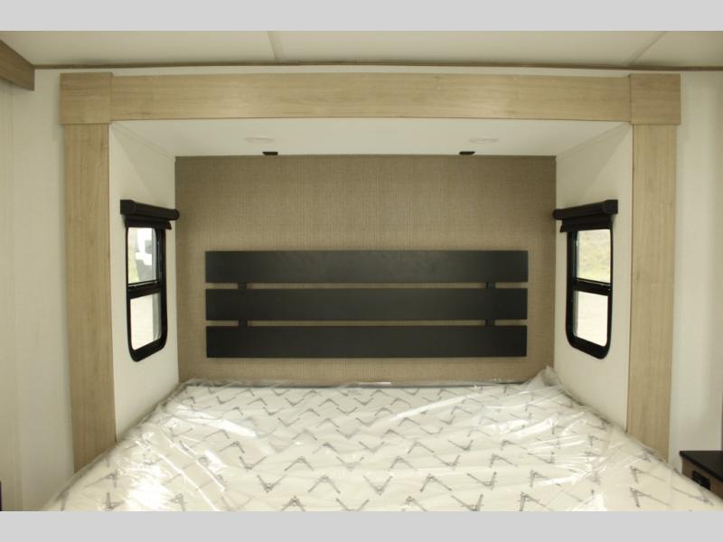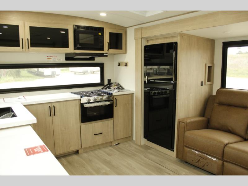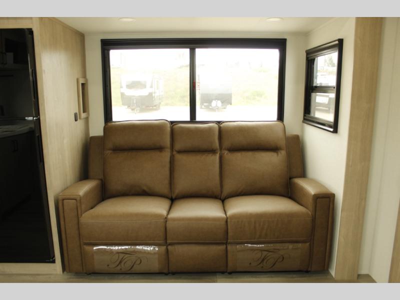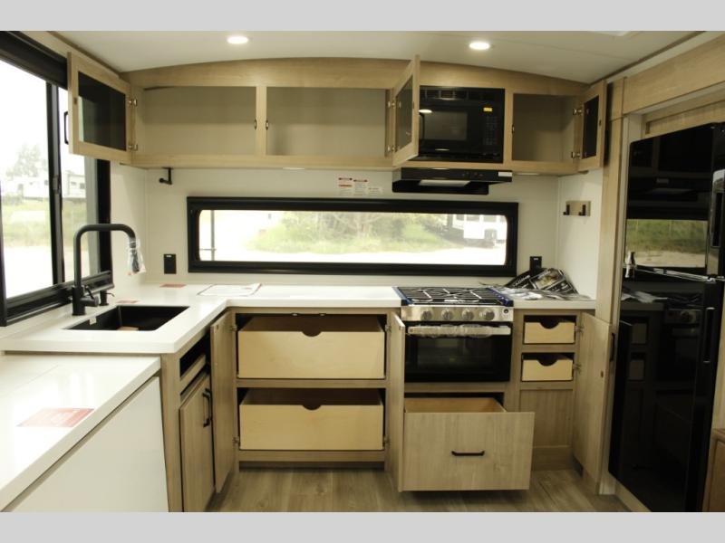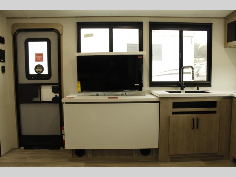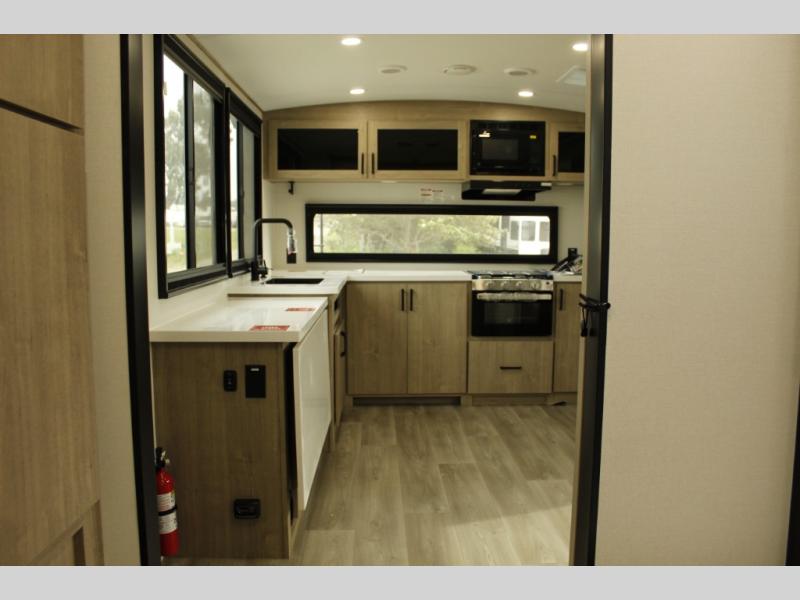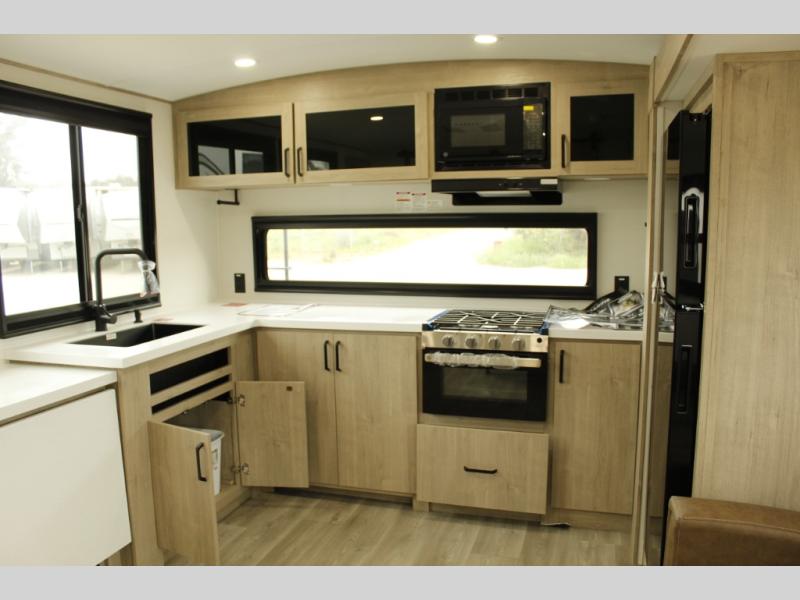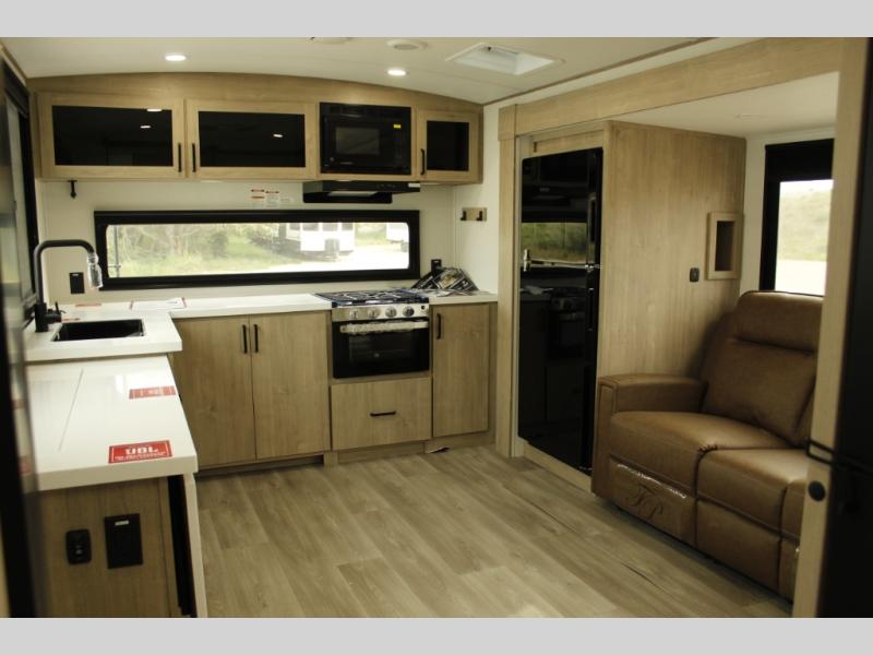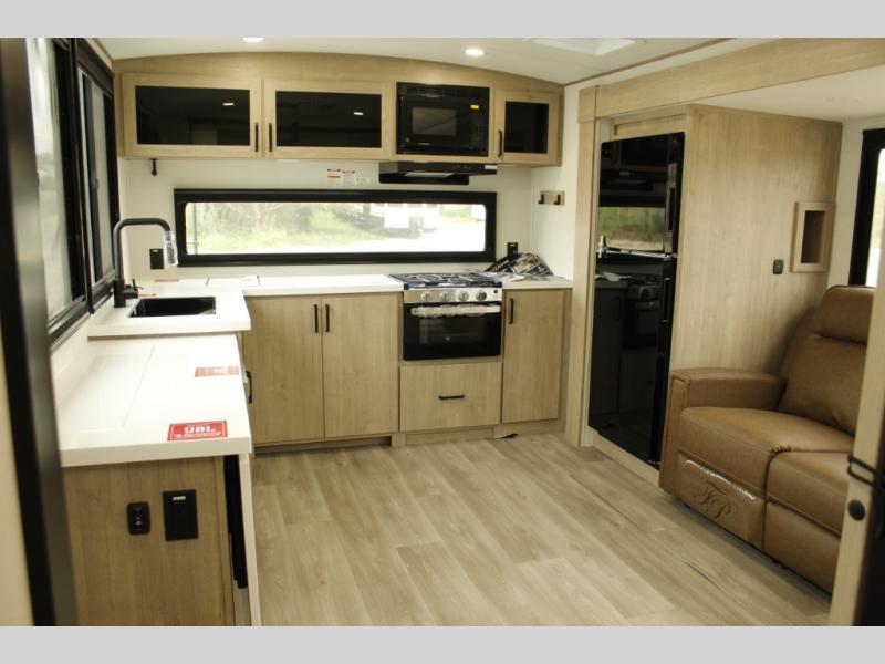 At the front of the 2700BS trailer, you’ll find a spacious full bedroom featuring a 70" x 80" king bed housed in one of two slide outs, offering both generous space and a comfortable night’s rest. The room also includes a wardrobe and dresser, providing ample storage for clothing and essentials. Moving toward the center, the walk-through bathroom boasts a 30" x 36" residential walk-in shower with a skylight, a toilet, and a sink opposite a mirrored medicine cabinet for added convenience and storage. At the rear, the open-concept kitchen and living area make excellent use of the second slide out, which includes cozy theater seating, perfect for dining or relaxing while watching TV. Next to it sits a 10-cu. ft. refrigerator, offering plenty of room for groceries and refreshments. Across the space, the L-shaped kitchen spans the entire rear wall, giving you extensive countertop room for meal prep. Equipped with a three-burner range, oven, microwave, and stainless steel sink, this kitchen allows you to cook in comfort and style without relying on campsite facilities.