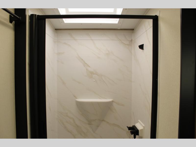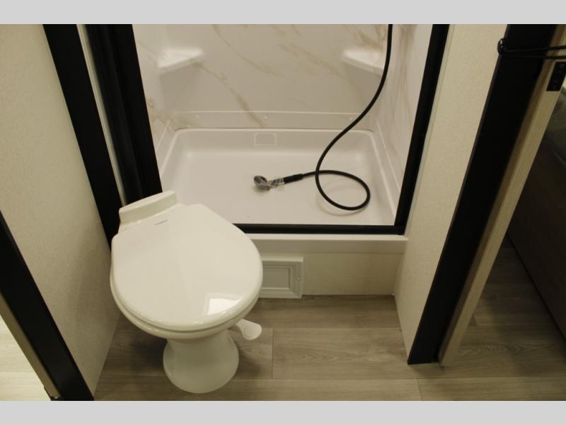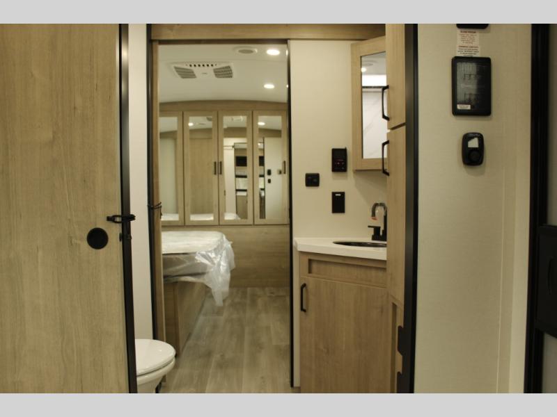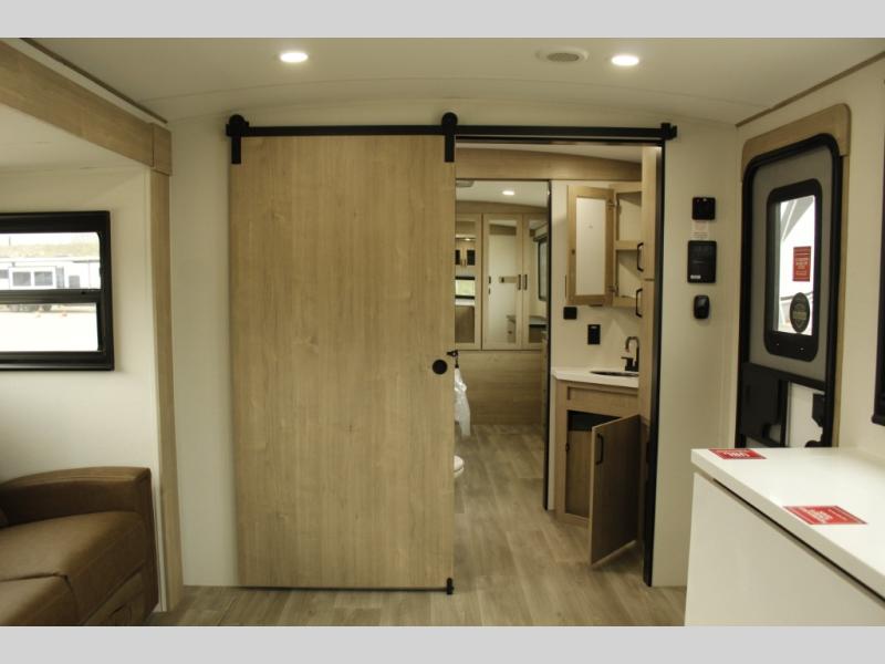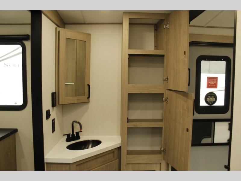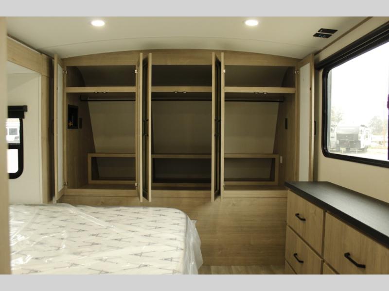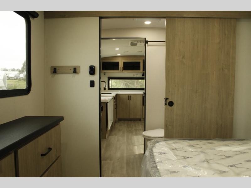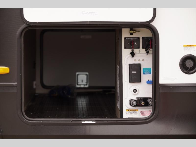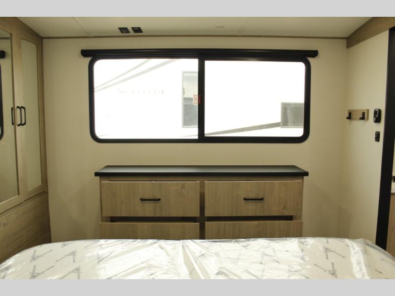 At the front of the 2700BS trailer, you’ll find a spacious full bedroom featuring a 70" x 80" king bed housed in one of two slide outs, offering both generous space and a comfortable night’s rest. The room also includes a wardrobe and dresser, providing ample storage for clothing and essentials. Moving toward the center, the walk-through bathroom boasts a 30" x 36" residential walk-in shower with a skylight, a toilet, and a sink opposite a mirrored medicine cabinet for added convenience and storage. At the rear, the open-concept kitchen and living area make excellent use of the second slide out, which includes cozy theater seating, perfect for dining or relaxing while watching TV. Next to it sits a 10-cu. ft. refrigerator, offering plenty of room for groceries and refreshments. Across the space, the L-shaped kitchen spans the entire rear wall, giving you extensive countertop room for meal prep. Equipped with a three-burner range, oven, microwave, and stainless steel sink, this kitchen allows you to cook in comfort and style without relying on campsite facilities.