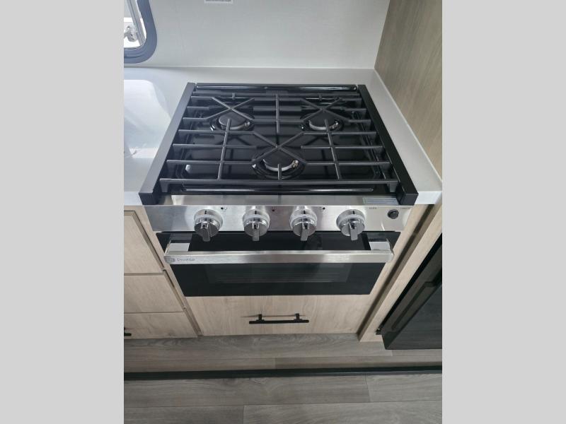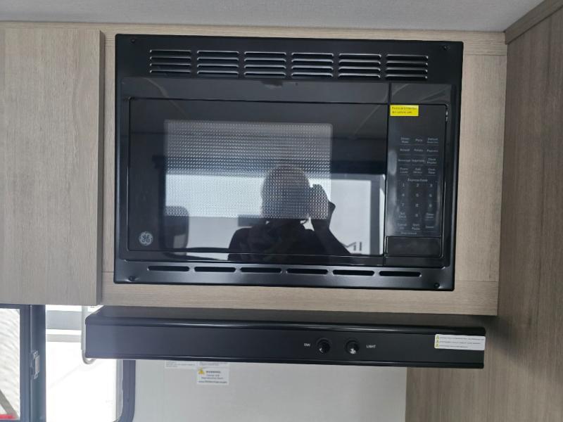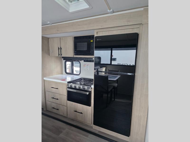 The rear living room on this Imagine travel trailer is just what you'll want when you're looking for a little down time. This room has opposing tri-fold sofas within slides, theater seating, and a LED HDTV. Another place that you can sit down at is the free-standing adjustable dinette. You can sit here with a fresh cup of coffee in the afternoon as you map out your hike for tomorrow. The kitchen offers you a flip-up countertop extension, a microwave, a three-burner range with oven, a 10-cubic foot 12V refrigerator, and pantry to help you make meals, and there is a private bedroom with a 60" x 80" bed to rest on at the end of the day.
