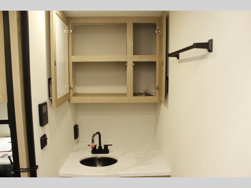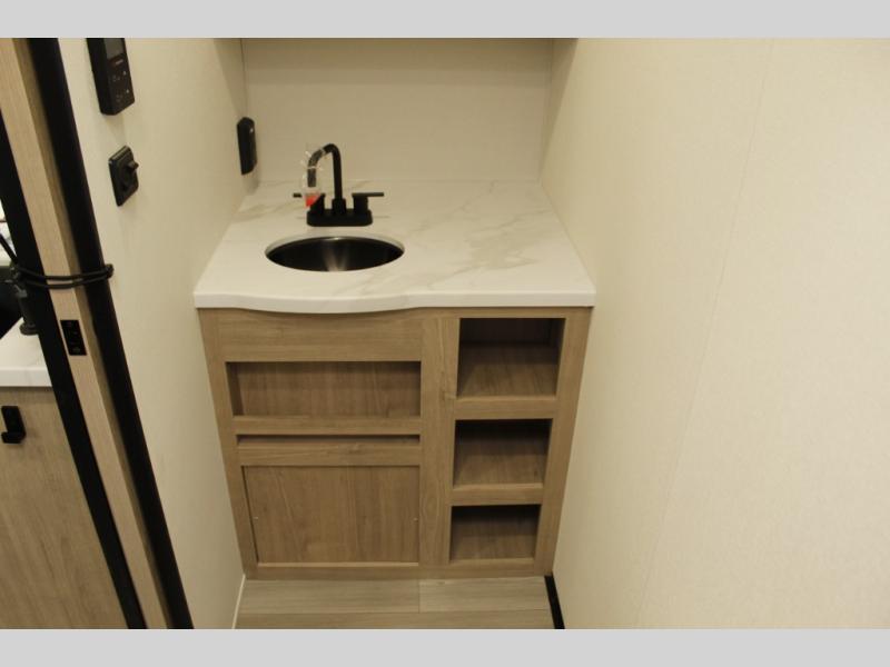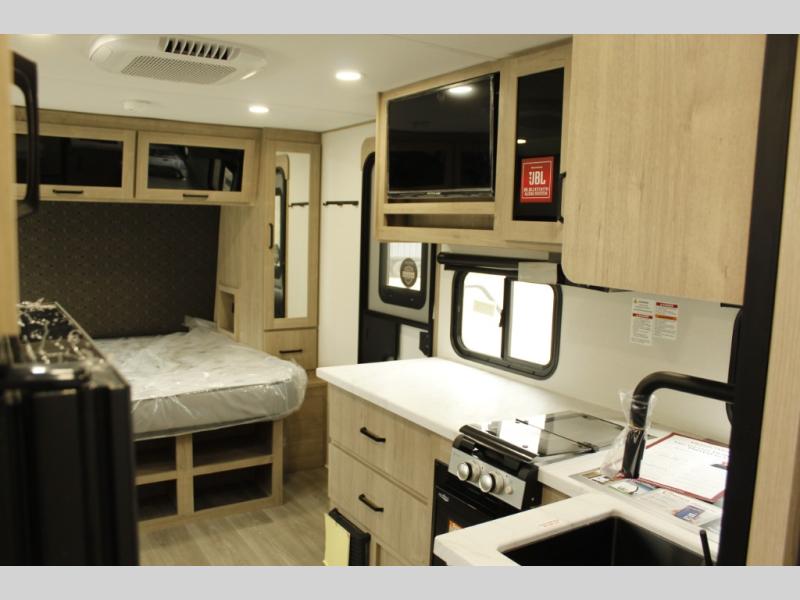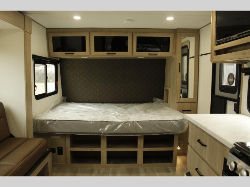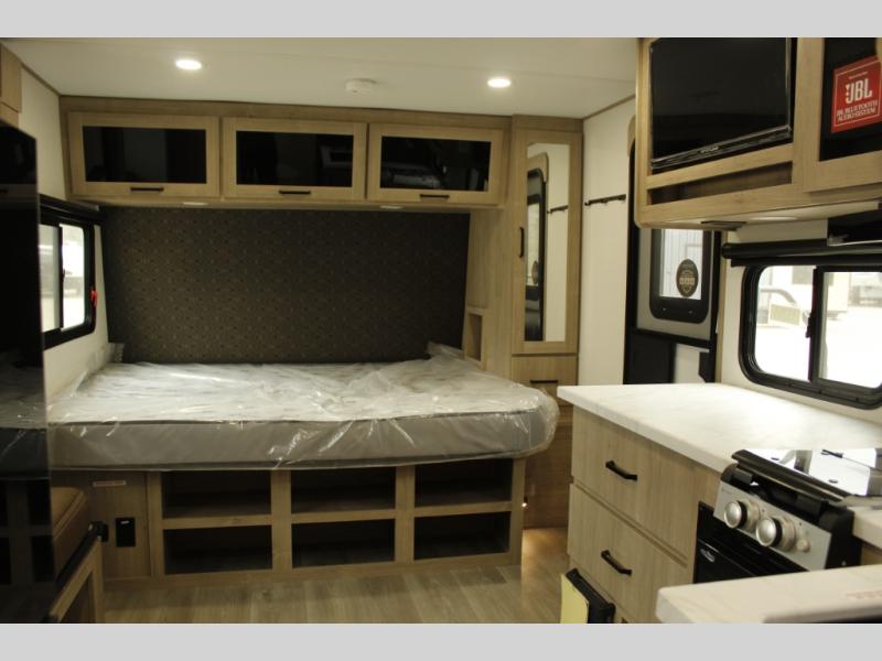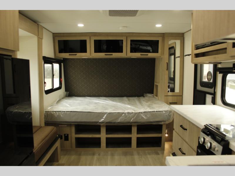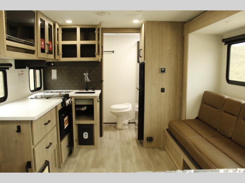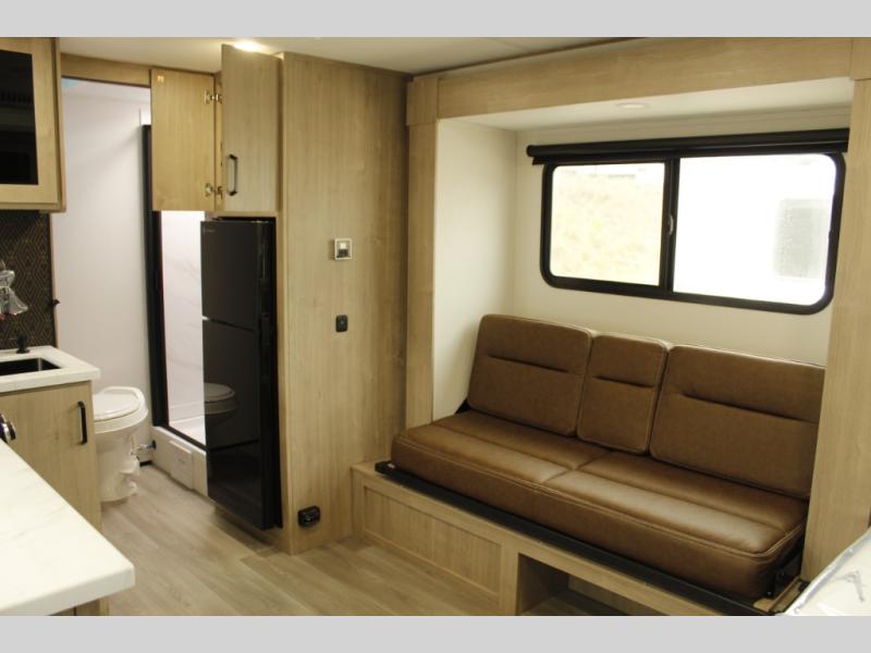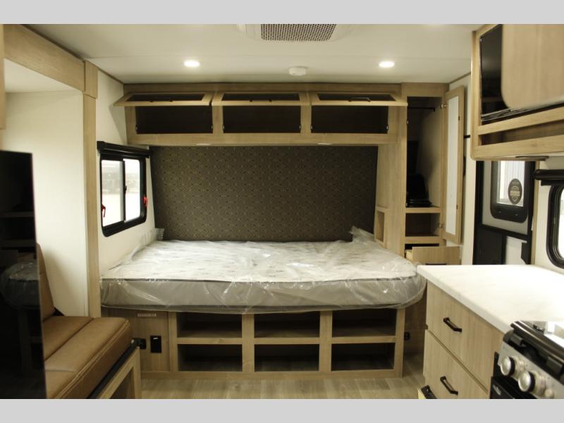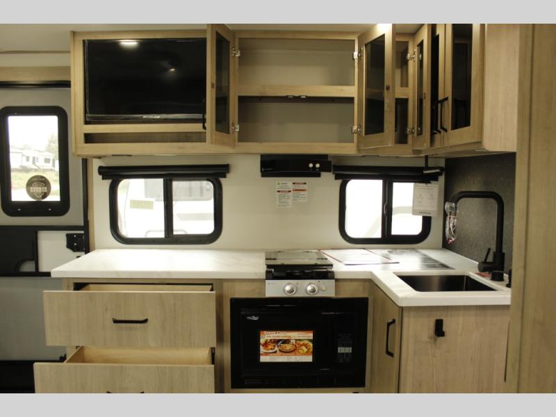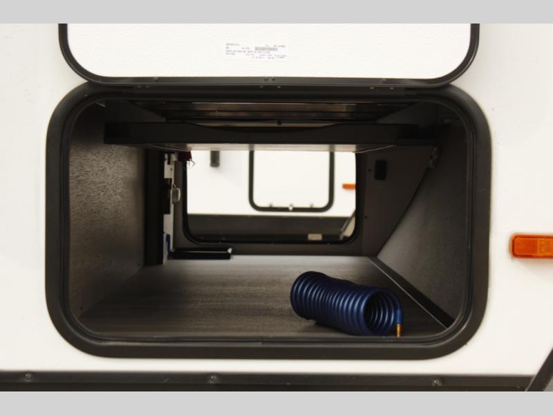Pack your bags and head out on a fun camping trip in this travel trailer! The front queen bed offers a comfortable place to sleep at night, as well as the roll-over sleeper sofa slide with shoe storage. You can make meals on the cooktop or in the convection microwave. The full rear bathroom has a walk-in shower with an oversized vanity to easily get ready each day. Outside, you'll find a spray port, an unobstructed pass-thru storage, and an interior/exterior table to use at your convenience.