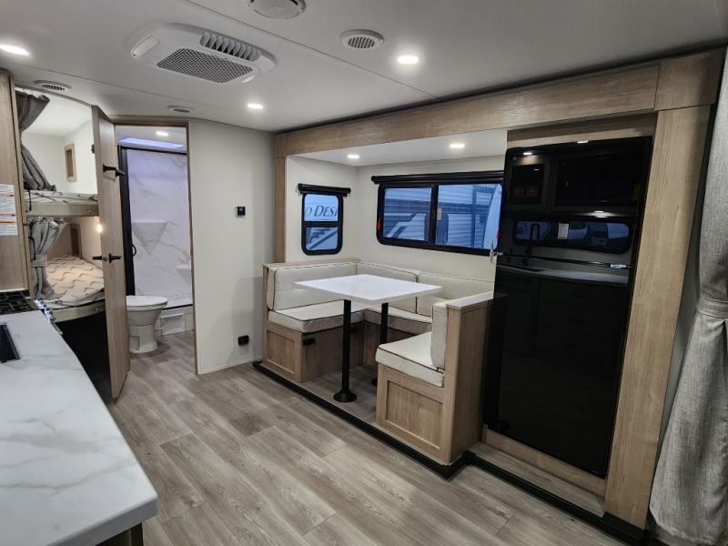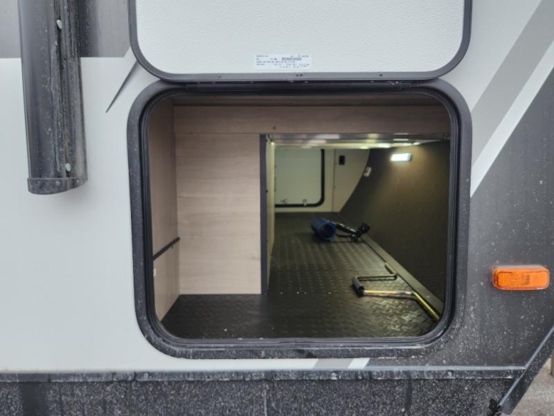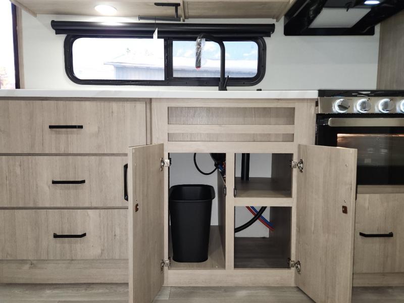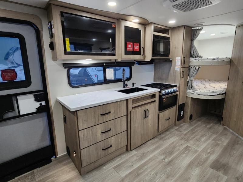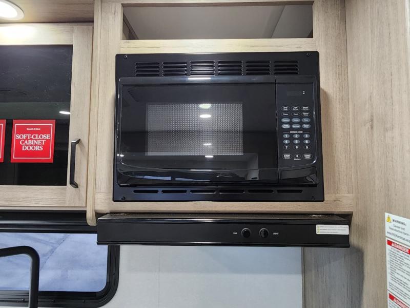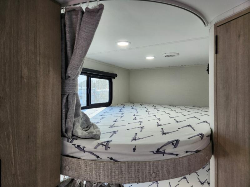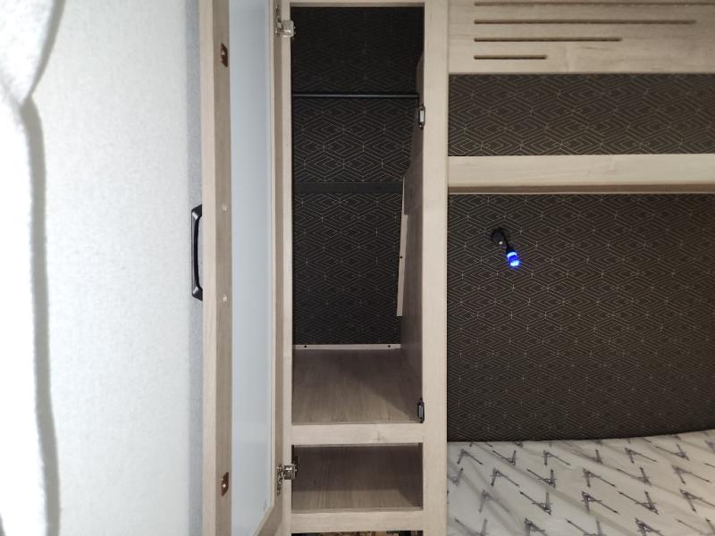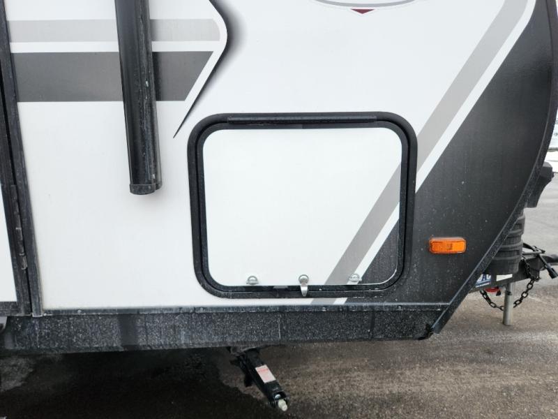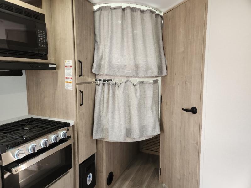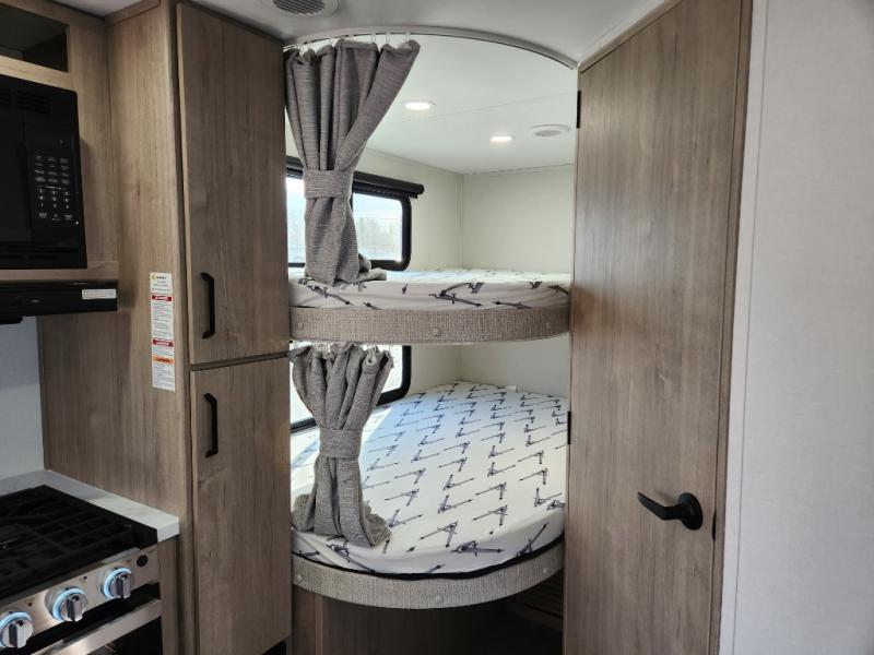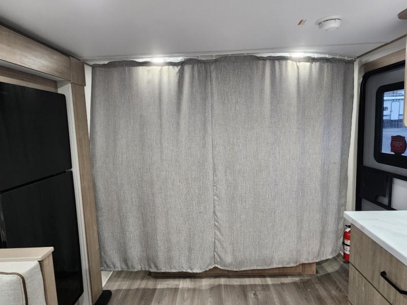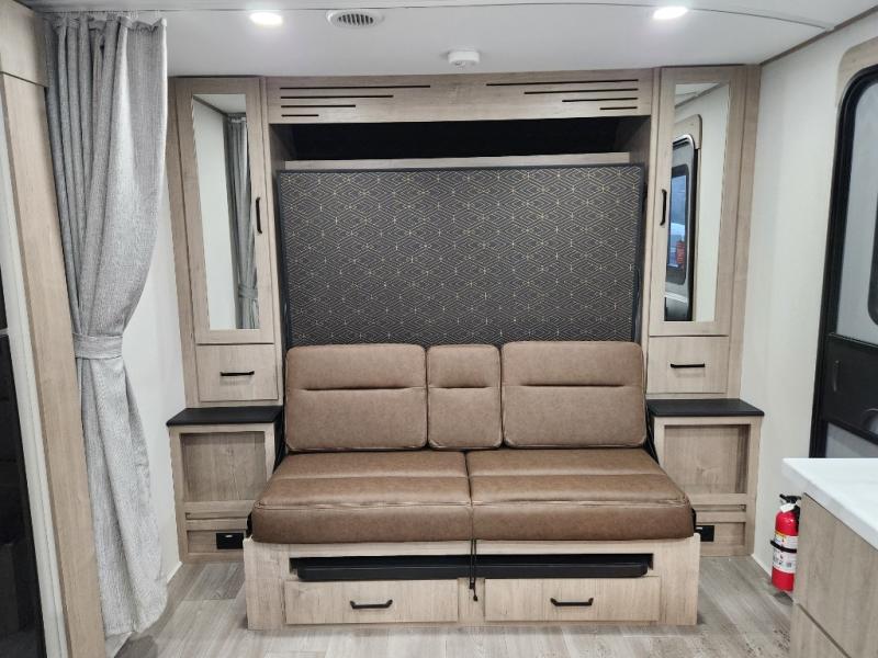 This travel trailer has everything you need for a great vacation! You will never miss home when you see all of the amenities included on this trailer. There is a full bathroom for easy morning routines, a set of 47" x 76" double over double-size bunks with privacy curtains for compact sleeping, a U-shaped dinette for meal times, and a full kitchen with all of the appliances needed for filling meals. You could even switch out the dinette for an optional theater dinette. The front Murphy bed not only provides versatility with a bed to sleep on at night, and a seating area during the day, but also a removable interior/exterior table. In addition to all of that, you'll also find an outdoor griddle and 1.6 cu. ft. refrigerator that you can use when the weather is nice. The unobstructed pass-through storage will be able to store your fishing poles and sports equipment while you travel.