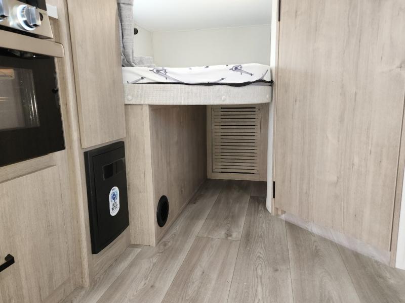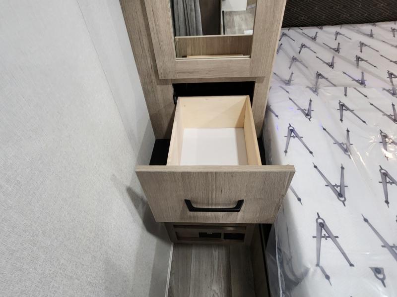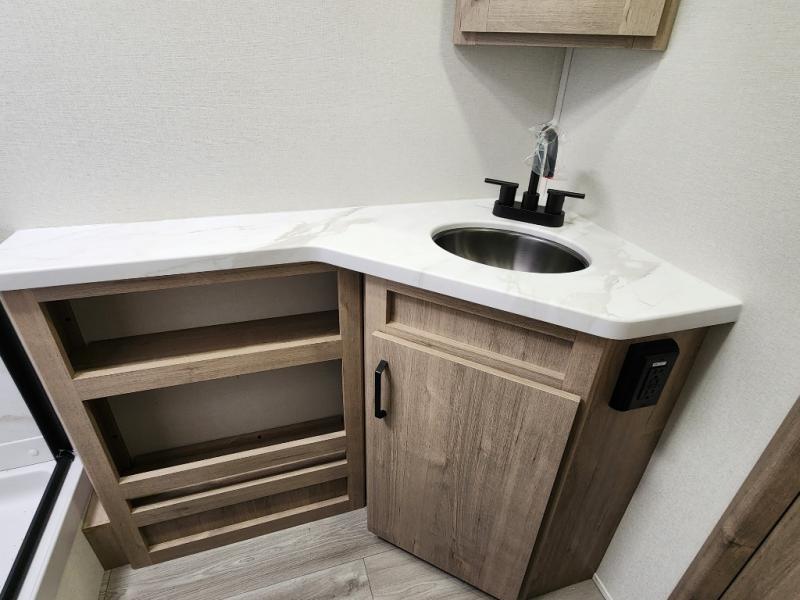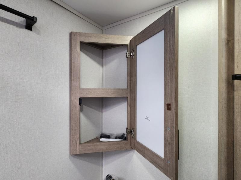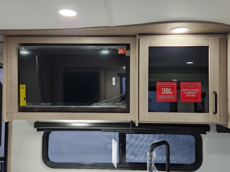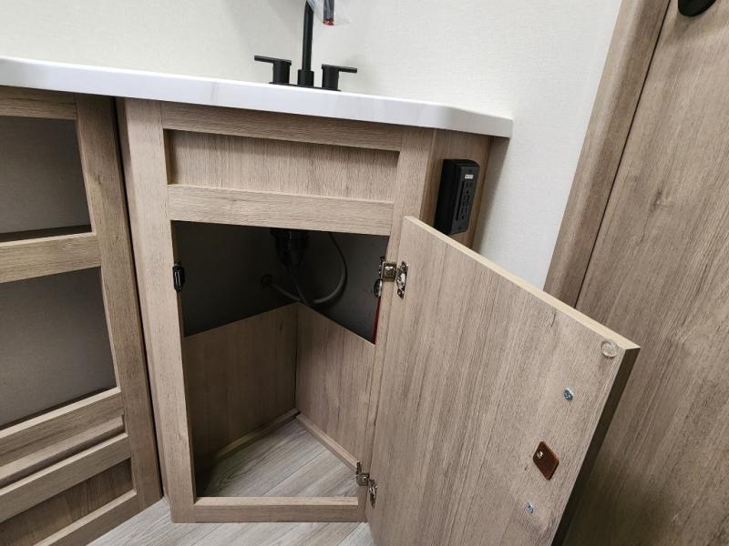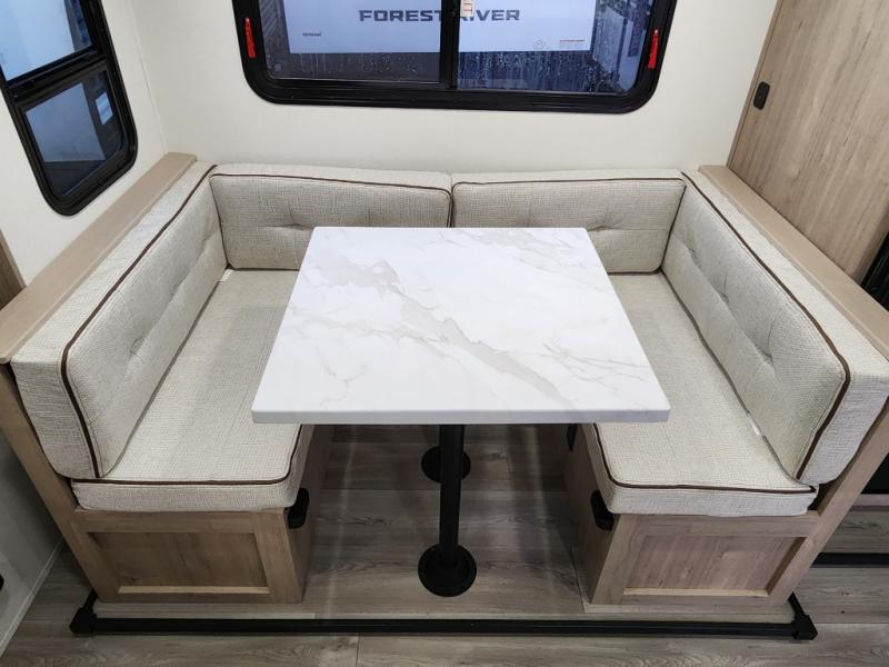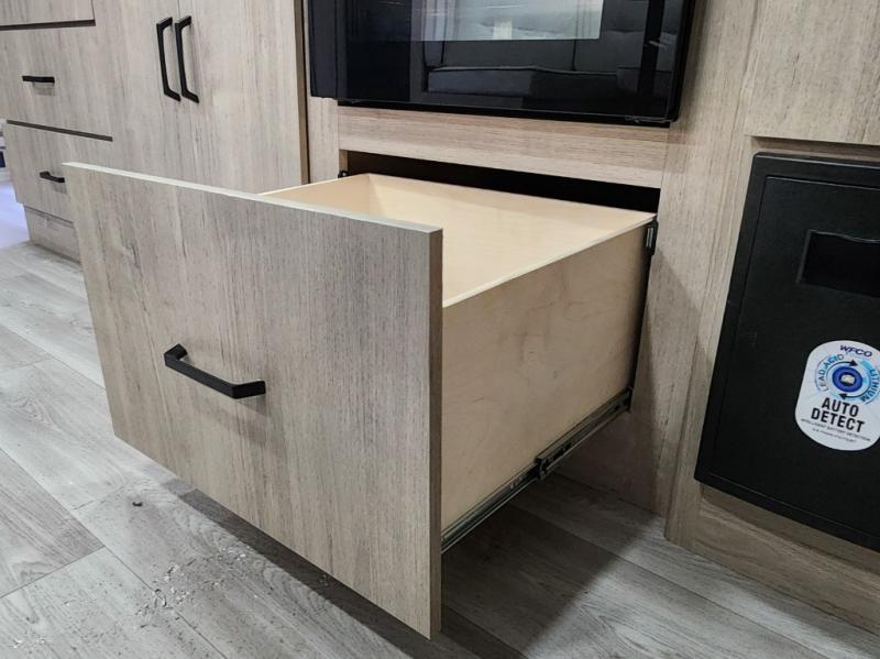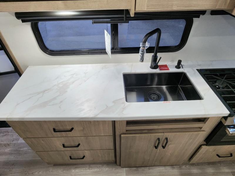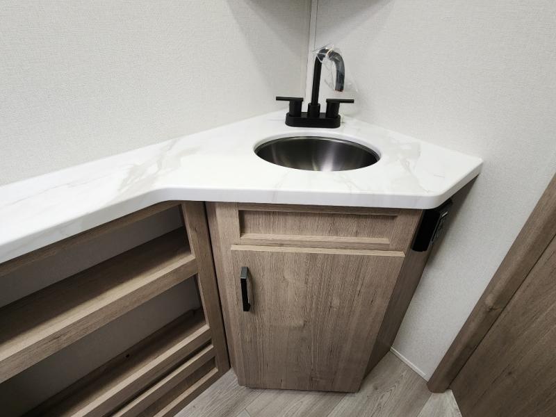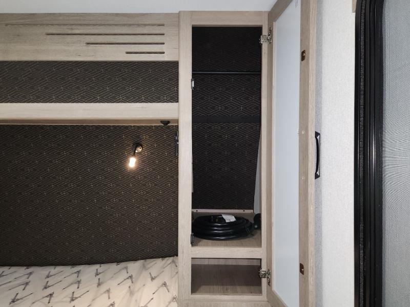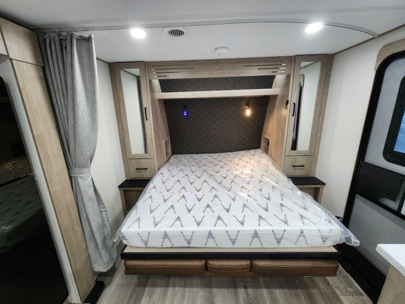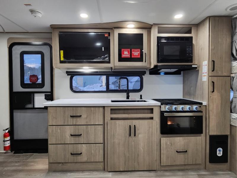 This travel trailer has everything you need for a great vacation! You will never miss home when you see all of the amenities included on this trailer. There is a full bathroom for easy morning routines, a set of 47" x 76" double over double-size bunks with privacy curtains for compact sleeping, a U-shaped dinette for meal times, and a full kitchen with all of the appliances needed for filling meals. You could even switch out the dinette for an optional theater dinette. The front Murphy bed not only provides versatility with a bed to sleep on at night, and a seating area during the day, but also a removable interior/exterior table. In addition to all of that, you'll also find an outdoor griddle and 1.6 cu. ft. refrigerator that you can use when the weather is nice. The unobstructed pass-through storage will be able to store your fishing poles and sports equipment while you travel.