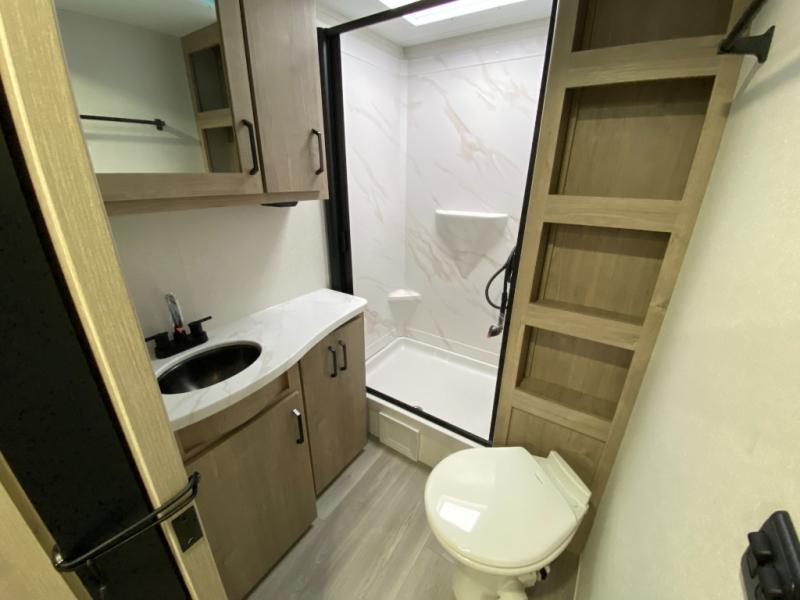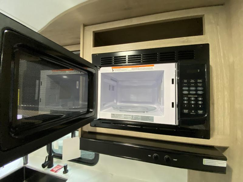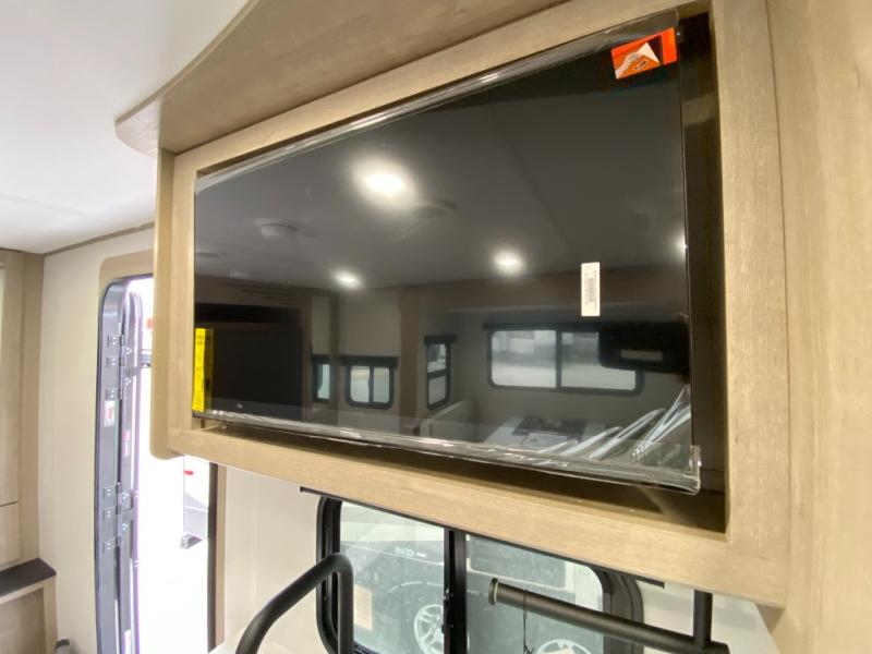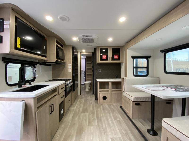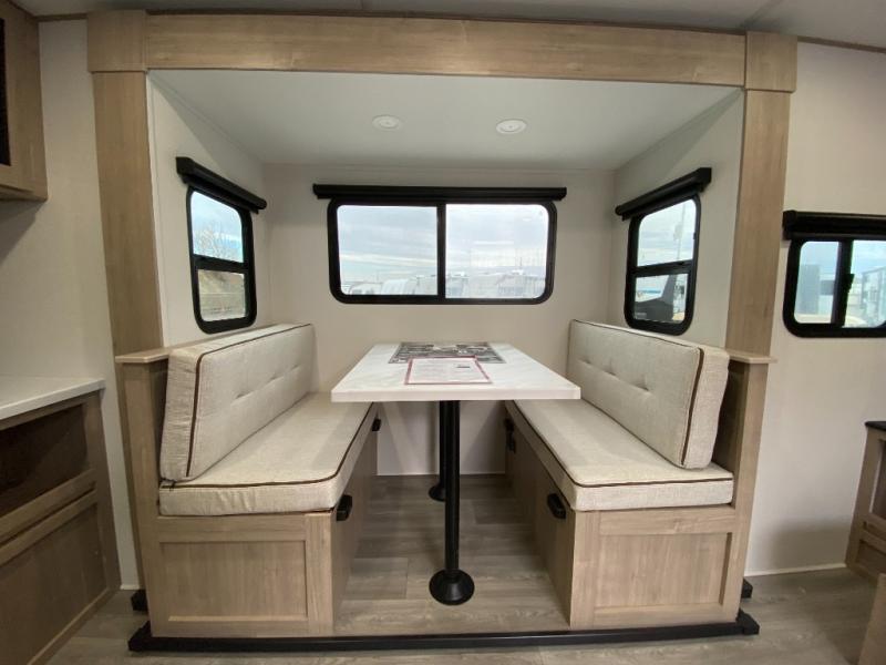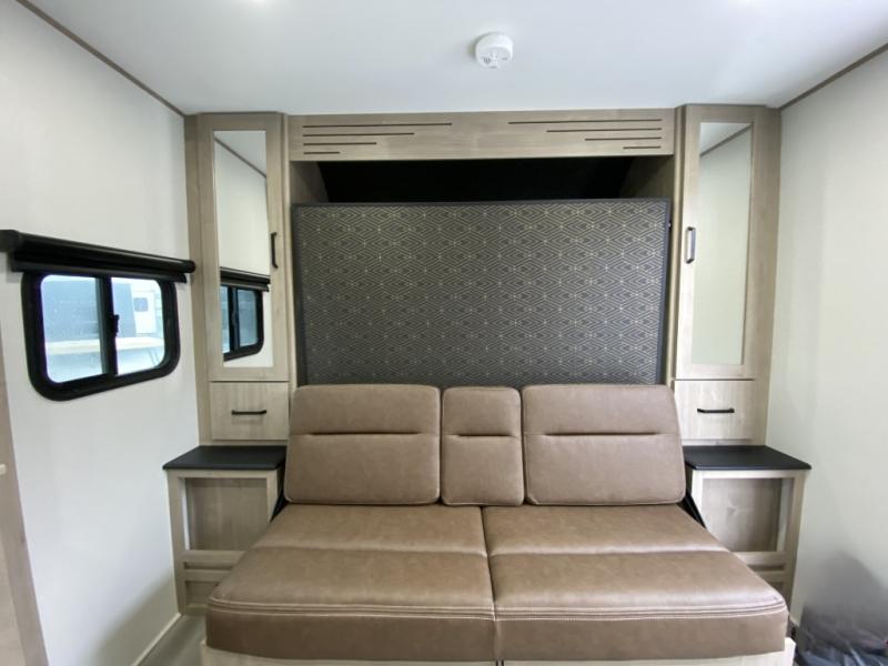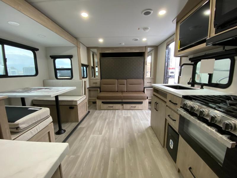 Your family will love camping in this spacious and versatile trailer thanks to the double slides and Murphy bed provided. During the day the Murphy bed is tucked away to provide more space and seating, and at night when folded down, there is a curtain for some privacy as you sleep. The booth dinette slides out to provide even more space and features windows on three sides so you can look out at your surroundings while you enjoy breakfast. The 30" flip top and bottom bunks each have some privacy with the sliding door, and the bunks are right next to the full bathroom for easy access in the middle of the night. The kitchen features everything you need to create meals and snacks as you travel, and you can have some more prep space by using the flip-up countertop extension.