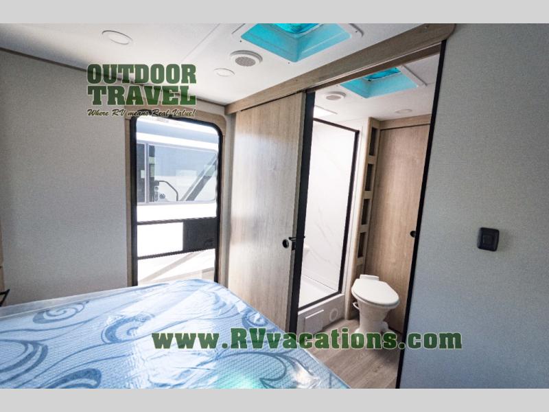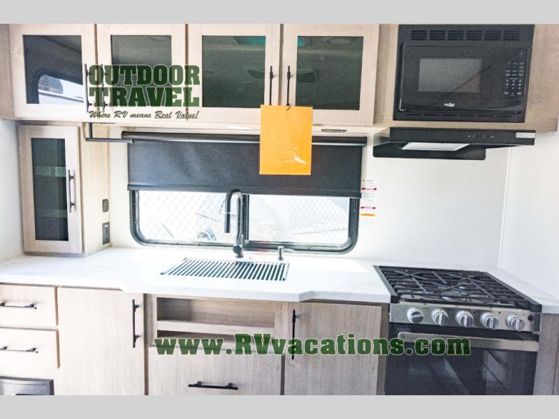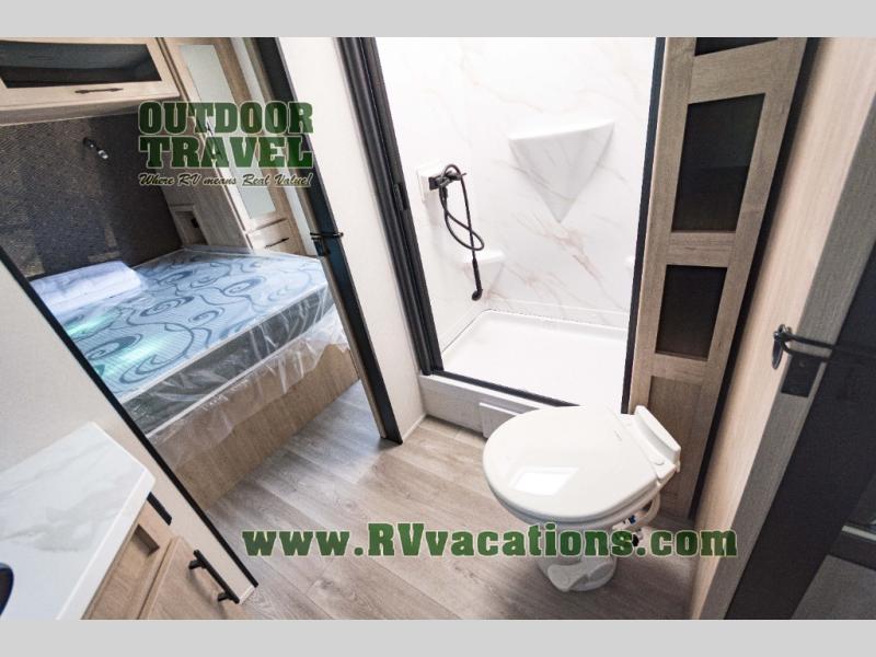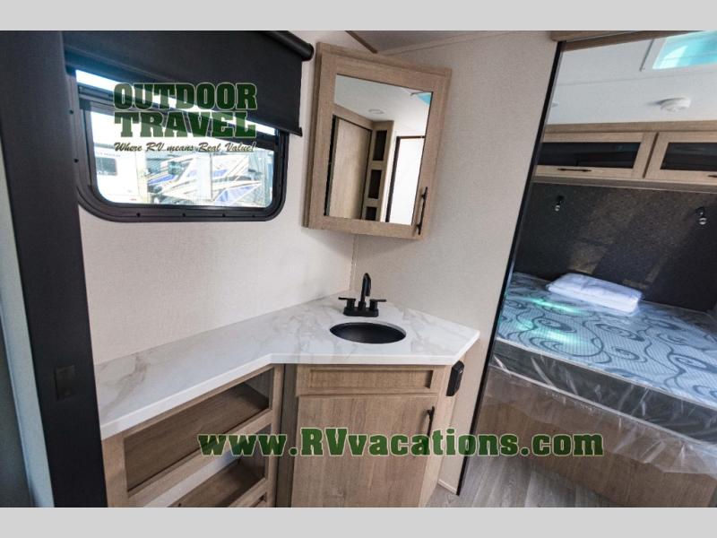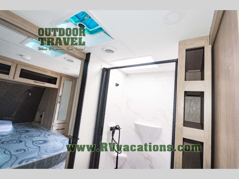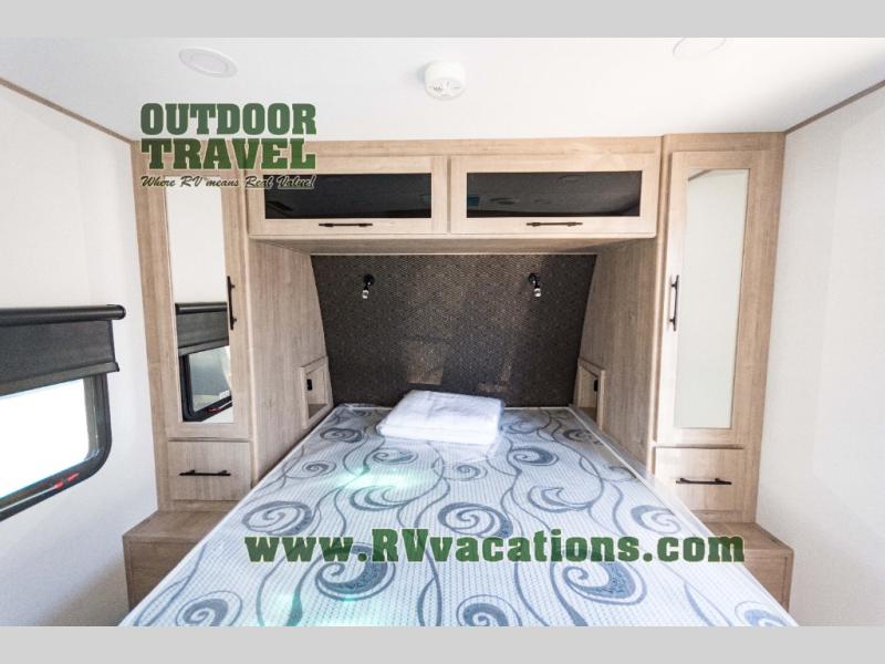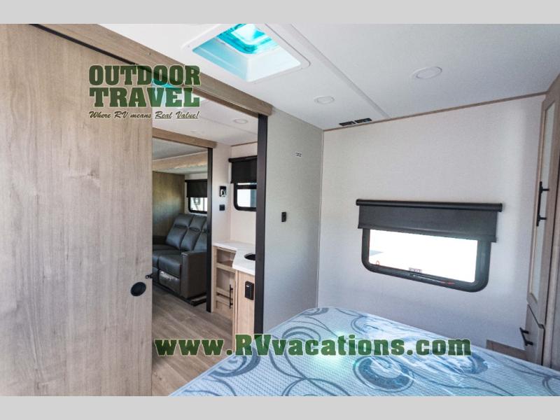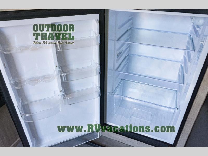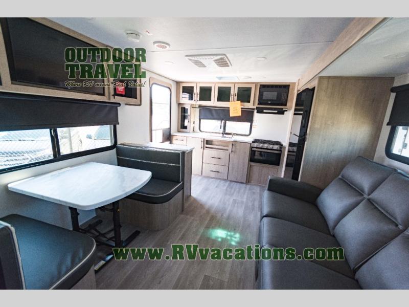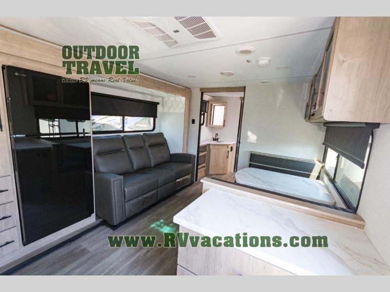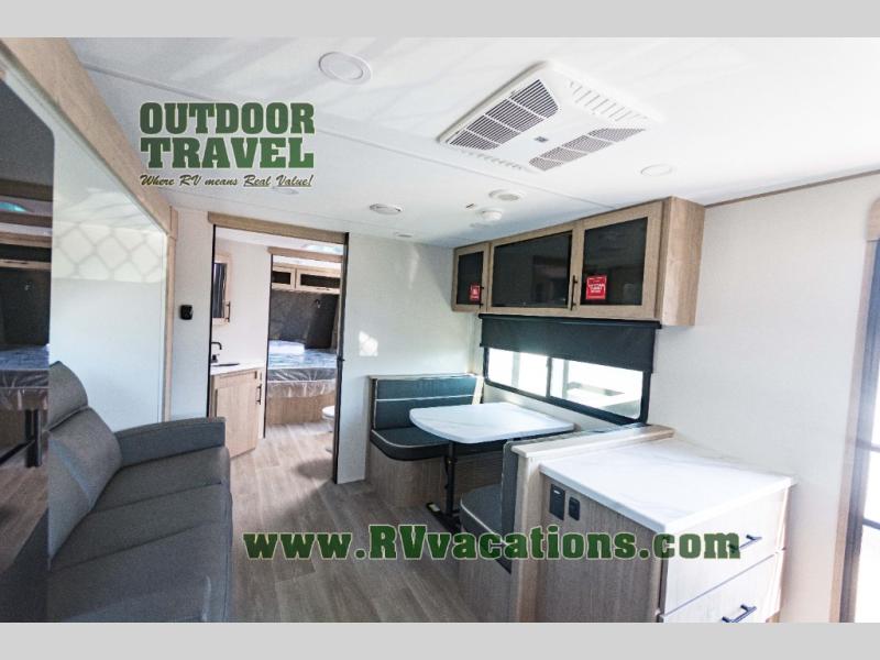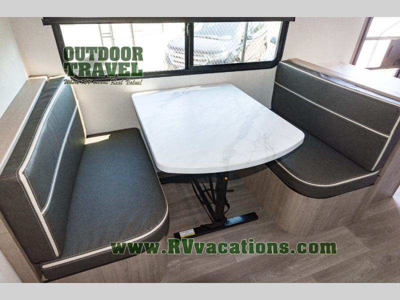 Treat yourself to a weekend of fun in this Imagine XLS travel trailer! Whether it's just you and your spouse, or you've chosen to bring along a group of friends, this trailer will meet the need. The front bedroom can sleep two people on the walk-around queen-size bed. The bedroom is quite functional because it not only contains the second exterior entry door, but it also has a private entrance into the walk-through bathroom since it is located on the other side of the bathroom. The booth dinette is functional too because it can transform from a dining location into a sleeping location, and the theater seating is directly across from the LED TV for easy viewing.