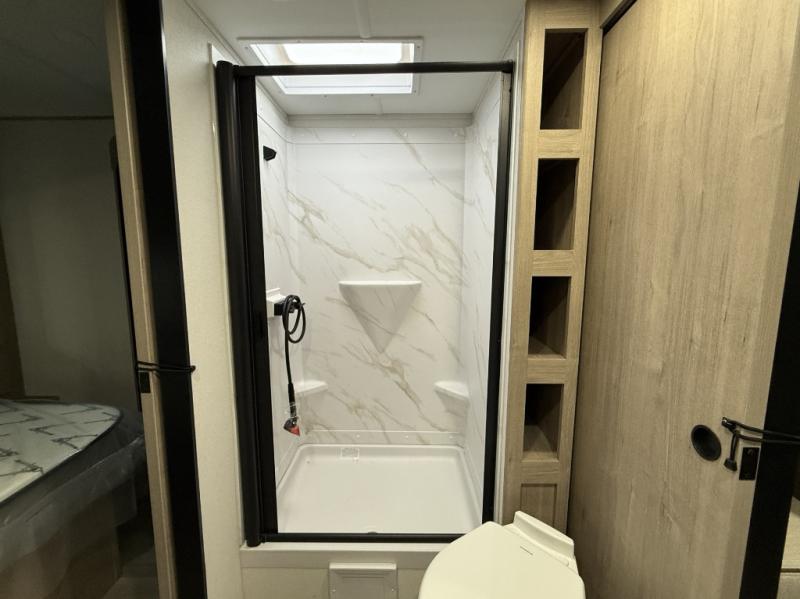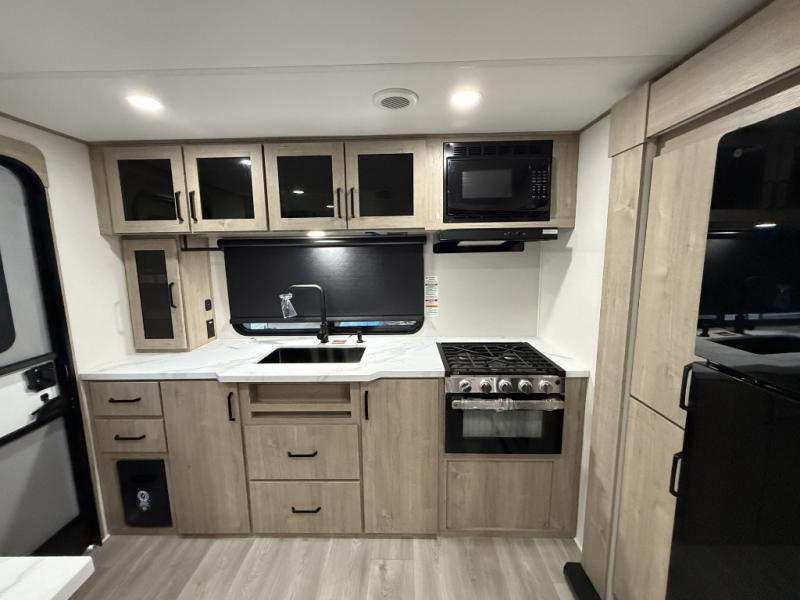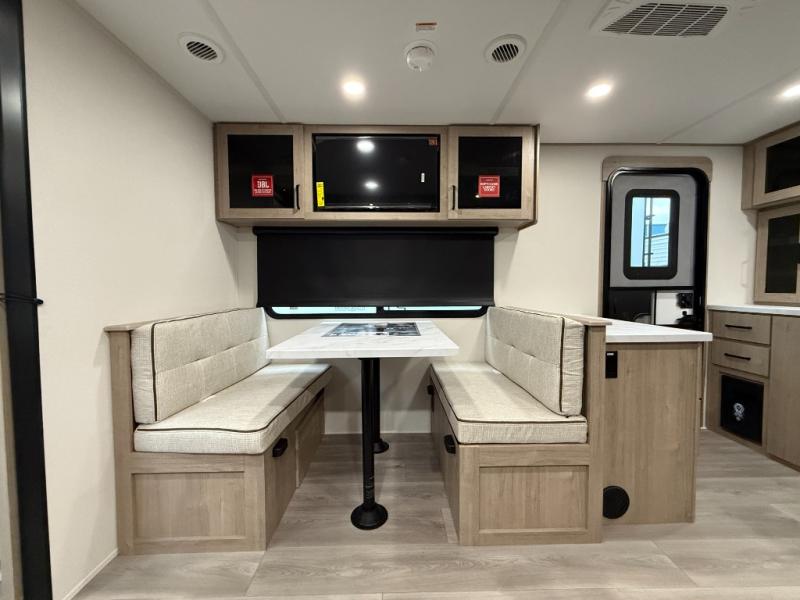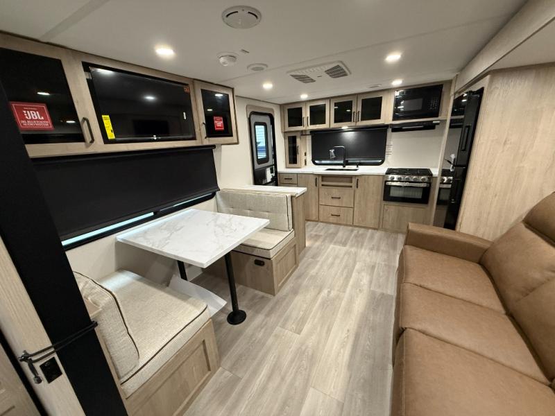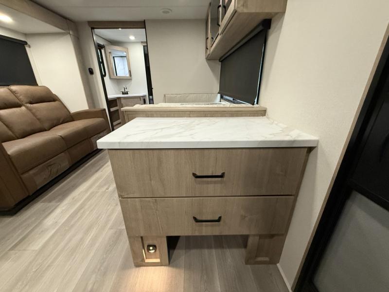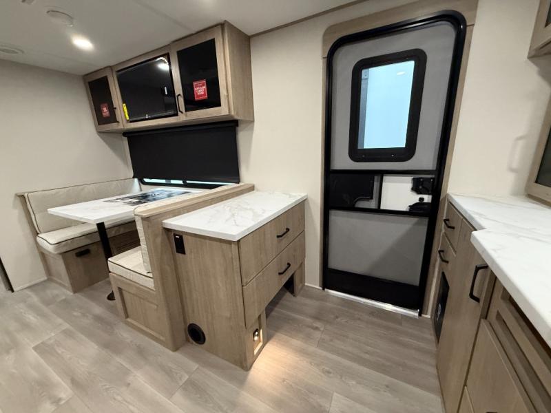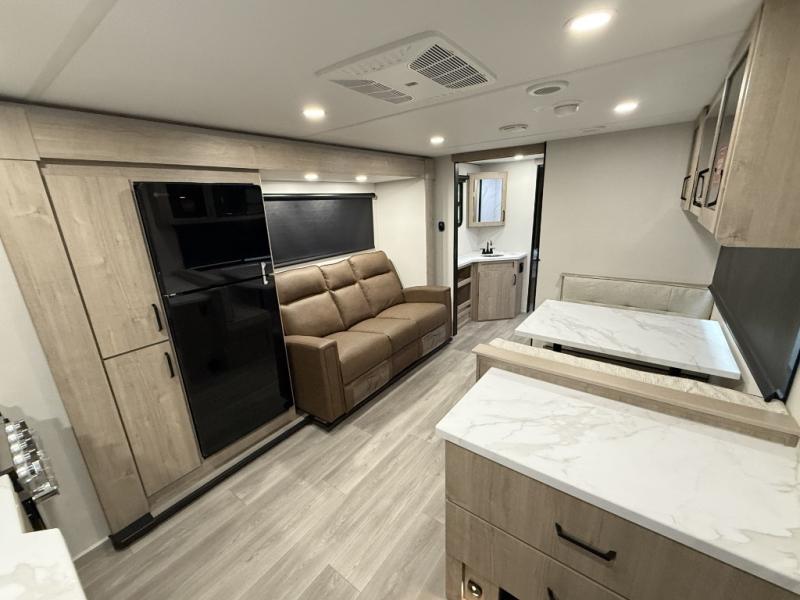 Treat yourself to a weekend of fun in this Imagine XLS travel trailer! Whether it's just you and your spouse, or you've chosen to bring along a group of friends, this trailer will meet your needs. The front bedroom can sleep two people on the walk-around queen-size bed. The bedroom is quite functional because it not only contains the second exterior entry door, but it also has a private entrance into the walk-through bathroom since it is located on the other side of the bathroom. The booth dinette is functional too because it can transform from a dining location into a sleeping location, and the theater seating is directly across from the LED TV for easy viewing. The rear kitchen is fit for the chef on the trip, it features residential countertops, a stainless-steel sink and a 3-burner range with oven for you to cook your meals in comfort.