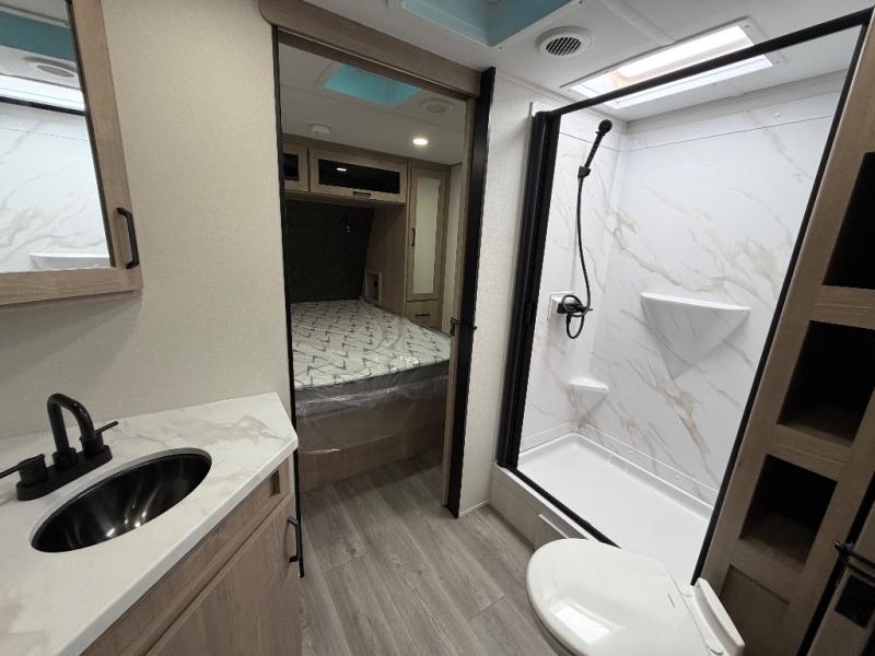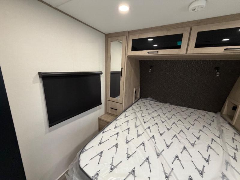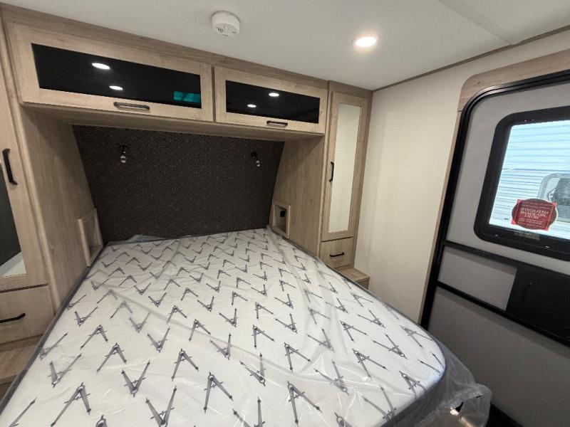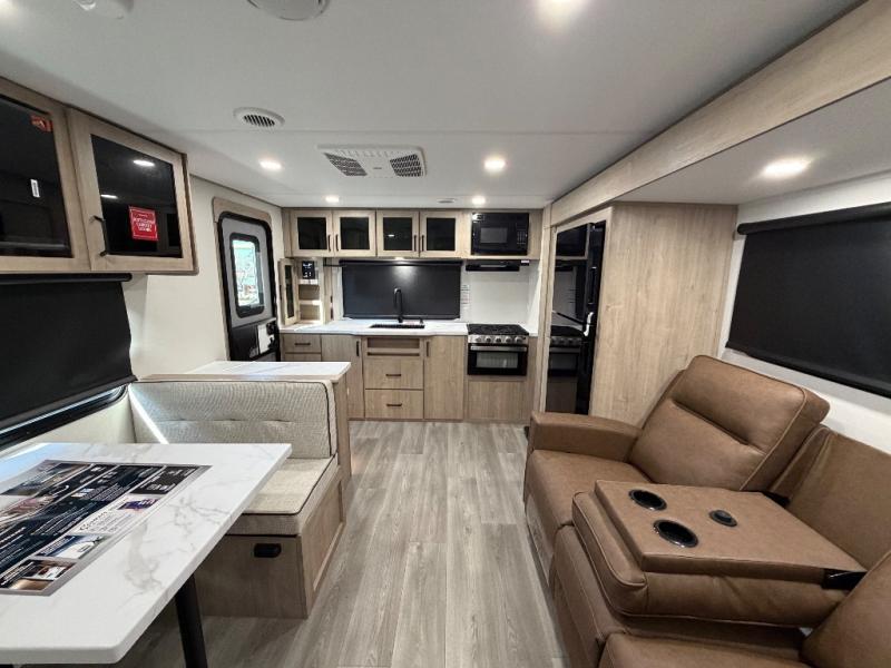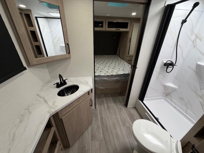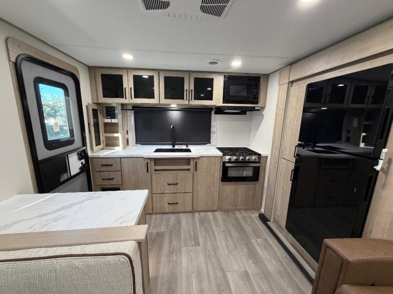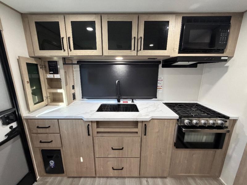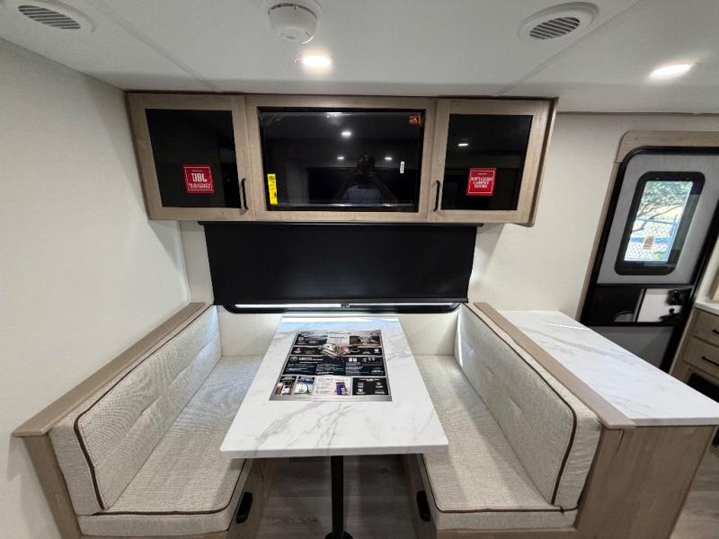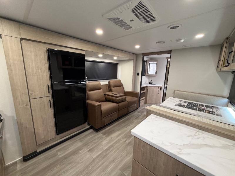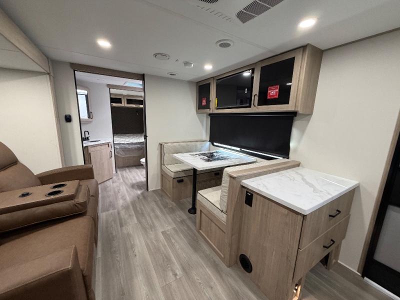 Treat yourself to a weekend of fun in this Imagine XLS travel trailer! Whether it's just you and your spouse, or you've chosen to bring along a group of friends, this trailer will meet your needs. The front bedroom can sleep two people on the walk-around queen-size bed. The bedroom is quite functional because it not only contains the second exterior entry door, but it also has a private entrance into the walk-through bathroom since it is located on the other side of the bathroom. The booth dinette is functional too because it can transform from a dining location into a sleeping location, and the theater seating is directly across from the LED TV for easy viewing. The rear kitchen is fit for the chef on the trip, it features residential countertops, a stainless-steel sink and a 3-burner range with oven for you to cook your meals in comfort.