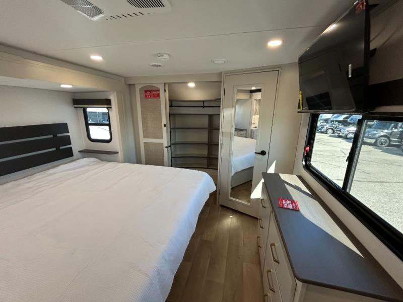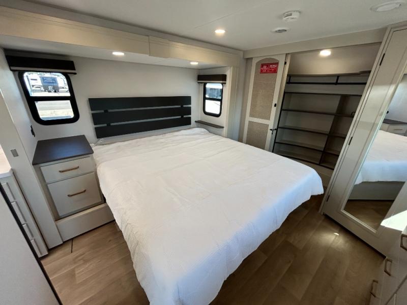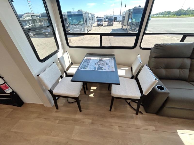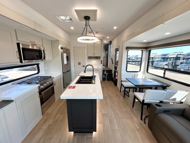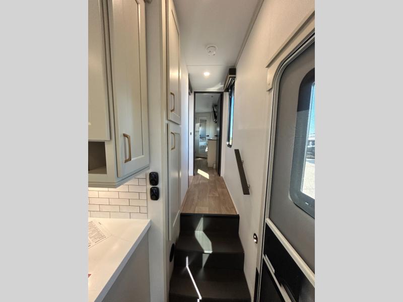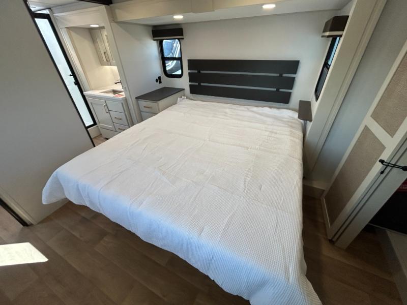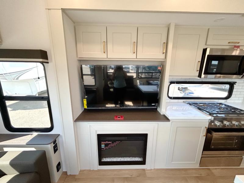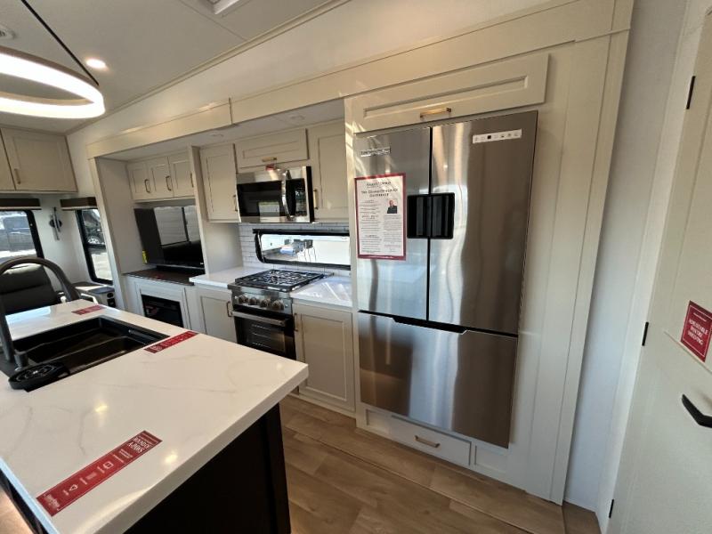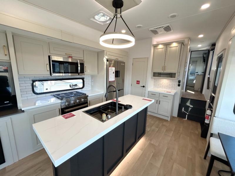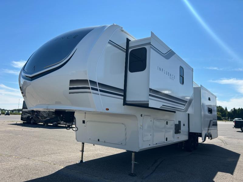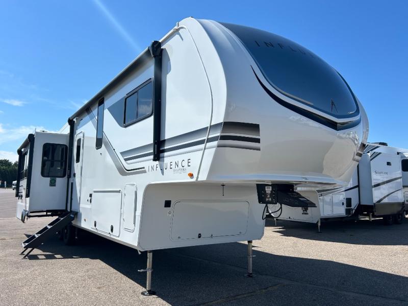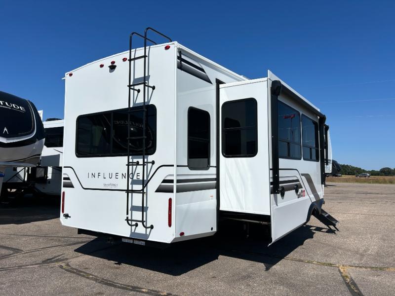 Any Grand Design Influence fifth wheel features five-sided aluminum cage construction with a walk-on roof and a fully enclosed underbelly with heated tanks and storage for all weather camping. For peace of mind, the MORryde CRE3000 Suspension system will provide safe and smooth towing, and the 101" widebody construction offers all the room you need and that is before multiple slides are fully engaged. You will appreciate the Keyed-Alike locks, slam-latch baggage doors with magnetic door catches, exterior security light, and SolidStep entry steps. On the inside, Congoleum flooring, premium roller shades for privacy, a hallway handrail for safety, and nightstands with USB ports to keep all of your electronics fully charged. You will also love the On Demand tankless water heater when showering, plus the added heat and ambiance from an electric fireplace, and so much more!