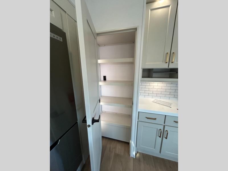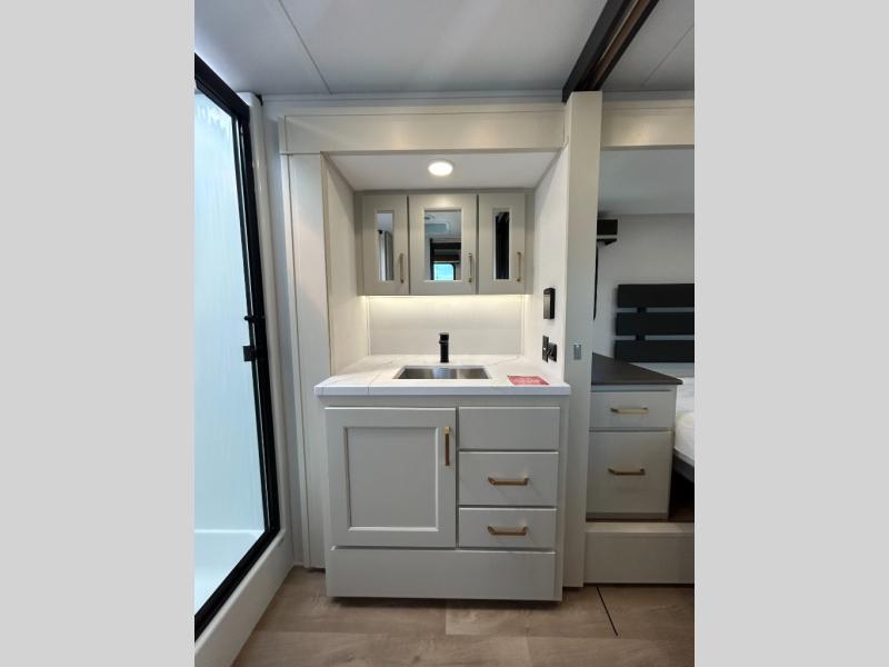 A perfect couples coach featuring triple slides and a tri-fold sofa just in case you want to have overnight guests! You will love the spacious interior thanks to the dual opposing slides in the main living and kitchen area. Here you will find a kitchen island in the center and plenty of seating with a free standing dinette, theater seating for movie night opposite the fireplace and entertainment center, as well as a tri-fold sofa. The kitchen offers all of the amenities just like home, a 16 cu. ft. 12-volt refrigerator for your perishables, and a pantry and hutch nearby for dry goods and dishes. There is even a pet dish under the refrigerator for your furry friends. The center island offers added counter space and a sink for dishes and prep work. Head up the steps to your private front bedroom with queen bed slide, and bathroom with dual entry. You even have washer/dryer prep in case you wish to add the units and enjoy even more at-home conveniences!