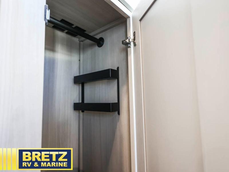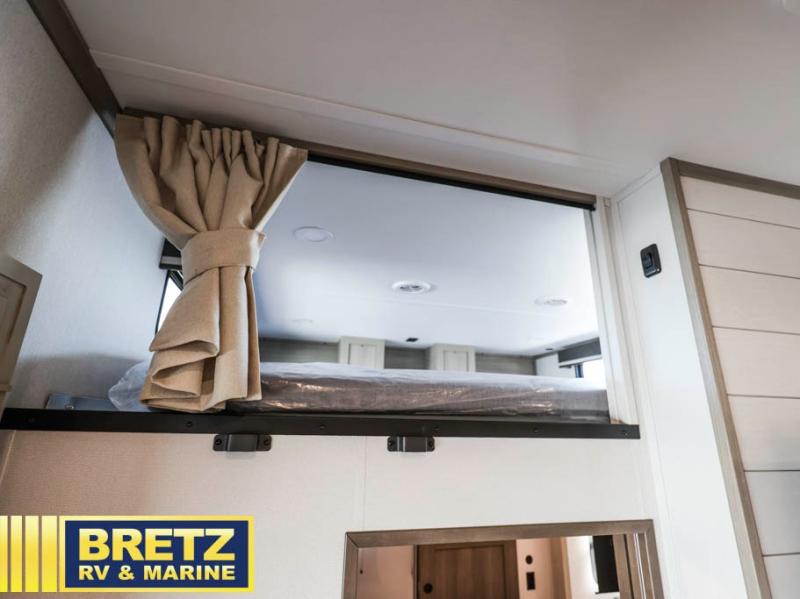 Grab the whole gang and head out in this fifth wheel featuring two private bedrooms, two full baths, and quad slides for even more space in this widebody layout. The living area featuring dual opposing slides offers space to dine and relax including an L-shaped sofa with recliners opposite the entertainment center and fireplace. You'll also love the full kitchen with ample counter space, a spice rack above the microwave, a pull-out pet dish, and more convenient features. The front master bedroom includes a queen bed with an optional king bed, a private entrance into the dual entry bath, plus a slide out with the wardrobe and bath sink. And your guests can take the second master bedroom with a folding queen bed slide, washer and dryer prep, a full rear bath, and even a loft above for more sleeping space!