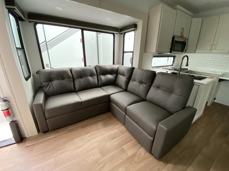 Any Grand Design Influence fifth wheel features five-sided aluminum cage construction with a walk-on roof and a fully enclosed underbelly with heated tanks and storage for all weather camping. For peace of mind, the MORryde CRE3000 Suspension system will provide safe and smooth towing, and the 101" widebody construction offers all the room you need and that is before multiple slides are fully engaged. You will appreciate the Keyed-Alike locks, slam-latch baggage doors with magnetic door catches, exterior security light, and SolidStep entry steps. On the inside, Congoleum flooring, premium roller shades for privacy, a hallway handrail for safety, and nightstands with USB ports to keep all of your electronics fully charged. You will also love the on demand tankless water heater when showering, plus the added heat and ambiance from an electric fireplace, and so much more!