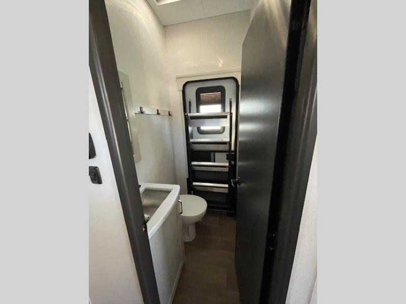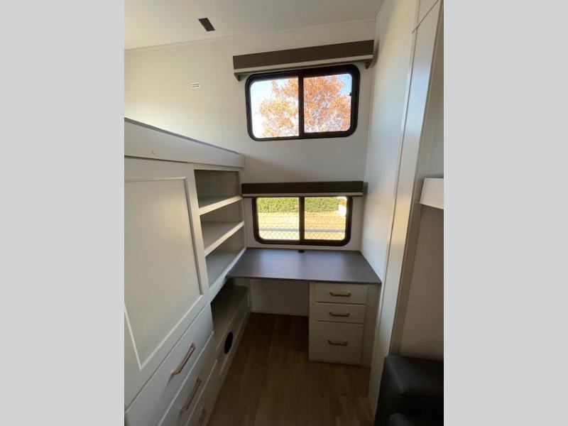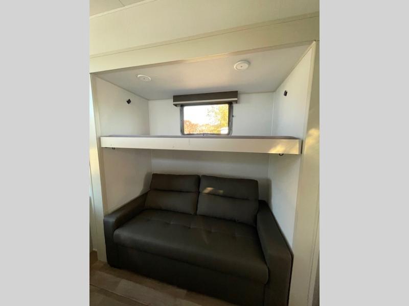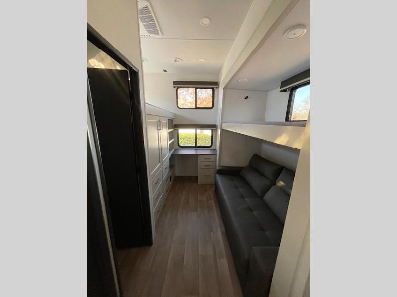 Your whole crew will love camping in this spacious fifth wheel! There is a rear private bunkhouse with a tri-fold sofa and fold-down bunk within a slide, plus a second bunk, storage space, and even a half bath with one of the dual entry doors to the unit for added convenience! You'll find your own space in the front private bedroom, complete with a queen bed slide out, a pass-thru clothes hamper that goes directly into the full bath, plus washer and dryer prep if you choose to add these appliances. A U-shaped kitchen includes ample counter space, a spice rack above the microwave, plus a flip-up countertop extension for even more prep space. There is also a U-shaped dinette where you can all dine around, plus an L-shaped sofa with recline at the end for relaxing space. And you're sure to appreciate the entertainment wall with an LED smart TV, fireplace and smart storage!