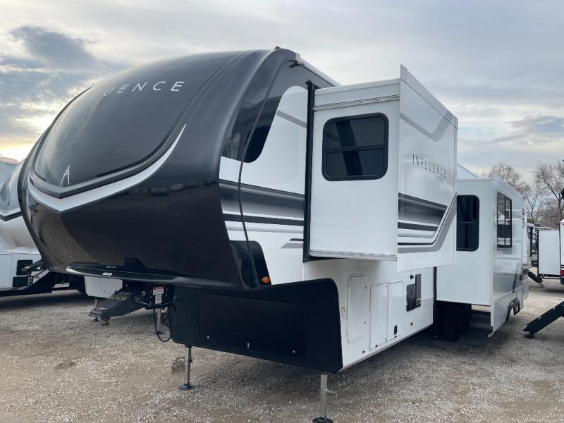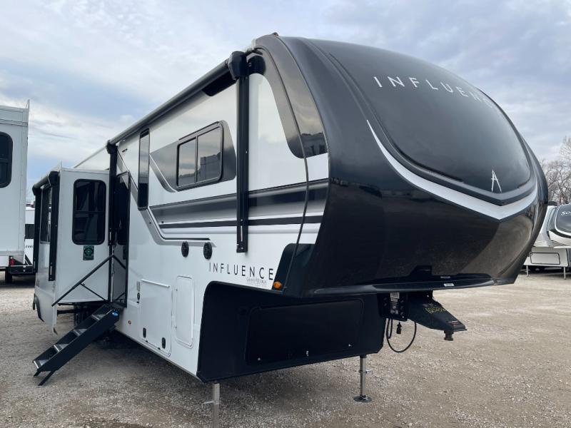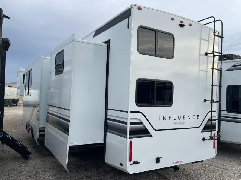 Any Grand Design Influence fifth wheel features five-sided aluminum cage construction with a walk-on roof and a fully enclosed underbelly with heated tanks and storage for all weather camping. For peace of mind, the MORryde CRE3000 Suspension system will provide safe and smooth towing, and the 101" widebody construction offers all the room you need and that is before multiple slides are fully engaged. You will appreciate the Keyed-Alike locks, slam-latch baggage doors with magnetic door catches, exterior security light, and SolidStep entry steps. On the inside, Congoleum flooring, premium roller shades for privacy, a hallway handrail for safety, and nightstands with USB ports to keep all of your electronics fully charged. You will also love the on demand tankless water heater when showering, plus the added heat and ambiance from an electric fireplace, and so much more!