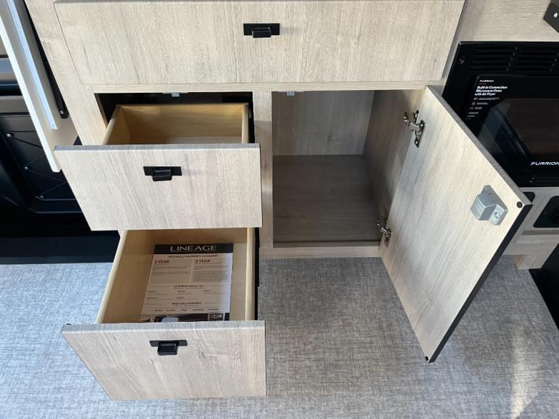 The private bedroom area provides a comfortable sleeping space with a premium mattress, ample storage, and thoughtful touches designed for restful nights. Between the bedroom, the convertible living area, and additional sleeping options, the Lineage Series M 25TK offers flexible space for couples or guests.