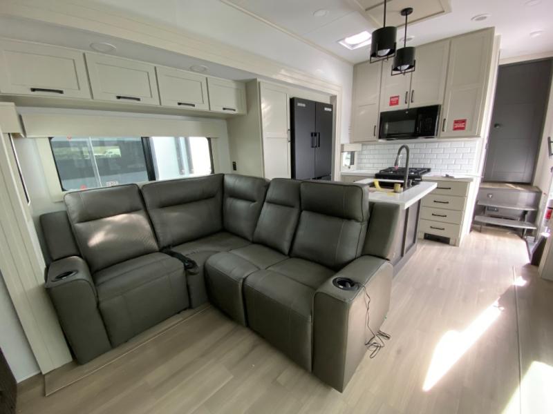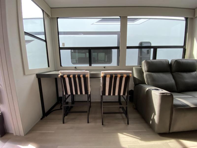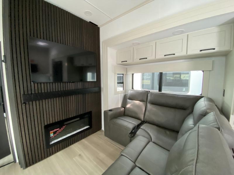 You want a toy hauler to carry your toys to the trails, and include many at-home comforts, and that's just what this unit delivers. A 14' separate garage includes an adjustable tie-down system, flip-up pet dish, a half bath, plus washer and dryer prep. There is an overhead loft bed and an L-shaped sofa with recline in the main living area that offers sleeping space as well. Everyone can watch a movie on the LED TV with a fireplace below while sitting on the sofa, in the theatre seats, or while at the hybrid desk/dinette. You will love the shower with seat in the full bathroom with two space savings sliding doors that lead into the hallway, and into the front bedroom where you will have a queen bed slide out, a wardrobe with washer and dryer prep, and TV prep if you want the option to watch movies in bed!