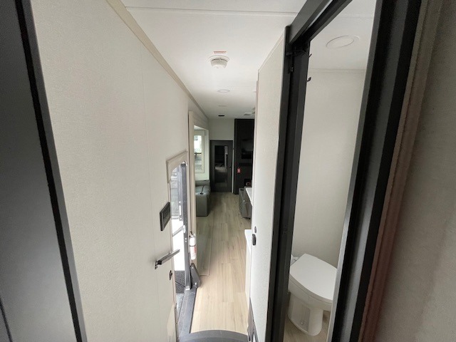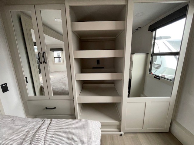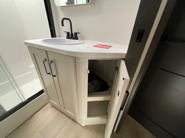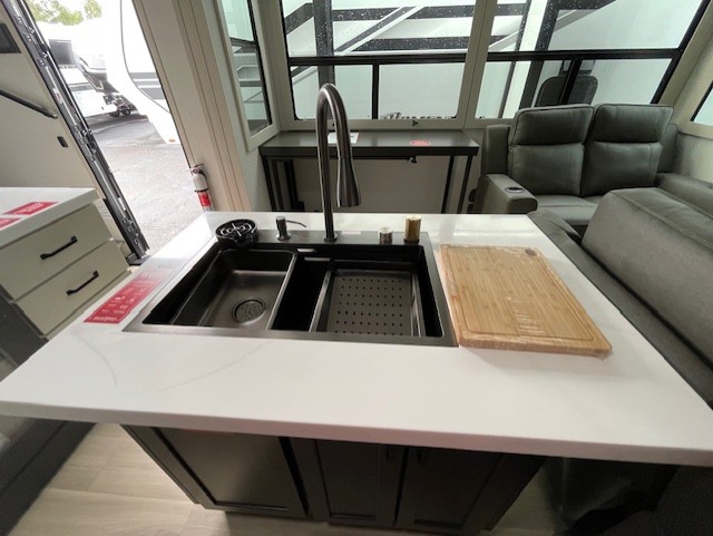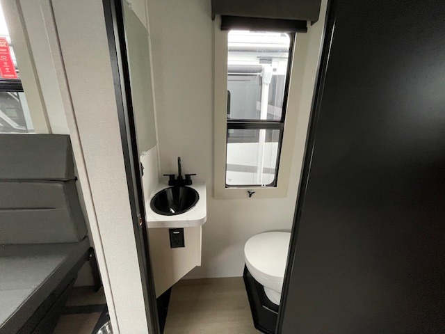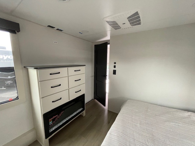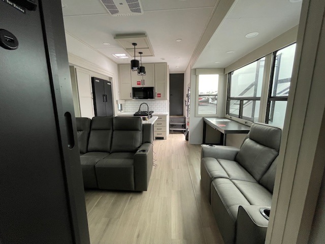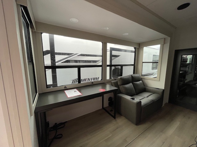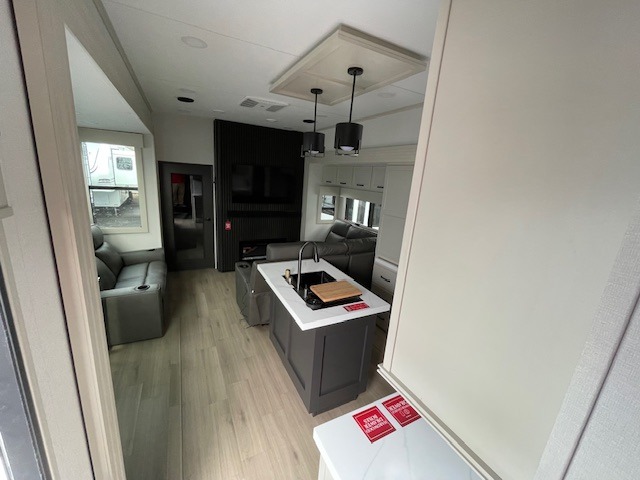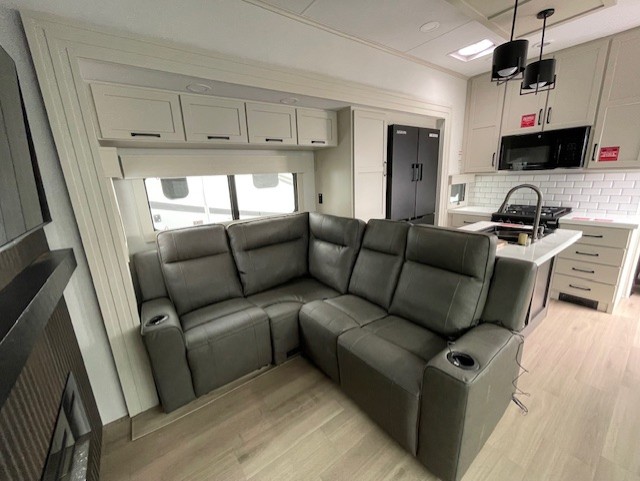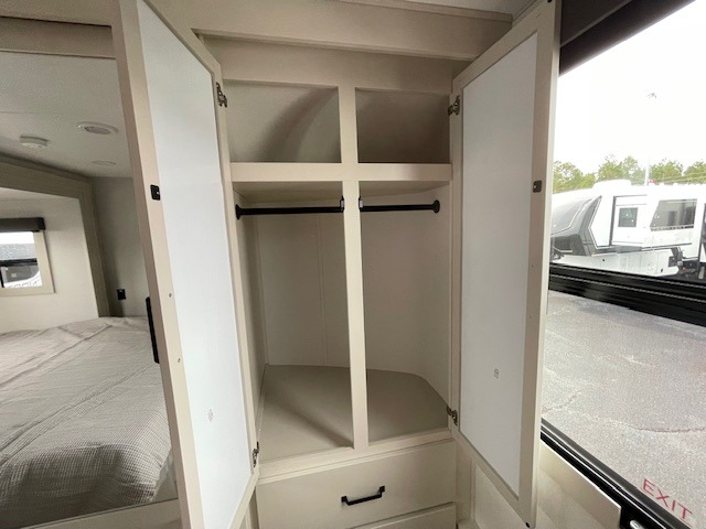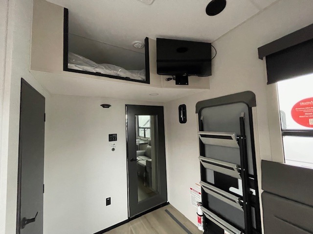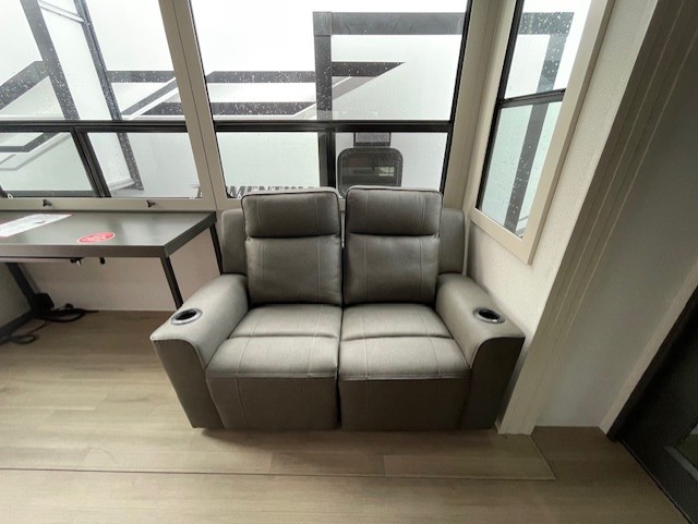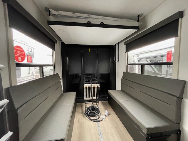 You want a toy hauler to carry your toys to the trails, and include many at-home comforts, and that's just what this unit delivers. A 14' separate garage includes an adjustable tie-down system, flip-up pet dish, a half bath, plus washer and dryer prep. There is an overhead loft bed and an L-shaped sofa with recline in the main living area that offers sleeping space as well. Everyone can watch a movie on the LED TV with a fireplace below while sitting on the sofa, in the theatre seats, or while at the hybrid desk/dinette. You will love the shower with seat in the full bathroom with two space savings sliding doors that lead into the hallway, and into the front bedroom where you will have a queen bed slide out, a wardrobe with washer and dryer prep, and TV prep if you want the option to watch movies in bed!