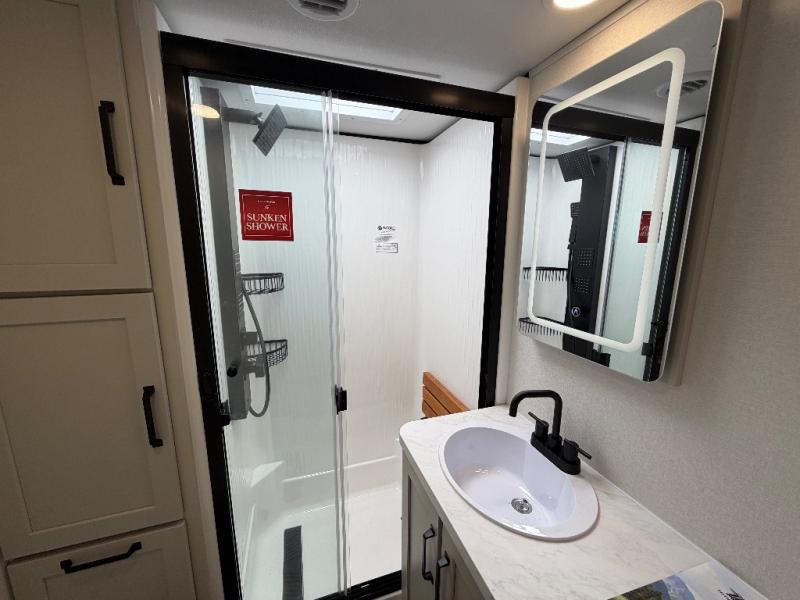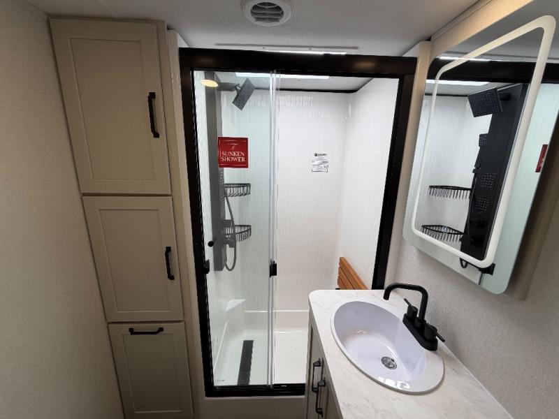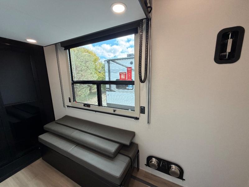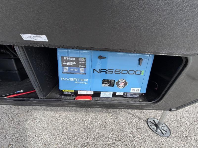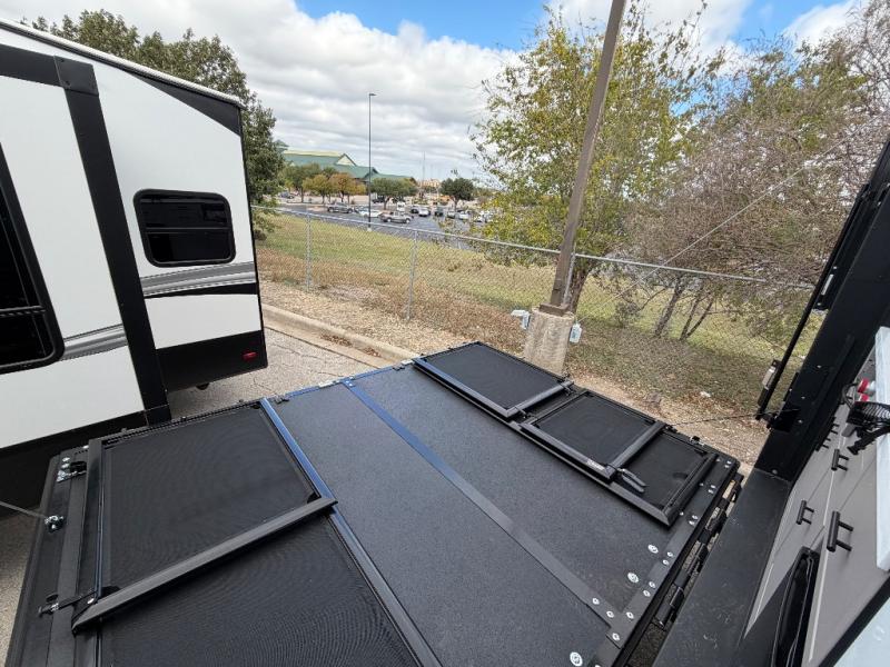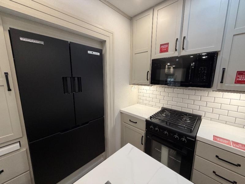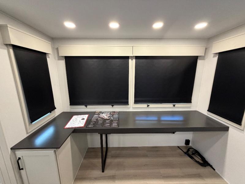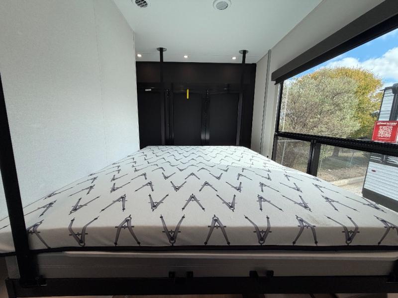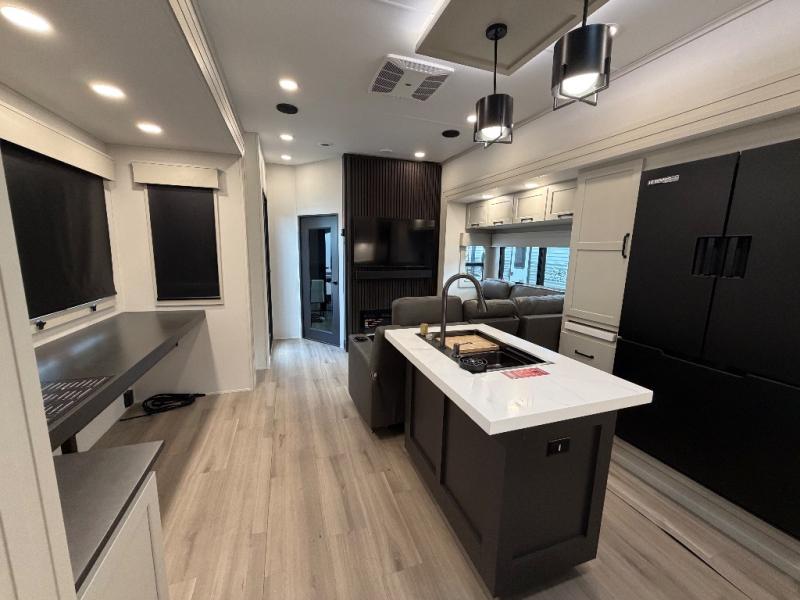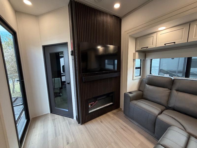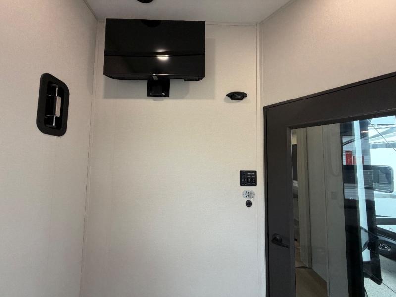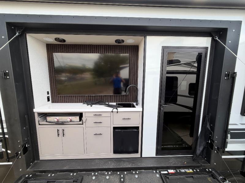 This toy hauler has all the comfort and convenience you could ask for! Once you have unloaded your toys from the 12' 6" separate garage, you can start lunch on the exterior griddle located by the side patio. There is also a 65" TV here and a 1.7 cu. ft. refrigerator to entertain guests! And if you have guests staying over, you can choose to add the optional Liftsuite system with underside can lights in the garage. If the weather isn't cooperating, you can make meals in the fully equipped interior kitchen, complete with an island, pantry, pull-out countertop extension and more. An L-shaped sofa with recliners is in perfect view of the 50" TV and fireplace, and there is even a hybrid desk/dinette with windows where you can get some work done if needed. Head towards the front to freshen up in the full bath before heading to bed in the private bedroom. Here, you'll find a queen bed slide out with an optional king bed, a large closet with washer and dryer prep, plus a dresser with TV prep if you want the option to watch movies in bed!