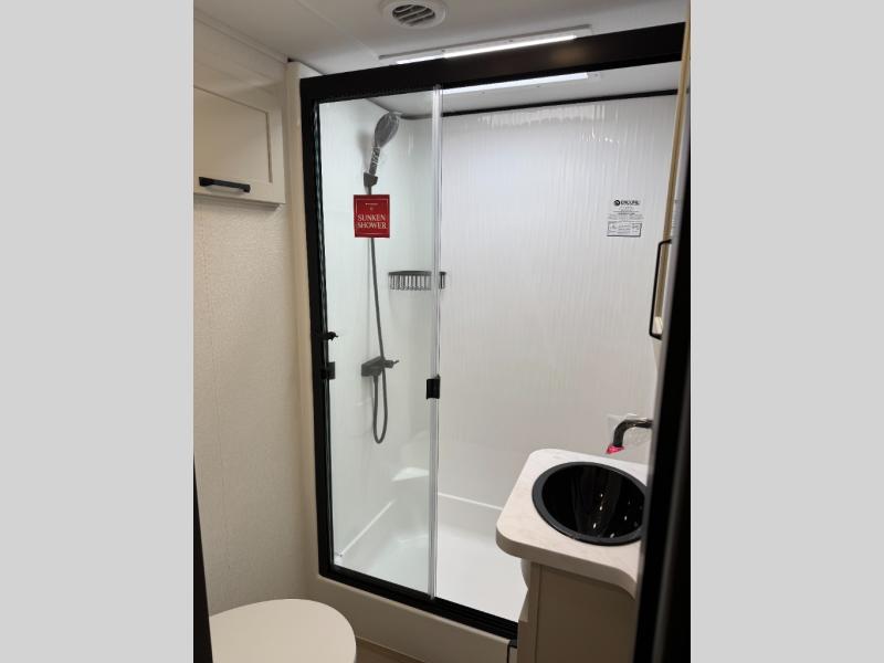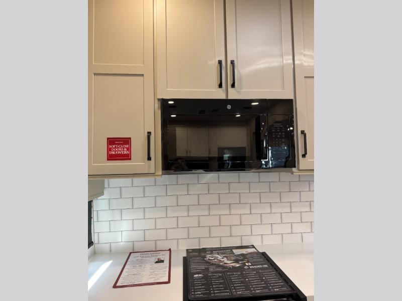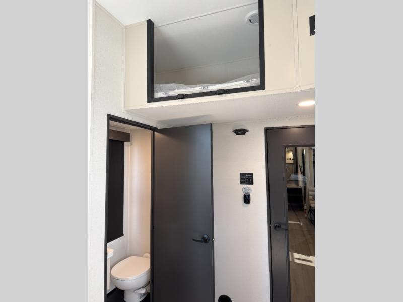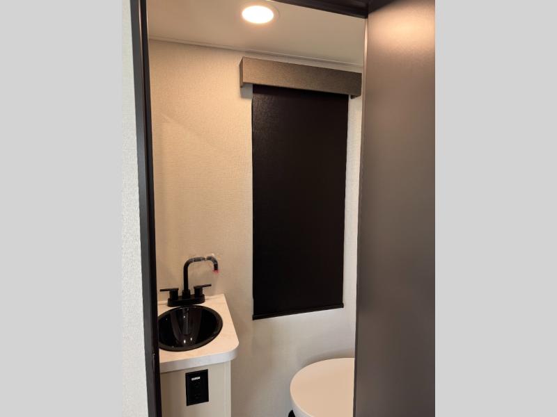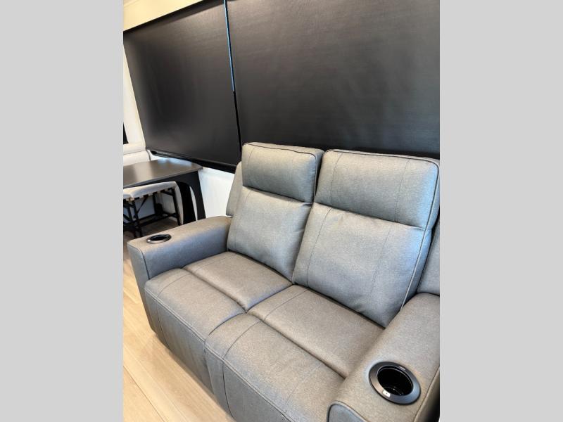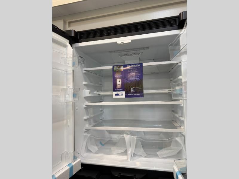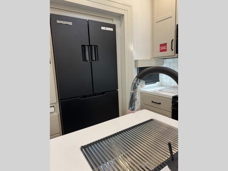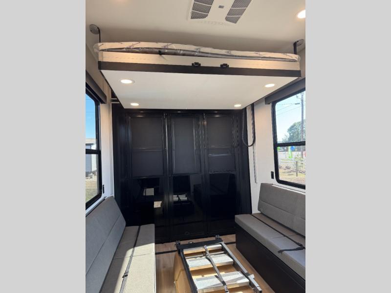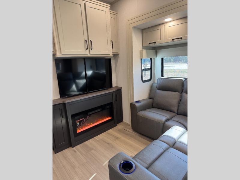 A 15' separate garage in this toy hauler offers plenty of space for your off-road toys! You will appreciate the convenience of having a full bathroom with a walk-in shower and there is washer and dryer prep so you can accommodate these appliances. You will also appreciate the two entry doors, and flip-up pet dish. The rear ramp door can even be converted into a patio, plus there are exterior speakers to keep the party going. Everyone will love hanging out in the separate living area with a fireplace at the entertainment center, theater seating, and a sectional sofa. The fully equipped kitchen has everything you need to prepare delicious home cooked meals. The front private bedroom offers an escape to rest and relax on a queen bed for the next ride!