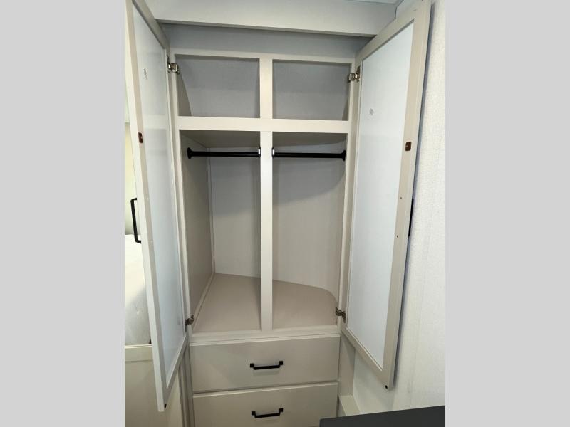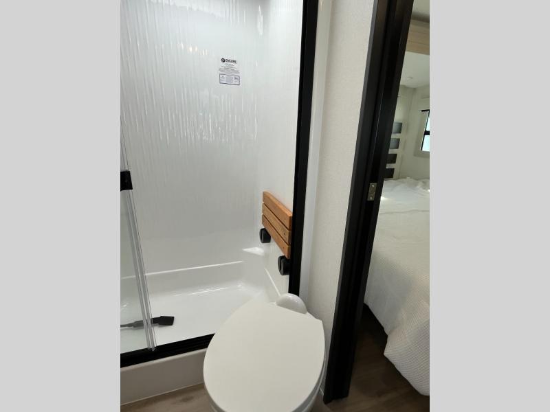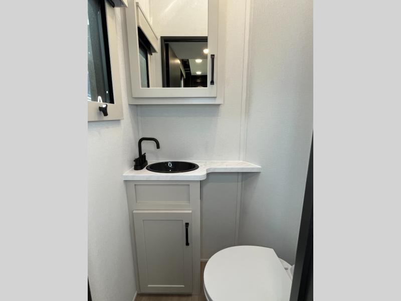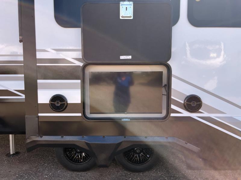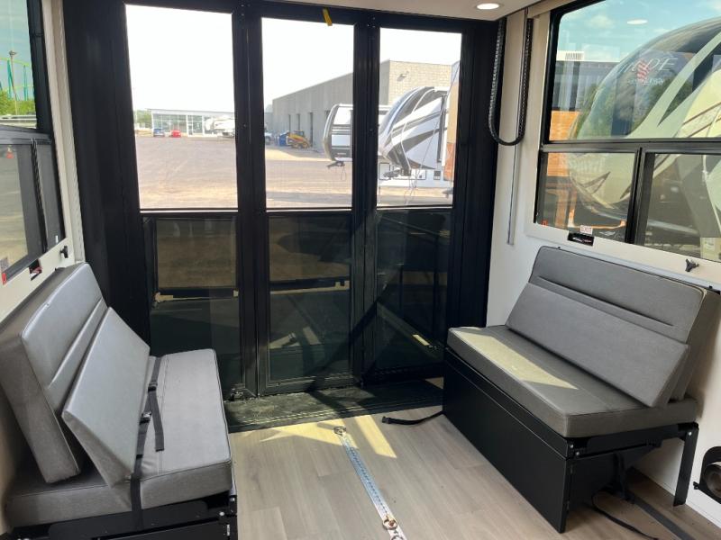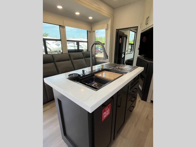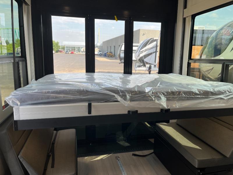 Traveling with friends and family can be comfortable when you have a full double entry bathroom and a half bath available when camping and enjoying the trails on your off-road toys! You will have an 11' garage space that can become a second living/dining area, and you can add the optional Liftsuite System for more sleeping space. An overhead bed comes standard, along with a super sofa in the main living area where guests can sleep. Everyone can watch the LED TV when waiting for dinner, and enjoy the fireplace on those chiller nights. The kitchen island offers a sink to wash dishes, extra counter space for serving meals and two stools to dine at. The cook will love all the upgraded appliances, and the space thanks to the slide. The front bedroom gives you a queen bed slide with a king bed option, lots of clothing space, and a slide top dresser for even more storage.