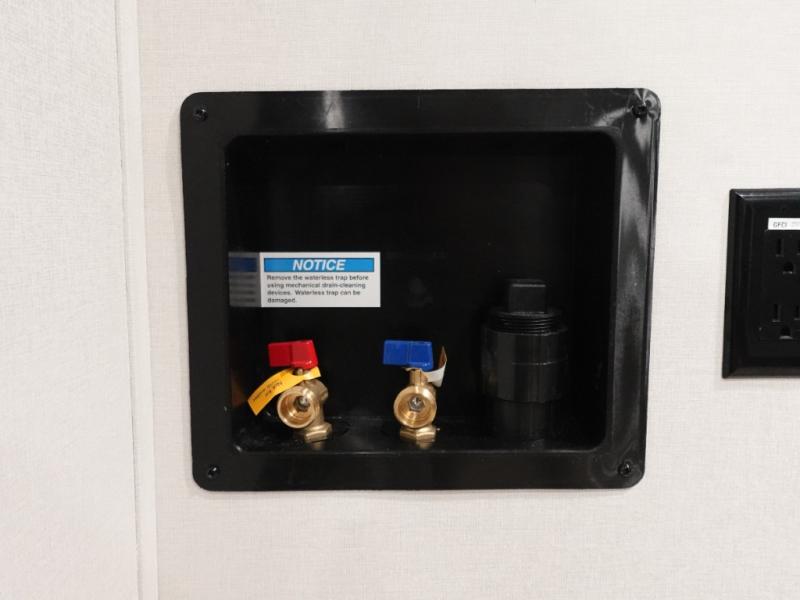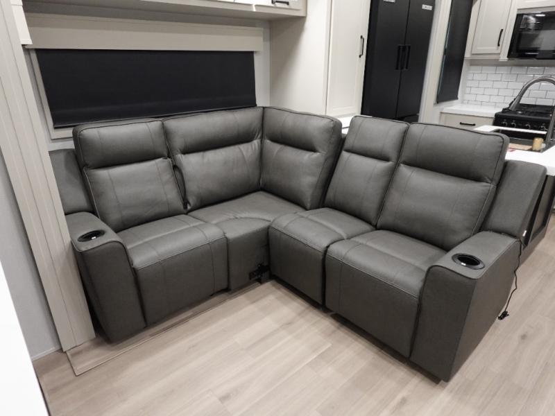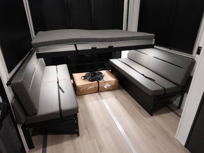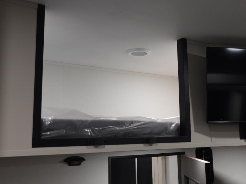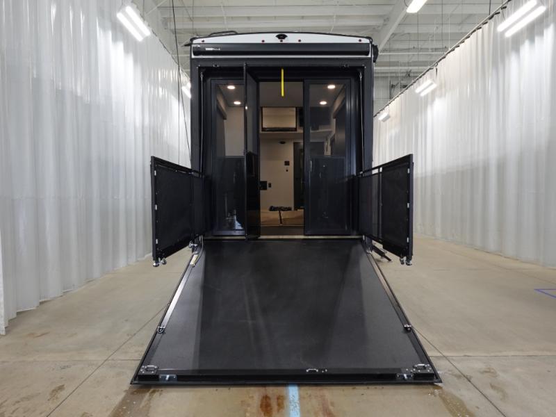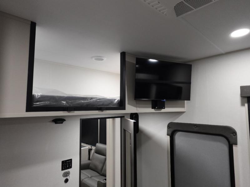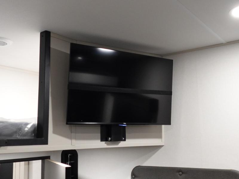 You want a toy hauler to carry your toys to the trails, and include many at-home comforts, and that's just what this unit delivers. A 14' separate garage includes an adjustable tie-down system. There is an overhead loft bed and an L-shaped sofa with recline in the main living area that offers sleeping space as well. Everyone can watch a movie on the LED TV with a fireplace below while sitting on the sofa, in the theatre seats, or while at the free standing dinette with four chairs. The chef will have upgraded appliances to make meals for everyone, an L-shaped countertop with a kitchen sink, and a USB charging outlet. You will love the shower with seat in the full bathroom with two space savings sliding doors that lead into the hallway, and into the front bedroom where you will have a walk-around queen bed, a slide out wardrobe and more USB charging outlets.