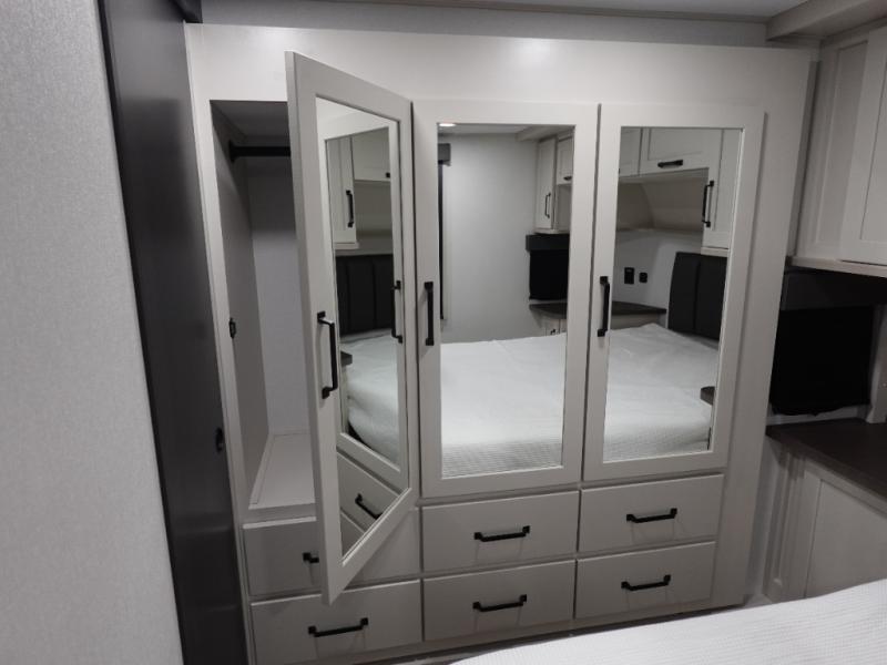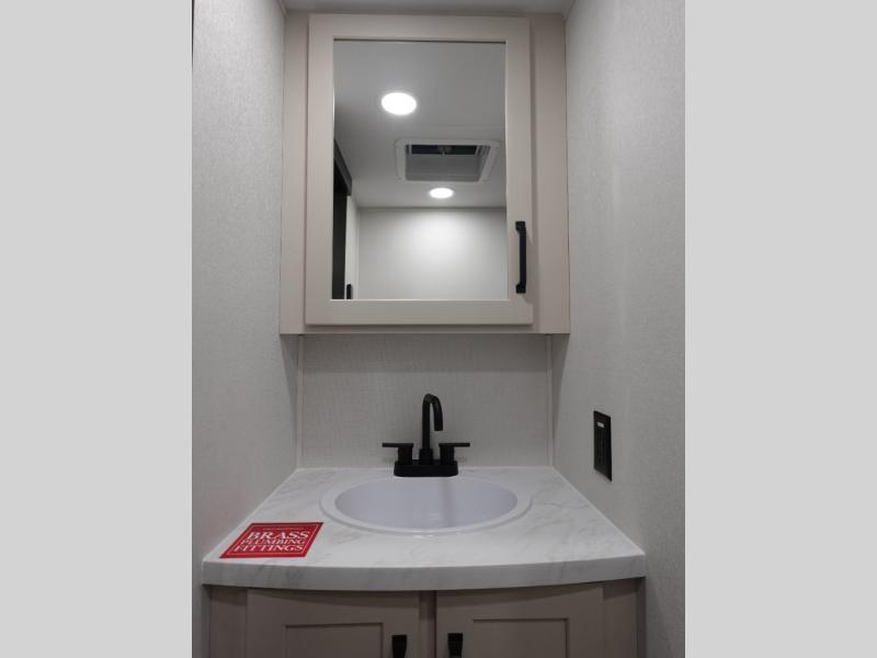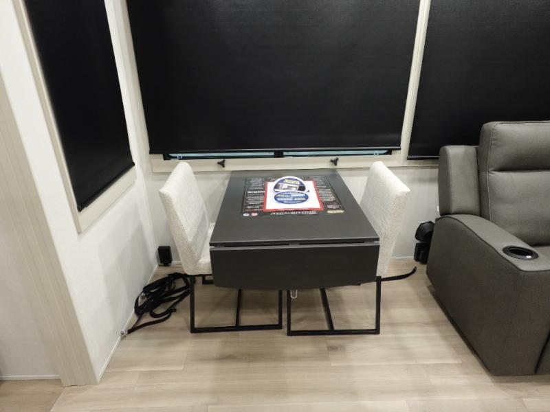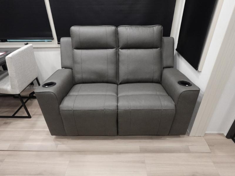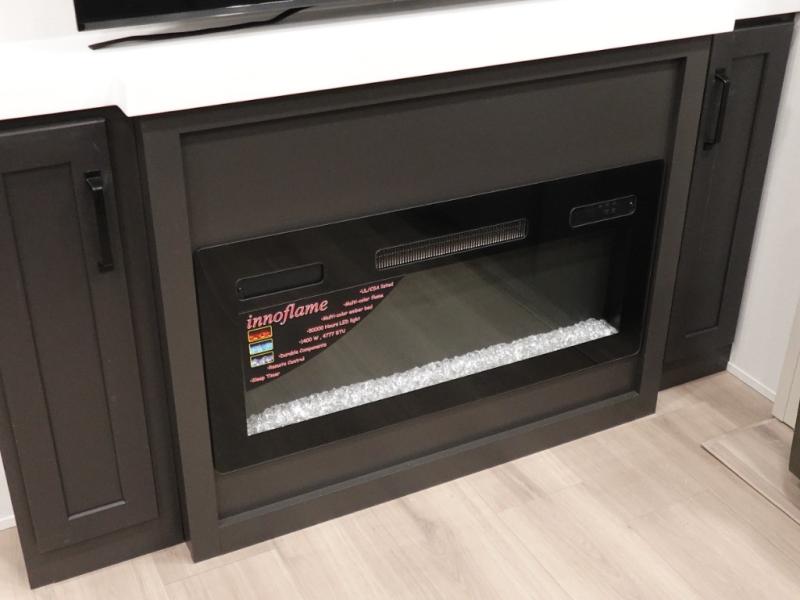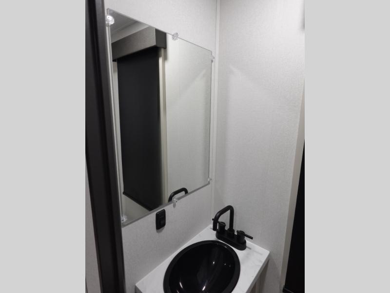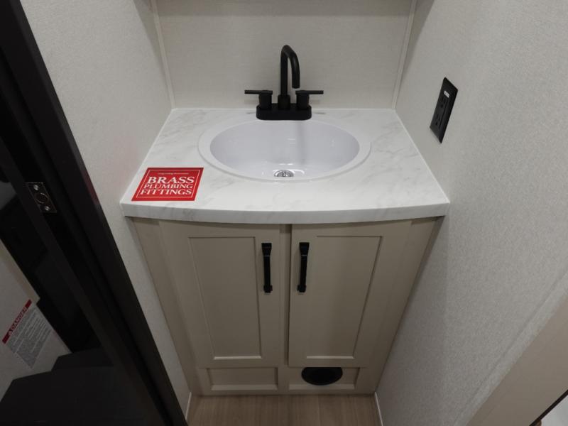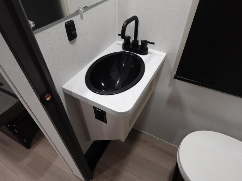 You want a toy hauler to carry your toys to the trails, and include many at-home comforts, and that's just what this unit delivers. A 14' separate garage includes an adjustable tie-down system. There is an overhead loft bed and an L-shaped sofa with recline in the main living area that offers sleeping space as well. Everyone can watch a movie on the LED TV with a fireplace below while sitting on the sofa, in the theatre seats, or while at the free standing dinette with four chairs. The chef will have upgraded appliances to make meals for everyone, an L-shaped countertop with a kitchen sink, and a USB charging outlet. You will love the shower with seat in the full bathroom with two space savings sliding doors that lead into the hallway, and into the front bedroom where you will have a walk-around queen bed, a slide out wardrobe and more USB charging outlets.