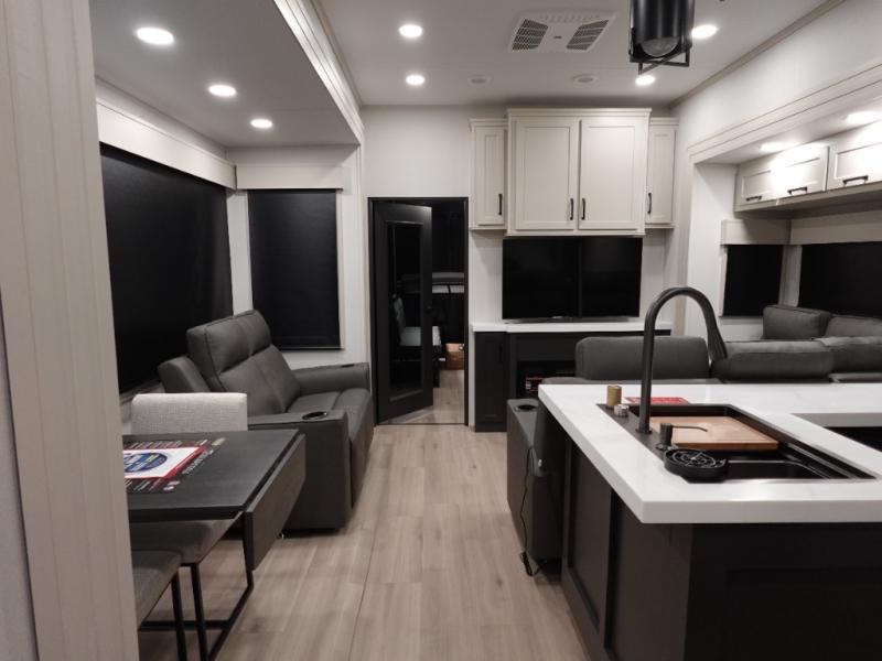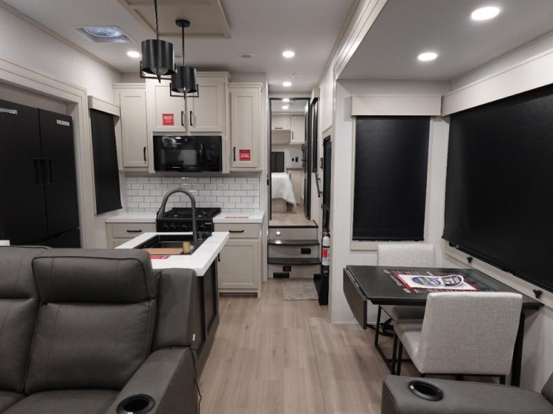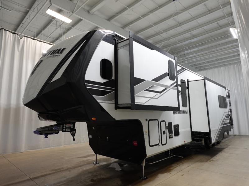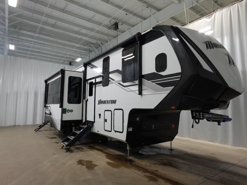 With any Momentum M-Class toy hauler by Grand Design, you will enjoy luxury at every turn! They have been constructed to a superior standard with a thermal roof design, triple insulated main floor and garage floor, and a Rail-Tite underbelly seal that will allow you to camp in all elements. Each model also features an 8' 5" wide body chassis with a wide rail design, no wheel wheels, and a dovetail entry for easier loading. The Stealth A/C system provides maximum cooling power, and the CRE3000 suspension system means you can enjoy a smooth tow each time. You will love the luxurious interior with a professional grade stainless steel cooktop, interior color changing LED accent lighting, a fiberglass shower with a glass door, and solid surface countertops.