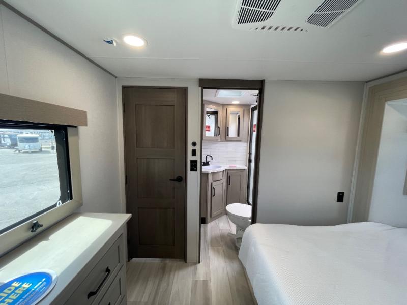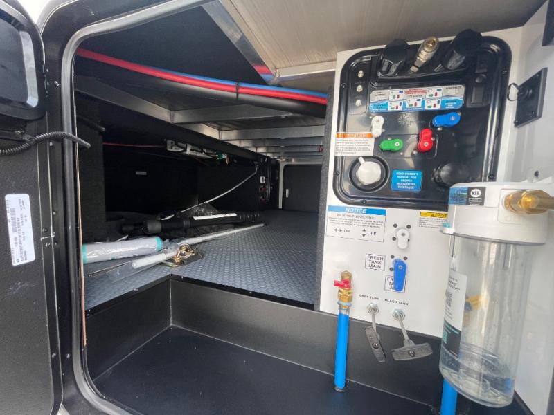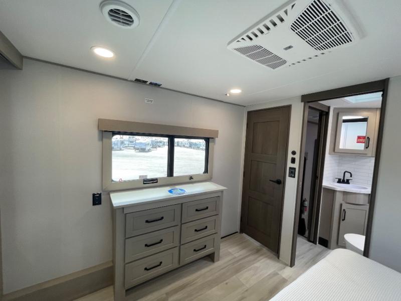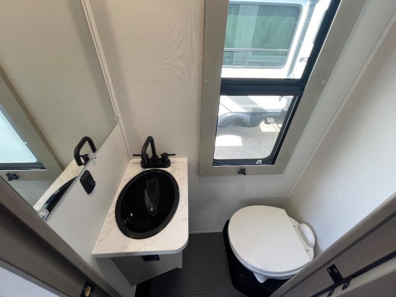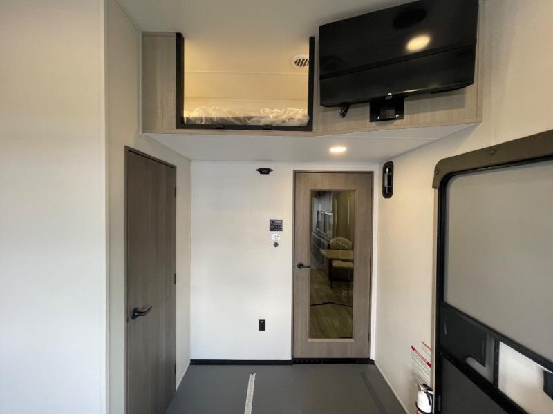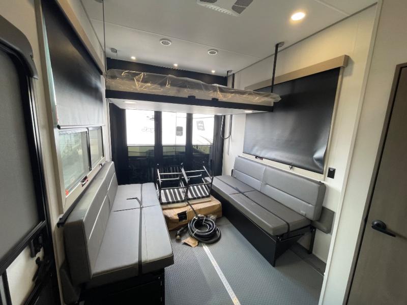Any time spent in this spacious toy hauler will be time well spent! The 14' garage includes an overhead loft bed and a flip-up pet dish for your furry friends. If you're needing more sleeping space, you might want to choose the optional Liftsuite System and optional half bath. Once you enter in the main living area, you can relax on the L-shaped sofa with recline across from the fireplace, and there is a free-standing dinette if you want to play a game or two. The chef of your group will love the generous counter space in the kitchen, and the dual entry bath will let everyone stay clean throughout your trip! Head to the front master bedroom to enjoy the queen bed slide out with an optional king bed, a slide top dresser with TV prep, plus a large front closet, complete with washer and dryer prep!