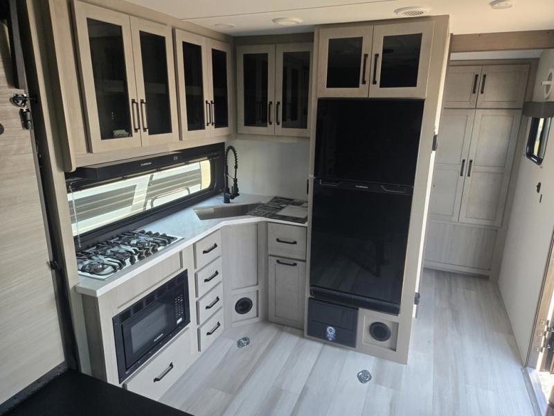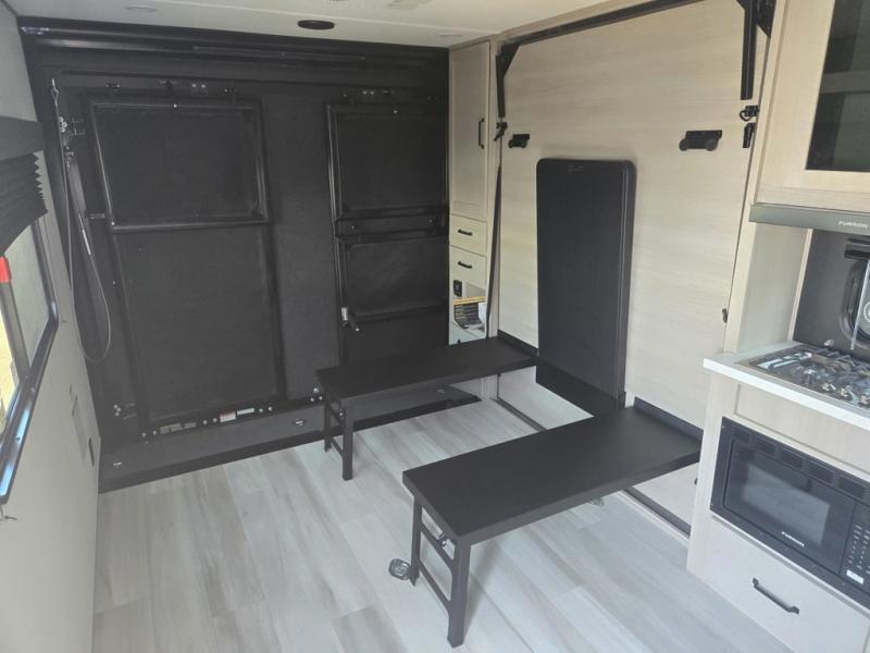 Get ready to take your adventures to the next level with this amazing toy Hauler. A spacious interior features a queen-sized murphy bed, perfect for relaxing after a long day of exploring. A convenient microwave and three-burner cooktop offer endless culinary possibilities, while a 12V 8cu. refrigerator keeps your essentials at the perfect temperature. Ample overhead cabinets provide additional storage for gear, cookware, and more. At the front of this toy hauler, a full bathroom with a closet provides a private retreat, and the ramp door/patio offers easy access to your toys and outdoor living space. Plus, a 13' awning offers shade and protection from the elements.