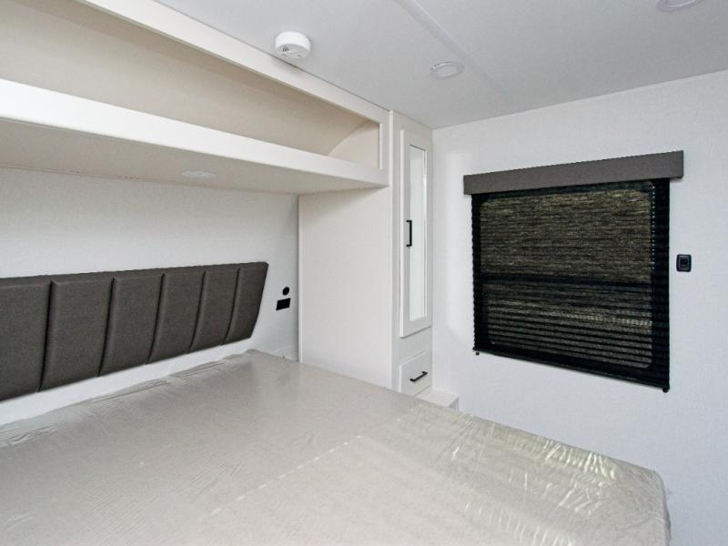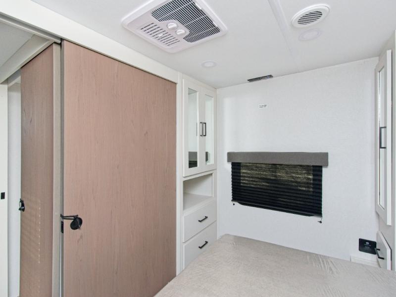 The front bedroom offers a roomy queen bed with space to walk around, a sliding solid door for privacy, dual nightstands, overhead cabinets, and a combination wardrobe with drawers and hanging storage—perfect for keeping your gear organized.